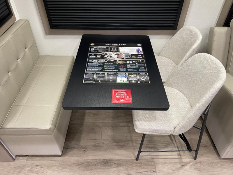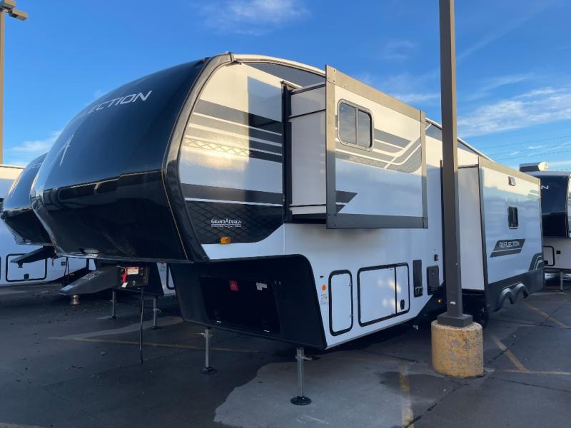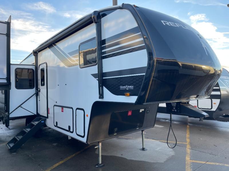 With any Reflection fifth wheel by Grand Design, you will have a solar panel for off-grid camping and a 60 amp charge controller and inverter prep, a Universal All-In-One docking station, unobstructed pass-through storage, and Goodyear Endurance tires. Each is constructed of gel coat exterior sidewalls, residential 5" truss rafters, walk-on roof decking, a fiberglass and radiant foil roof and front cap insulation plus laminated aluminum framed side walls, roof and end walls in slide rooms. Head inside to enjoy residential hardwood cabinet doors, premium Congoleum flooring, a spacious shower with a glass door, and many more comforts!