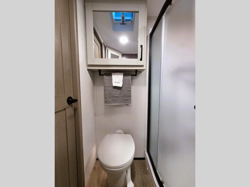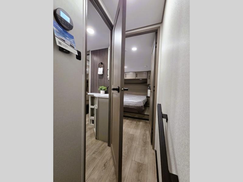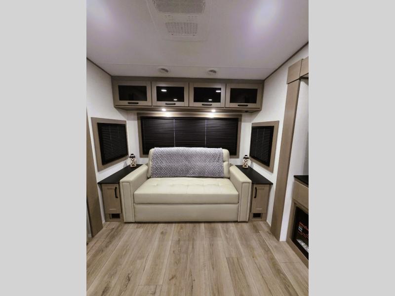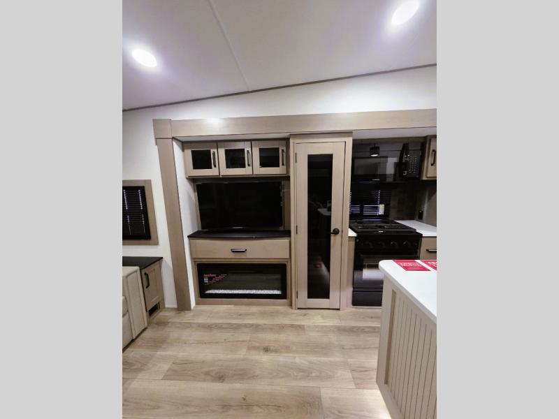 Whether you travel for pleasure or work, you will love the spacious main living and kitchen area with a rear tri-fold sofa that doubles as extra sleeping space, and the theater seating directly across from the entertainment center with a 40" LED HDTV and a fireplace below. The kitchen island will make meal prepping and drying the dishes easier and the hutch is the perfect place to place your picture frames, nice dishes, and extra cooking items. There is even a pantry that is big enough to store all of your favorite snacks, dry ingredients and such. Outside you can enjoy two electric awnings that provide protection from the elements as you relax and visit with other RVers, and your camping chairs can easily be stored in the pass-through compartment. The double entry bathroom is convenient especially at night when you can slide the door to enter from the front master bedroom. You will find plenty of storage for your clothing and gear, plus the bedroom slide out gives you drawers and linen storage that stretches into the full bathroom.