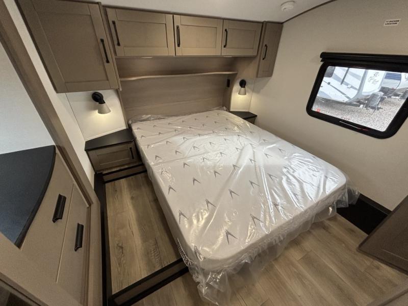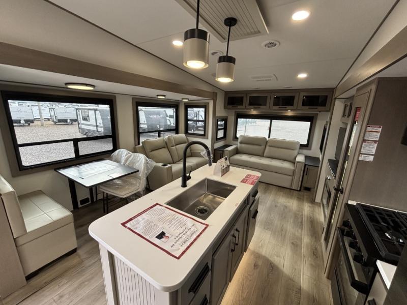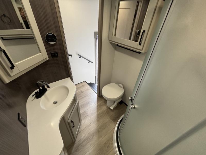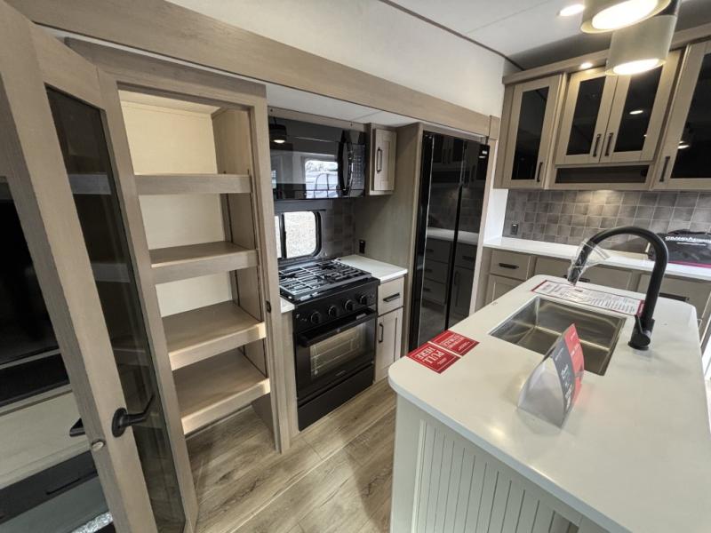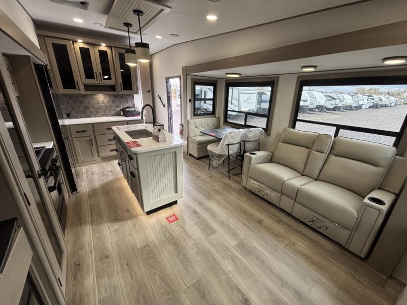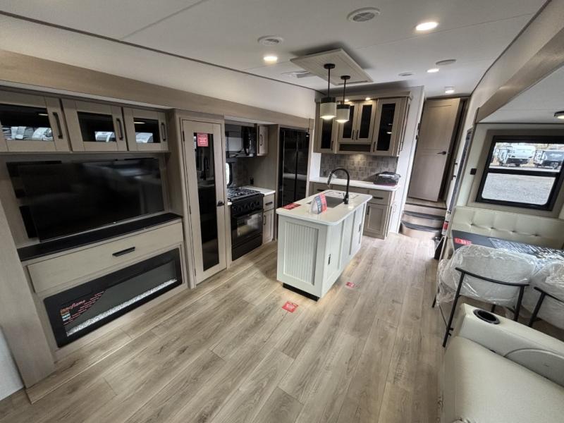 Whether you travel for pleasure or work, you will love the spacious main living and kitchen area with a rear tri-fold sofa that doubles as extra sleeping space, and the theater seating directly across from the entertainment center with a 40" LED HDTV and a fireplace below. The kitchen island will make meal prepping and drying the dishes easier and the hutch is the perfect place to place your picture frames, nice dishes, and extra cooking items. There is even a pantry that is big enough to store all of your favorite snacks, dry ingredients and such. Outside you can enjoy two electric awnings that provide protection from the elements as you relax and visit with other RVers, and your camping chairs can easily be stored in the pass-through compartment. The double entry bathroom is convenient especially at night when you can slide the door to enter from the front master bedroom. You will find plenty of storage for your clothing and gear, plus the bedroom slide out gives you drawers and linen storage that stretches into the full bathroom.