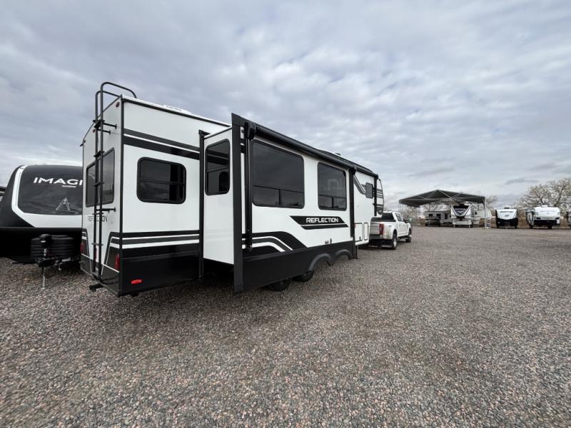 With any Reflection fifth wheel by Grand Design, you will have a solar panel for off-grid camping and a 60 amp charge controller and inverter prep, a Universal All-In-One docking station, unobstructed pass-through storage, and Goodyear Endurance tires. Each is constructed of gel coat exterior sidewalls, residential 5" truss rafters, walk-on roof decking, a fiberglass and radiant foil roof and front cap insulation plus laminated aluminum framed side walls, roof and end walls in slide rooms. Head inside to enjoy residential hardwood cabinet doors, premium Congoleum flooring, a spacious shower with a glass door, and many more comforts!