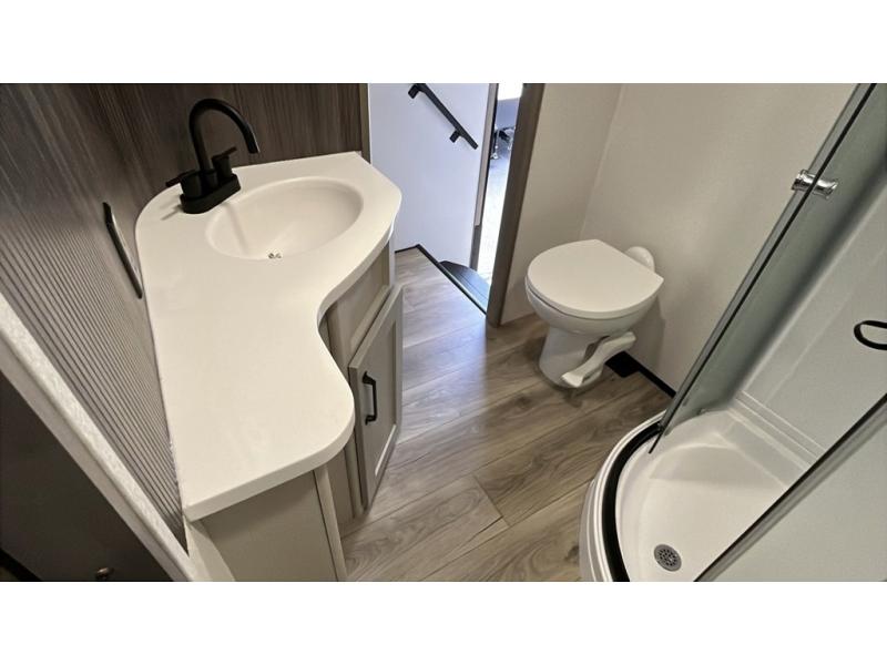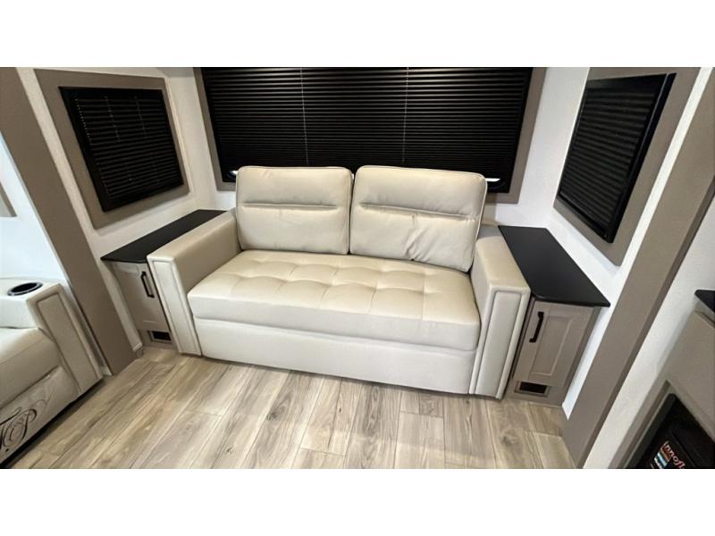 Whether you travel for pleasure or work, you will love the spacious main living and kitchen area with a rear tri-fold sofa that doubles as extra sleeping space, and the theater seating directly across from the entertainment center with a 40" LED HDTV and a fireplace below. The kitchen island will make meal prepping and drying the dishes easier and the hutch is the perfect place to place your picture frames, nice dishes, and extra cooking items. There is even a pantry that is big enough to store all of your favorite snacks, dry ingredients and such. Outside you can enjoy two electric awnings that provide protection from the elements as you relax and visit with other RVers, and your camping chairs can easily be stored in the pass-through compartment. The double entry bathroom is convenient especially at night when you can slide the door to enter from the front master bedroom. You will find plenty of storage for your clothing and gear, plus the bedroom slide out gives you drawers and linen storage that stretches into the full bathroom.