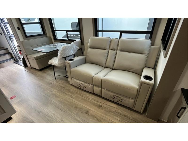 With any Reflection fifth wheel by Grand Design, you will have a solar panel for off-grid camping and a 60 amp charge controller and inverter prep, a Universal All-In-One docking station, unobstructed pass-through storage, and Goodyear Endurance tires. Each is constructed of gel coat exterior sidewalls, residential 5" truss rafters, walk-on roof decking, a fiberglass and radiant foil roof and front cap insulation plus laminated aluminum framed side walls, roof and end walls in slide rooms. Head inside to enjoy residential hardwood cabinet doors, premium Congoleum flooring, a spacious shower with a glass door, and many more comforts!