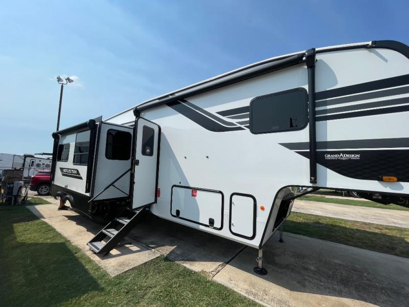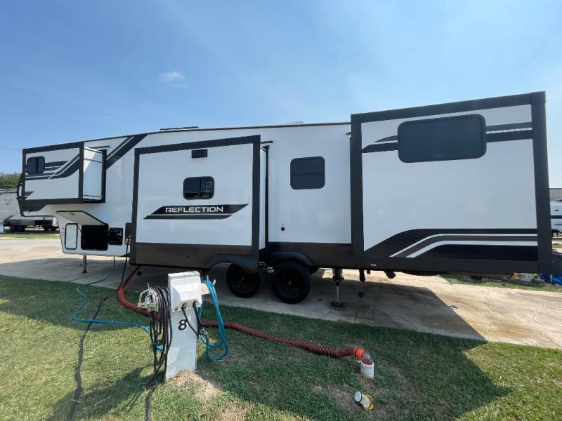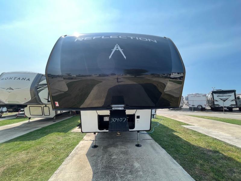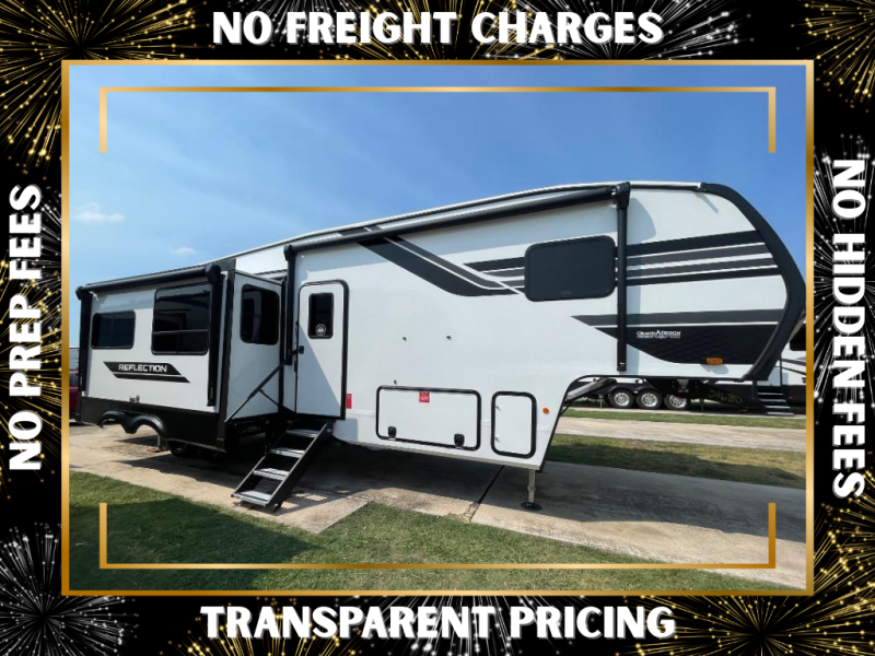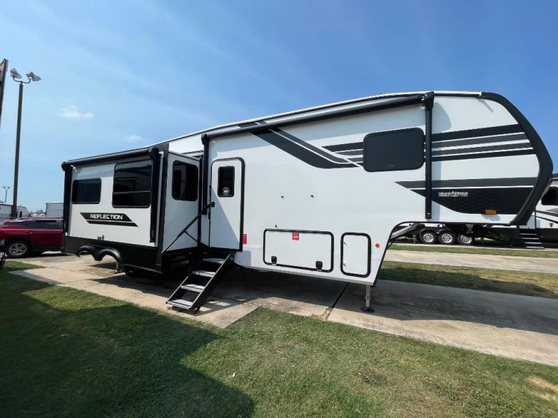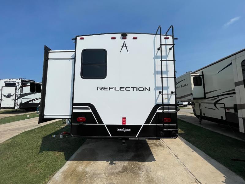 With any Reflection fifth wheel by Grand Design, you will have a solar panel for off-grid camping and a 60 amp charge controller and inverter prep, a Universal All-In-One docking station, unobstructed pass-through storage, and Goodyear Endurance tires. Each is constructed of gel coat exterior sidewalls, residential 5" truss rafters, walk-on roof decking, a fiberglass and radiant foil roof and front cap insulation plus laminated aluminum framed side walls, roof and end walls in slide rooms. Head inside to enjoy residential hardwood cabinet doors, premium Congoleum flooring, a spacious shower with a glass door, and many more comforts!