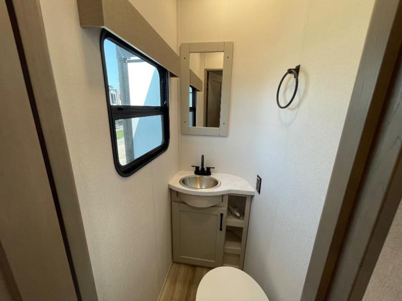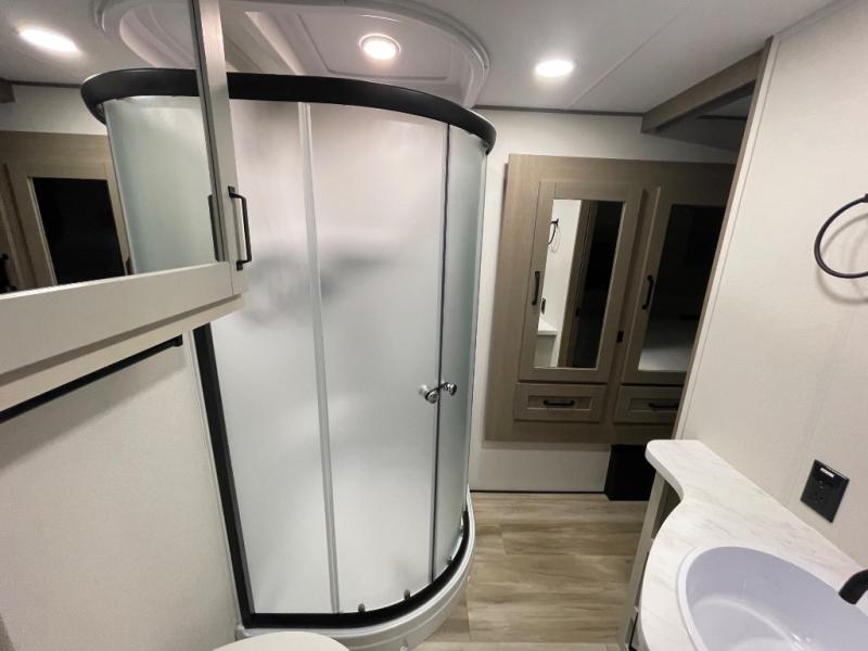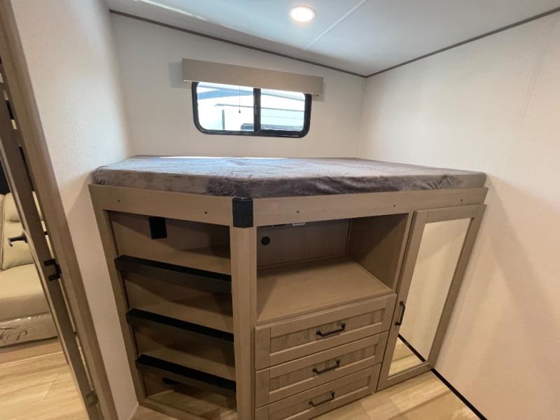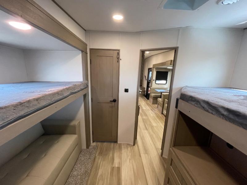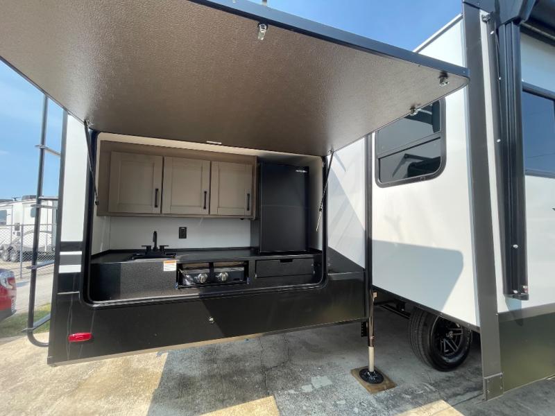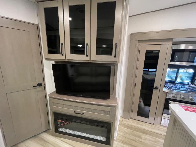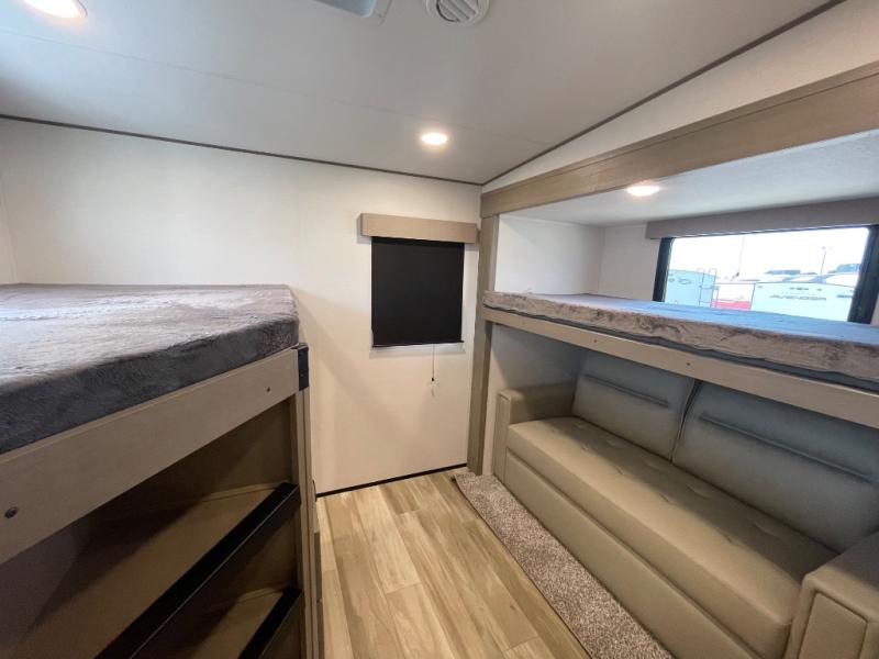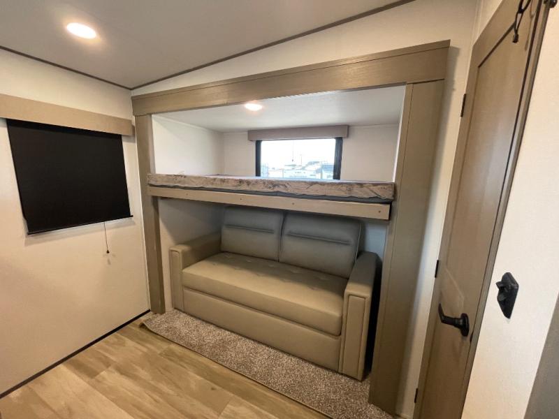 Are you looking to travel with your family and friends and want enough space for everyone to be comfortable? Step inside using the Step Above wit lift assist entry steps, to find a private bunkhouse in the rear of this fifth wheel which offers a slide out flip bunk above a tri-fold sofa, a 44" bunk bed with window and storage below, plus its very own private half bathroom. The theater seating or tri-fold sofa option is a great place to unwind at night in front of the entertainment center with a 40" LED HDTV and fireplace below it. There is a booth dinette or you can a swivel dinette option to dine at, and the kitchen island will provide more counter space to prep meals. You will find full amenities including a 16 cu. ft. 12V refrigerator and a hutch. This fifth wheel also includes a double entry bathroom with a radius shower, and you can wake up refreshed each morning after sleeping on your own queen bed.