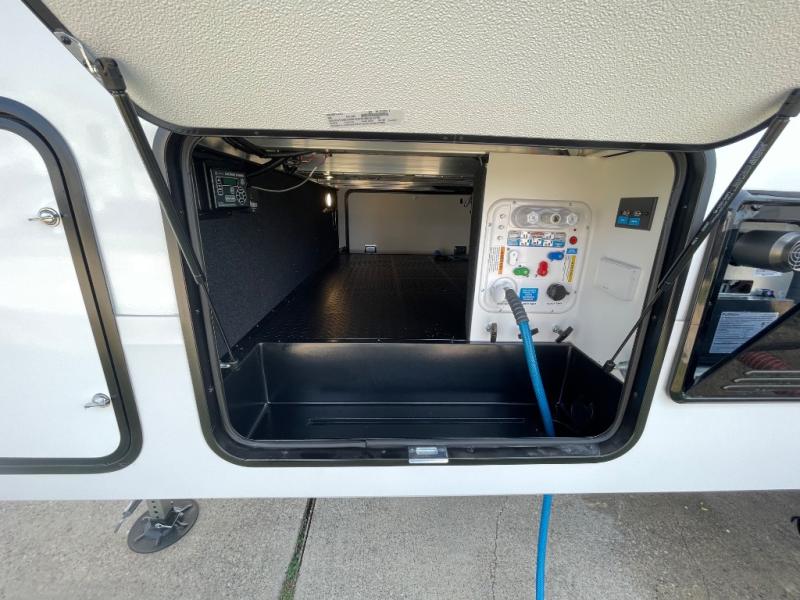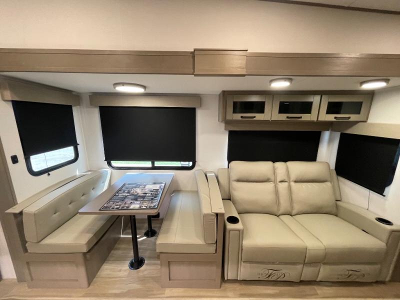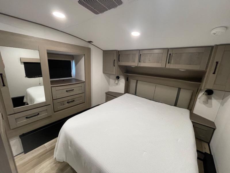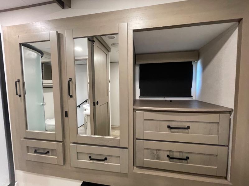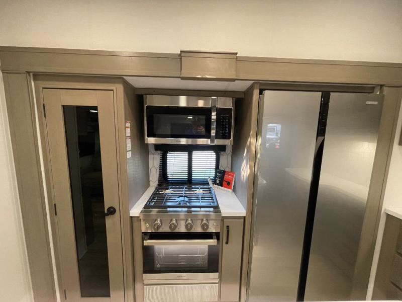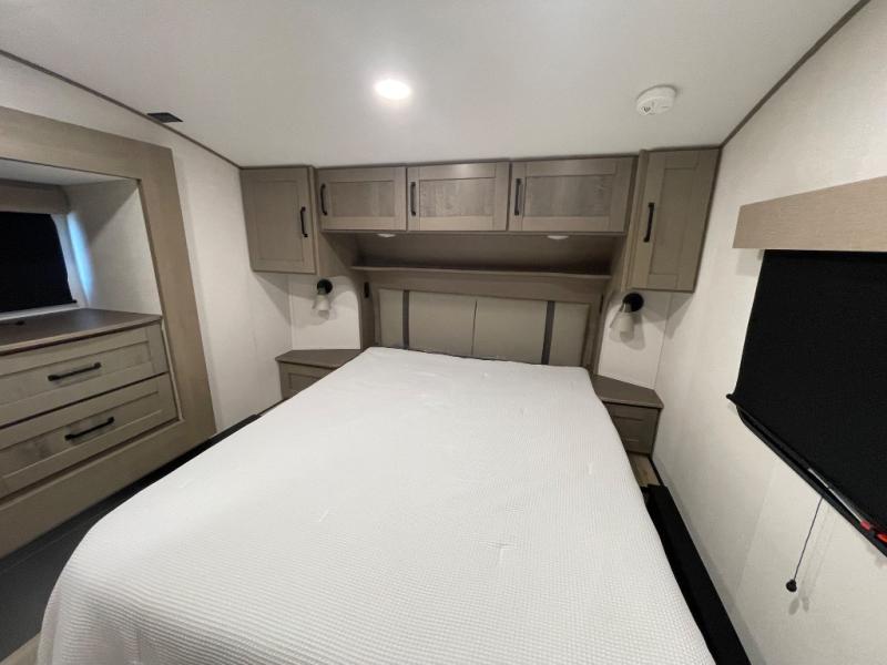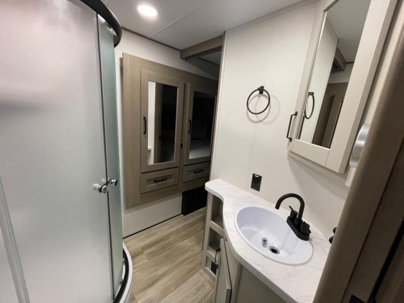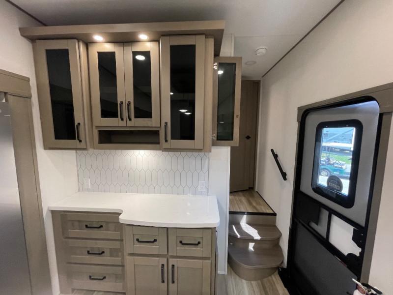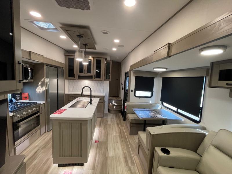 Are you looking to travel with your family and friends and want enough space for everyone to be comfortable? Step inside using the Step Above wit lift assist entry steps, to find a private bunkhouse in the rear of this fifth wheel which offers a slide out flip bunk above a tri-fold sofa, a 44" bunk bed with window and storage below, plus its very own private half bathroom. The theater seating or tri-fold sofa option is a great place to unwind at night in front of the entertainment center with a 40" LED HDTV and fireplace below it. There is a booth dinette or you can a swivel dinette option to dine at, and the kitchen island will provide more counter space to prep meals. You will find full amenities including a 16 cu. ft. 12V refrigerator and a hutch. This fifth wheel also includes a double entry bathroom with a radius shower, and you can wake up refreshed each morning after sleeping on your own queen bed.