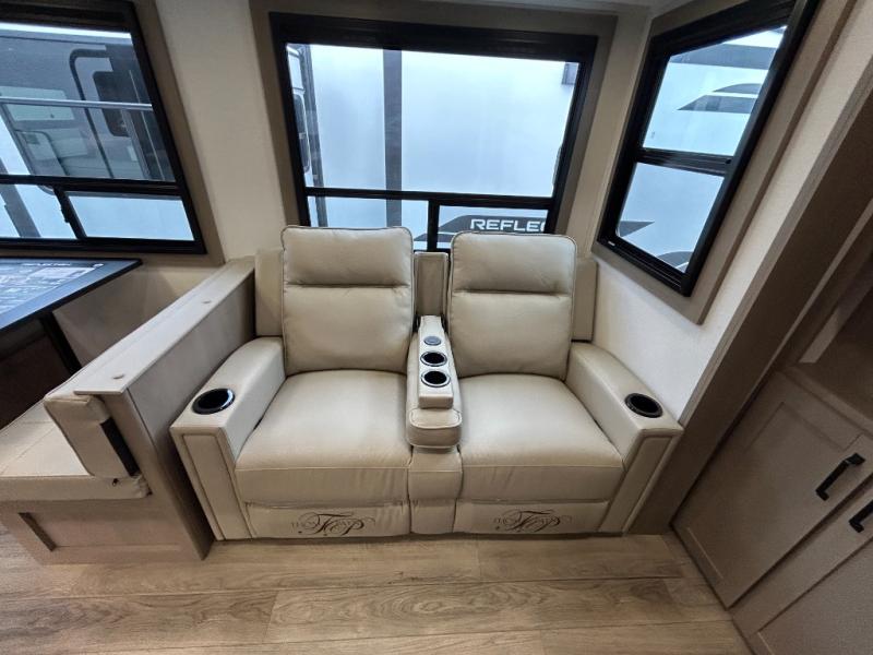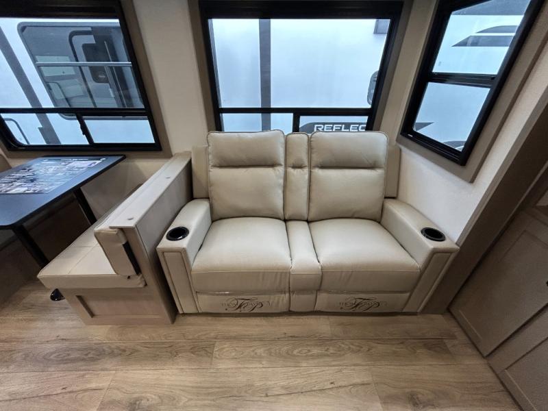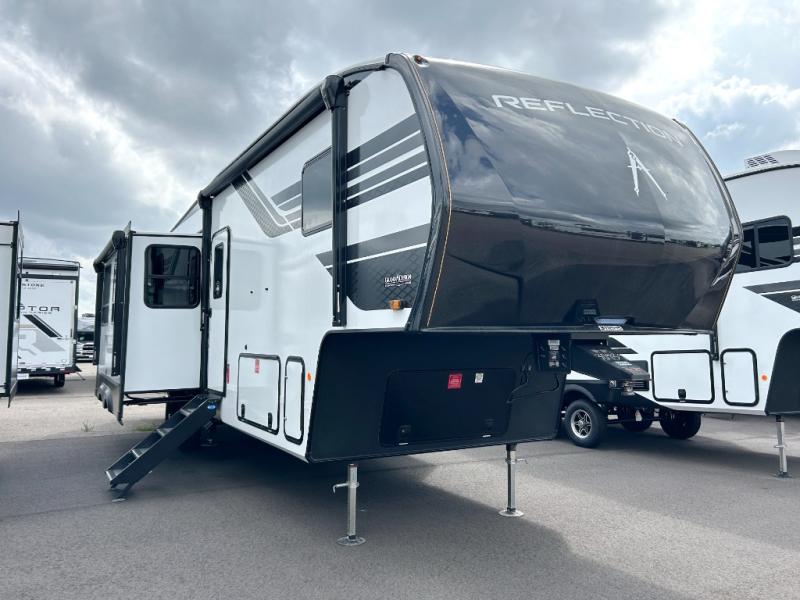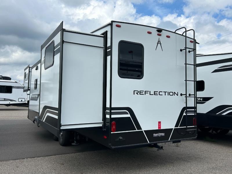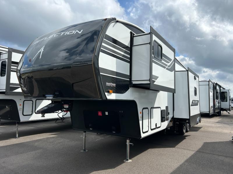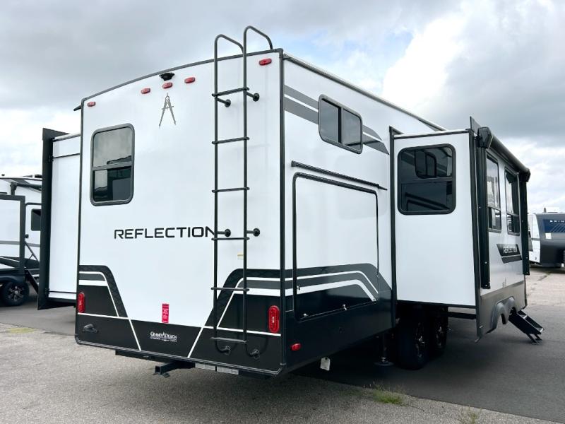 With any Reflection fifth wheel by Grand Design, you will have a solar panel for off-grid camping and a 60 amp charge controller and inverter prep, a Universal All-In-One docking station, unobstructed pass-through storage, and Goodyear Endurance tires. Each is constructed of gel coat exterior sidewalls, residential 5" truss rafters, walk-on roof decking, a fiberglass and radiant foil roof and front cap insulation plus laminated aluminum framed side walls, roof and end walls in slide rooms. Head inside to enjoy residential hardwood cabinet doors, premium Congoleum flooring, a spacious shower with a glass door, and many more comforts!
