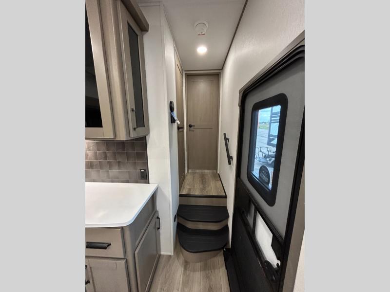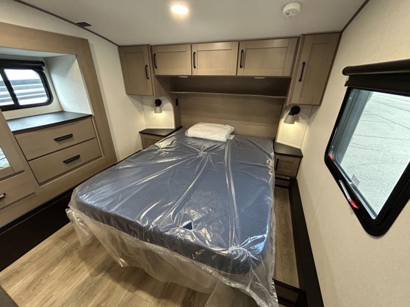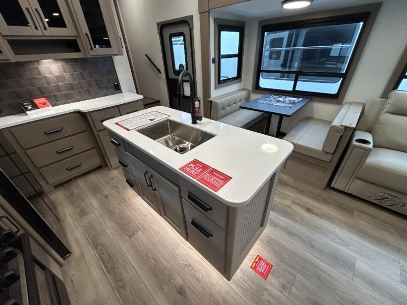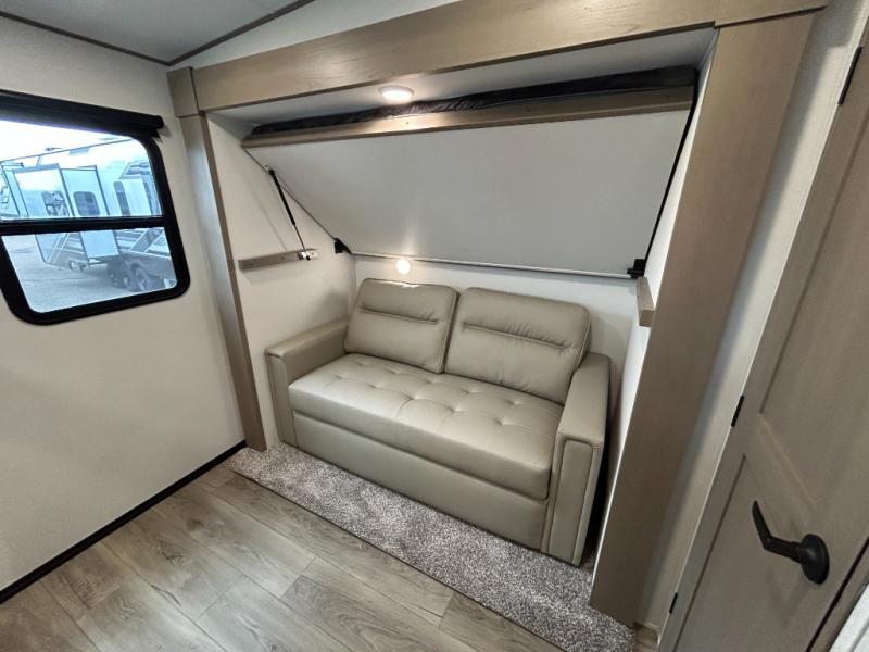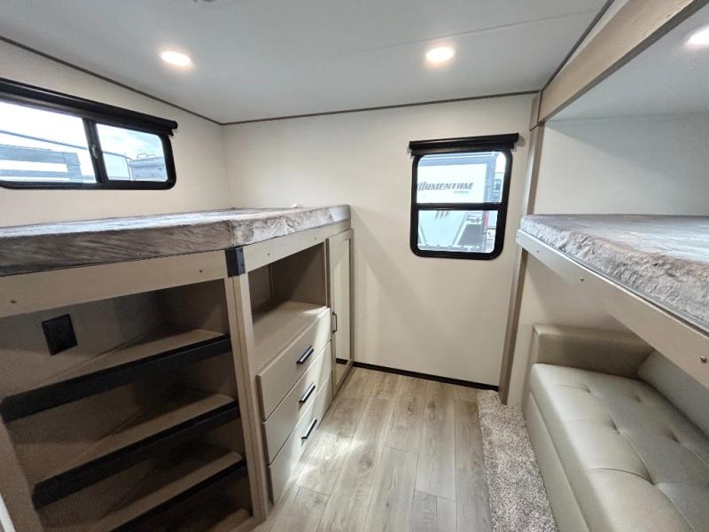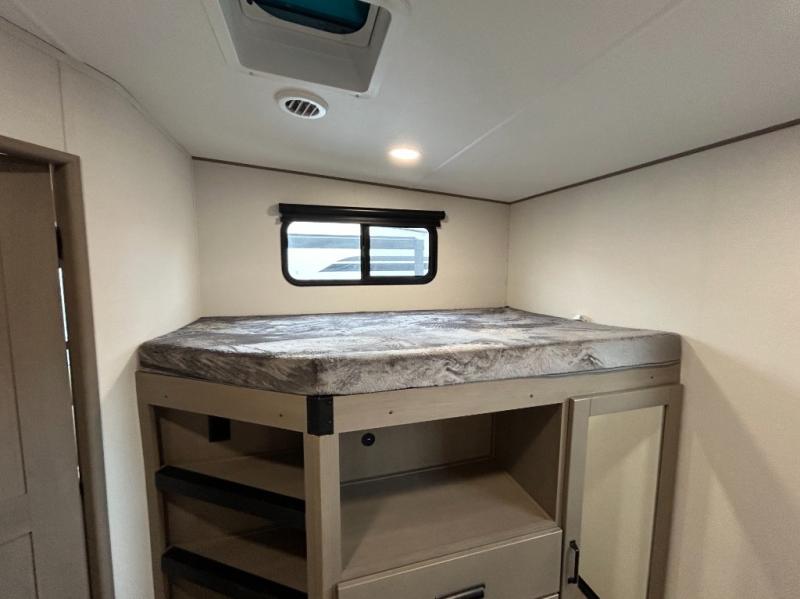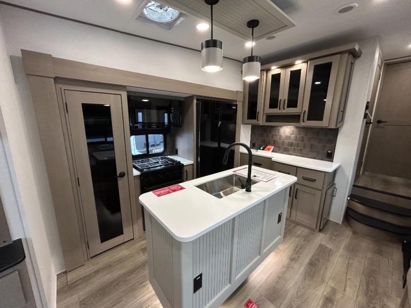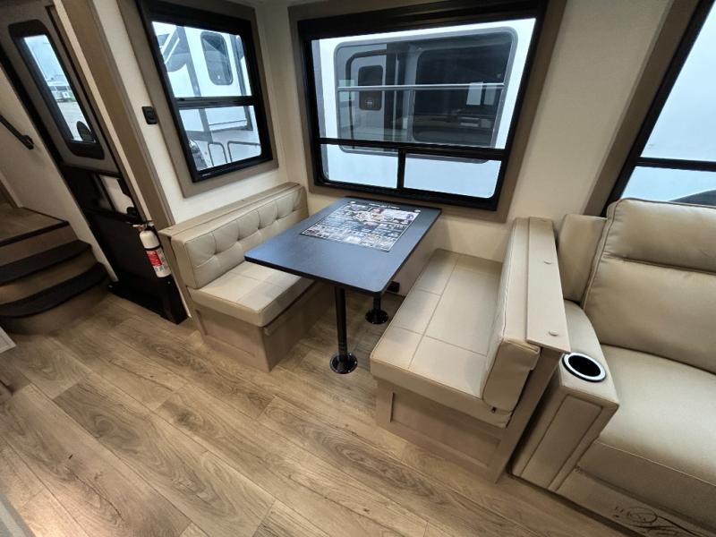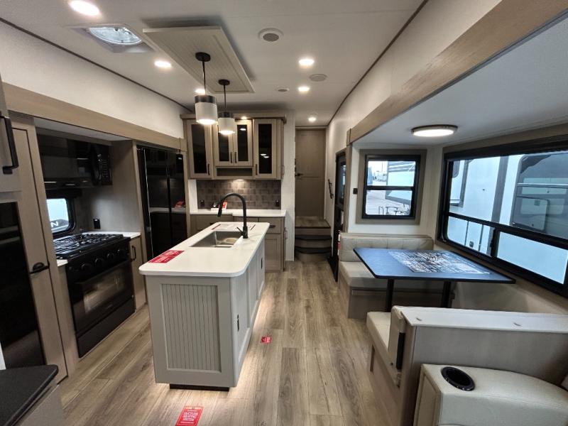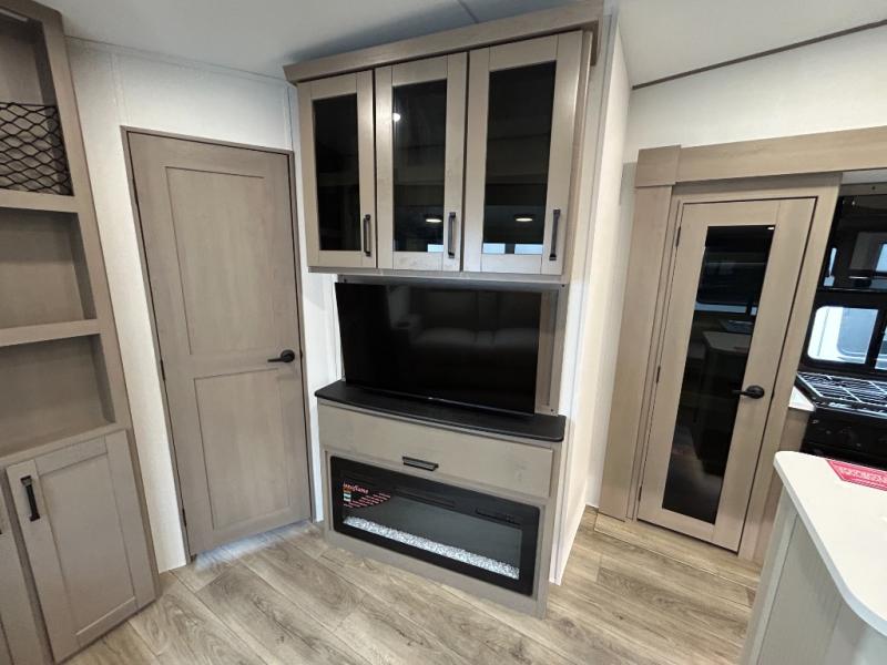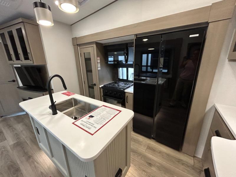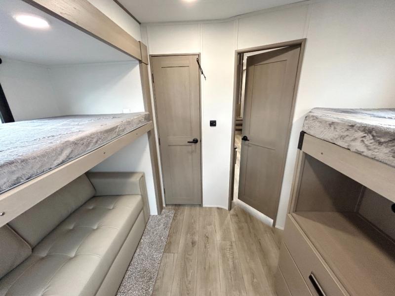 Are you looking to travel with your family and friends and want enough space for everyone to be comfortable? Step inside using the Step Above wit lift assist entry steps, to find a private bunkhouse in the rear of this fifth wheel which offers a slide out flip bunk above a tri-fold sofa, a 44" bunk bed with window and storage below, plus its very own private half bathroom. The theater seating or tri-fold sofa option is a great place to unwind at night in front of the entertainment center with a 40" LED HDTV and fireplace below it. There is a booth dinette or you can a swivel dinette option to dine at, and the kitchen island will provide more counter space to prep meals. You will find full amenities including a 16 cu. ft. 12V refrigerator and a hutch. This fifth wheel also includes a double entry bathroom with a radius shower, and you can wake up refreshed each morning after sleeping on your own queen bed.