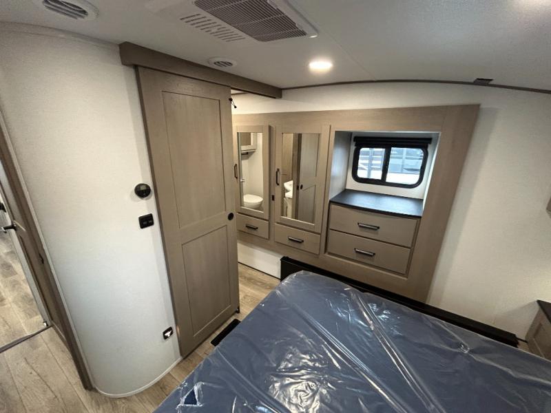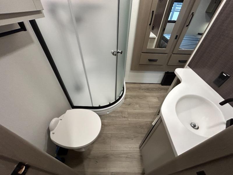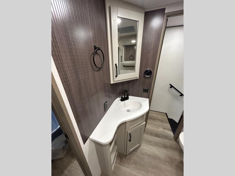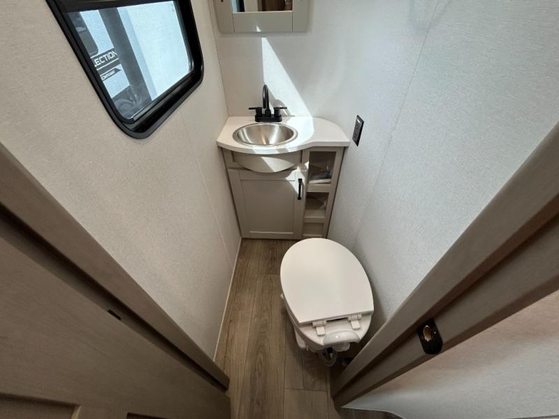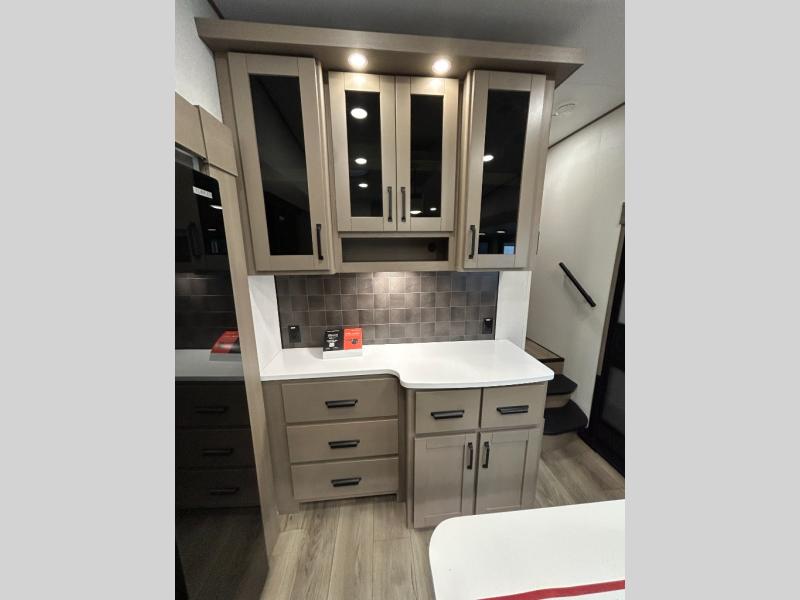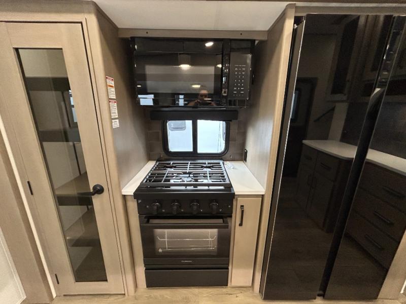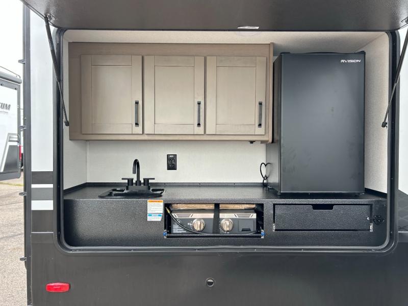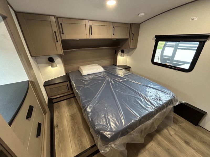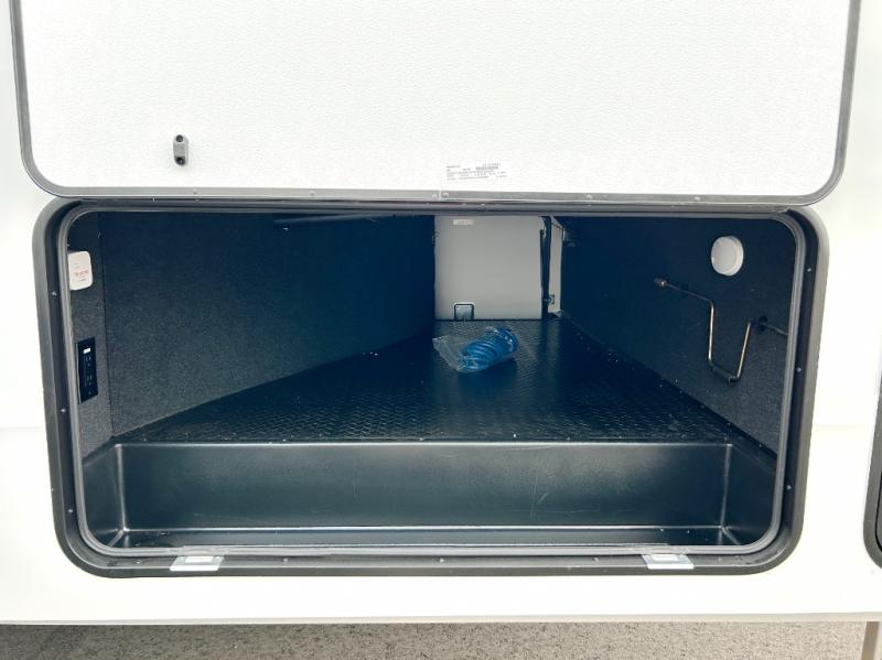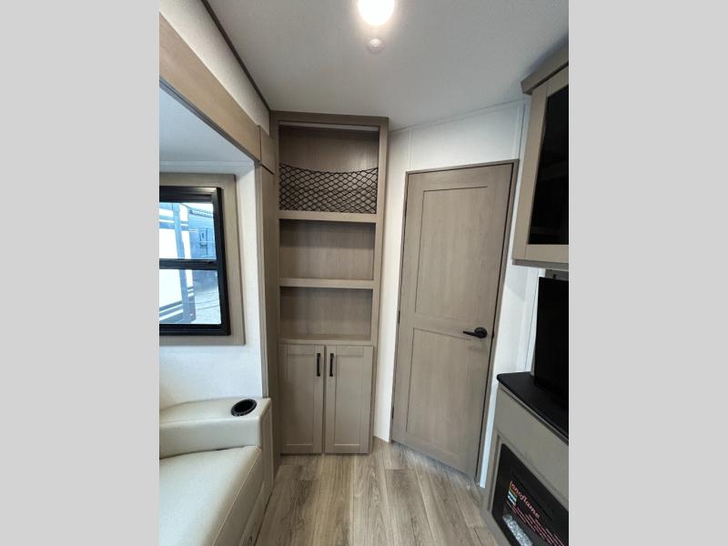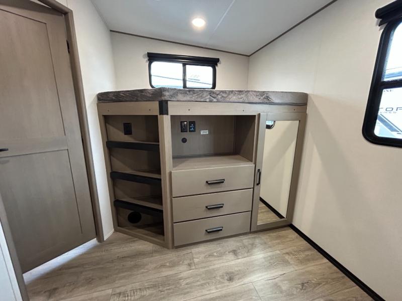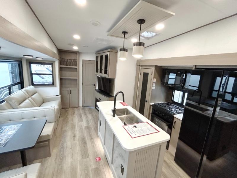 Are you looking to travel with your family and friends and want enough space for everyone to be comfortable? Step inside using the Step Above wit lift assist entry steps, to find a private bunkhouse in the rear of this fifth wheel which offers a slide out flip bunk above a tri-fold sofa, a 44" bunk bed with window and storage below, plus its very own private half bathroom. The theater seating or tri-fold sofa option is a great place to unwind at night in front of the entertainment center with a 40" LED HDTV and fireplace below it. There is a booth dinette or you can a swivel dinette option to dine at, and the kitchen island will provide more counter space to prep meals. You will find full amenities including a 16 cu. ft. 12V refrigerator and a hutch. This fifth wheel also includes a double entry bathroom with a radius shower, and you can wake up refreshed each morning after sleeping on your own queen bed.