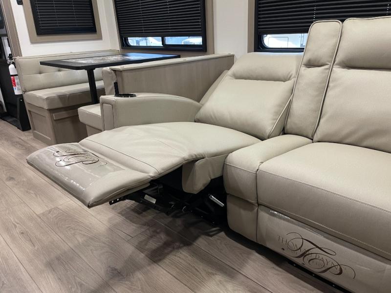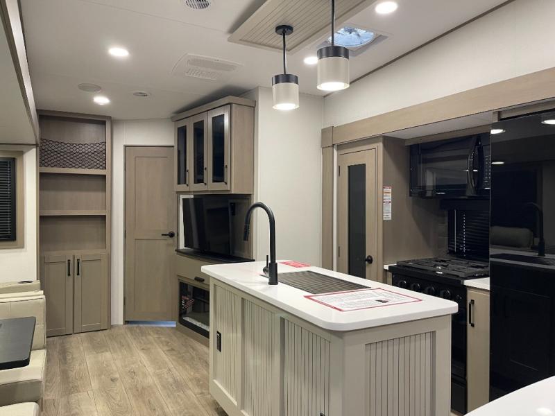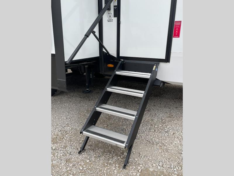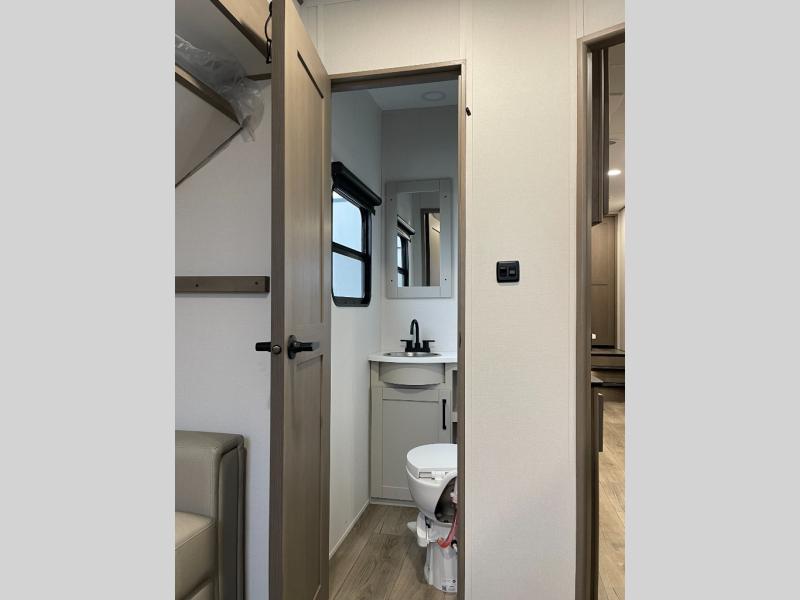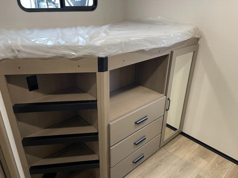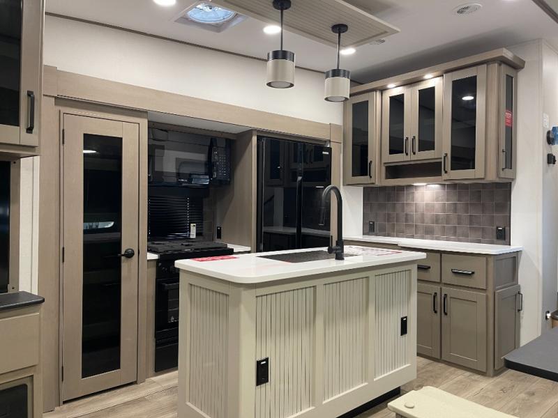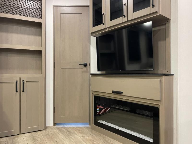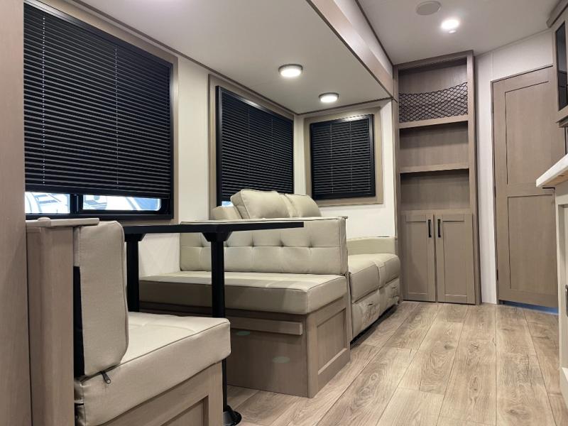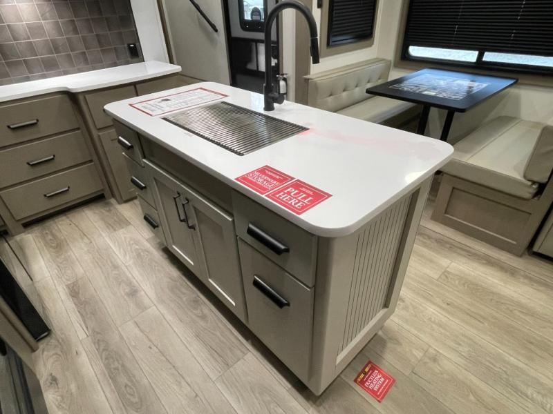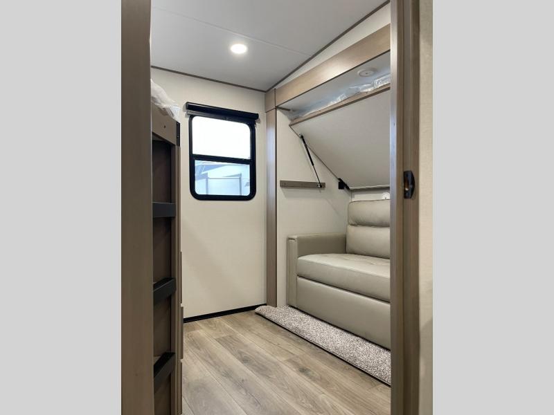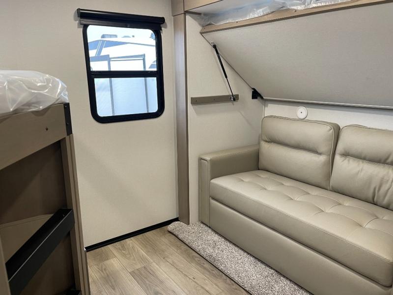 Are you looking to travel with your family and friends and want enough space for everyone to be comfortable? Step inside using the Step Above wit lift assist entry steps, to find a private bunkhouse in the rear of this fifth wheel which offers a slide out flip bunk above a tri-fold sofa, a 44" bunk bed with window and storage below, plus its very own private half bathroom. The theater seating or tri-fold sofa option is a great place to unwind at night in front of the entertainment center with a 40" LED HDTV and fireplace below it. There is a booth dinette or you can a swivel dinette option to dine at, and the kitchen island will provide more counter space to prep meals. You will find full amenities including a 16 cu. ft. 12V refrigerator and a hutch. This fifth wheel also includes a double entry bathroom with a radius shower, and you can wake up refreshed each morning after sleeping on your own queen bed.