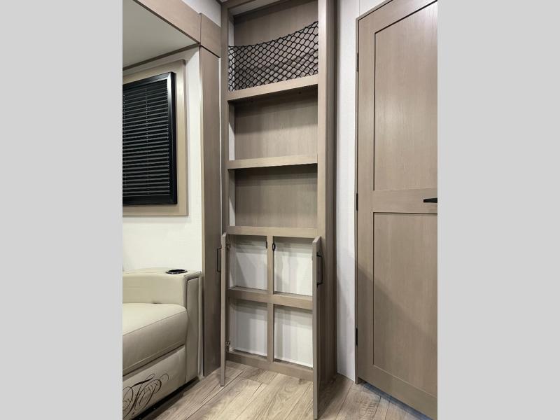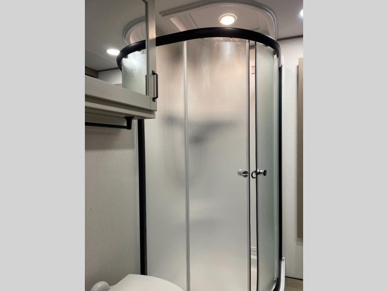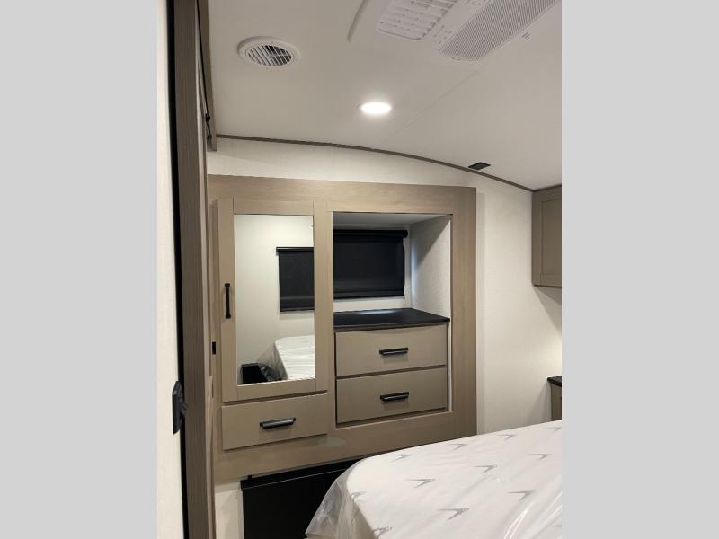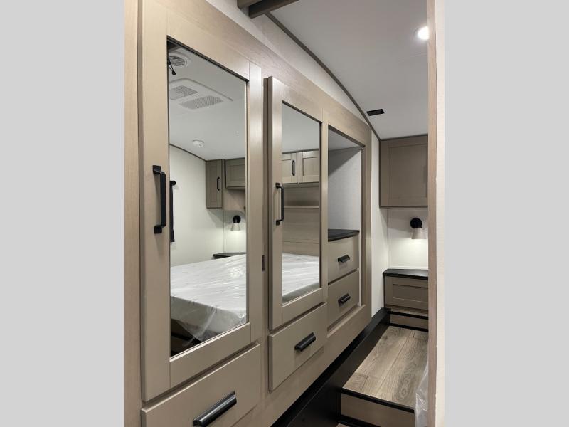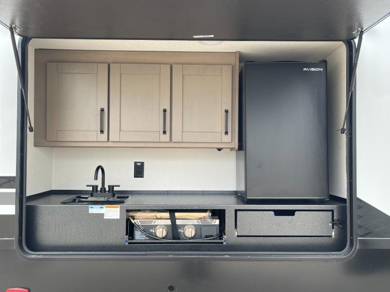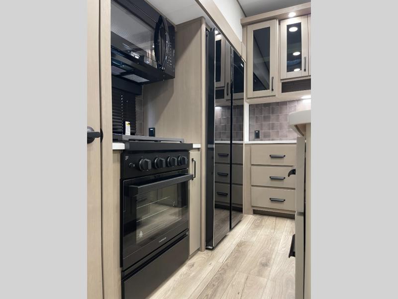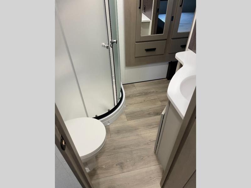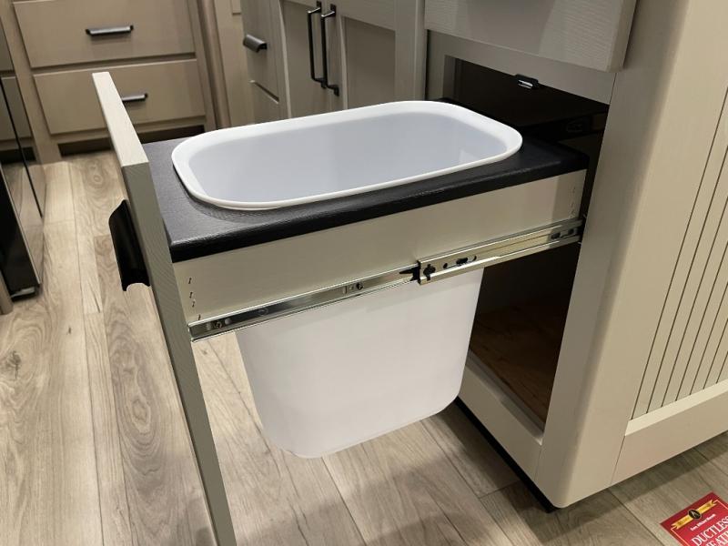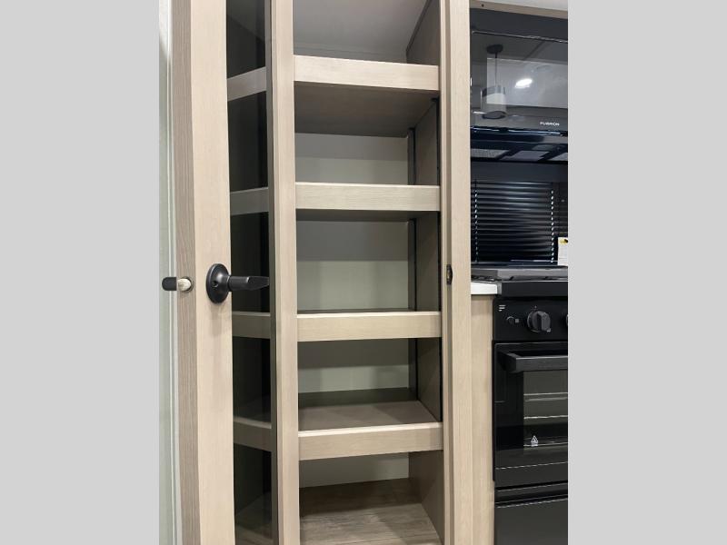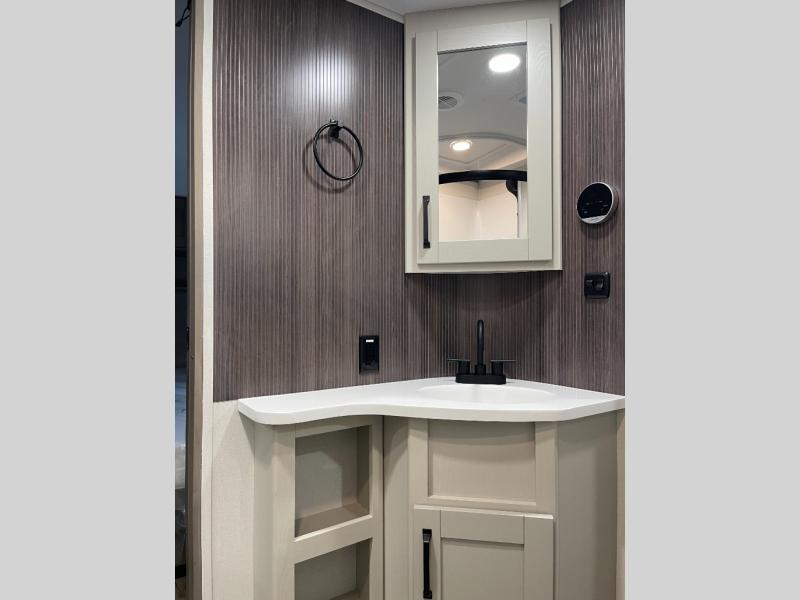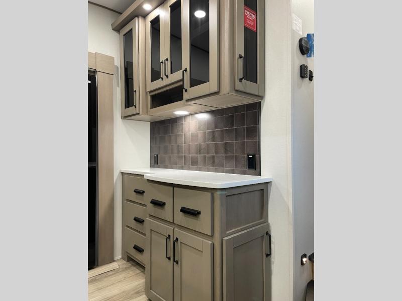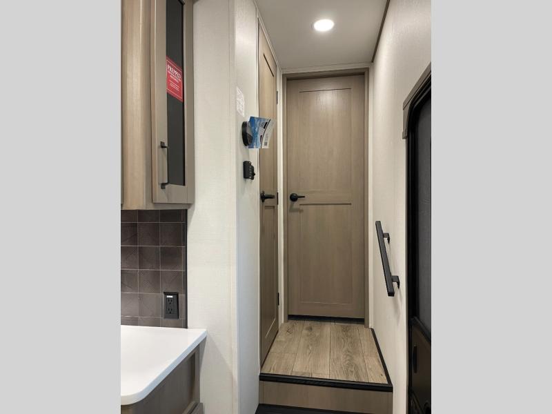 Are you looking to travel with your family and friends and want enough space for everyone to be comfortable? Step inside using the Step Above wit lift assist entry steps, to find a private bunkhouse in the rear of this fifth wheel which offers a slide out flip bunk above a tri-fold sofa, a 44" bunk bed with window and storage below, plus its very own private half bathroom. The theater seating or tri-fold sofa option is a great place to unwind at night in front of the entertainment center with a 40" LED HDTV and fireplace below it. There is a booth dinette or you can a swivel dinette option to dine at, and the kitchen island will provide more counter space to prep meals. You will find full amenities including a 16 cu. ft. 12V refrigerator and a hutch. This fifth wheel also includes a double entry bathroom with a radius shower, and you can wake up refreshed each morning after sleeping on your own queen bed.