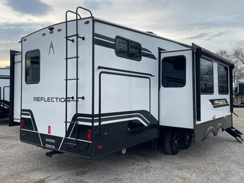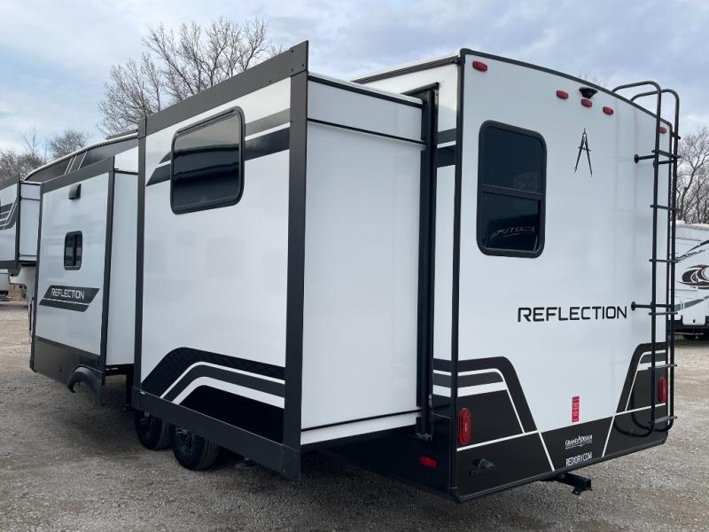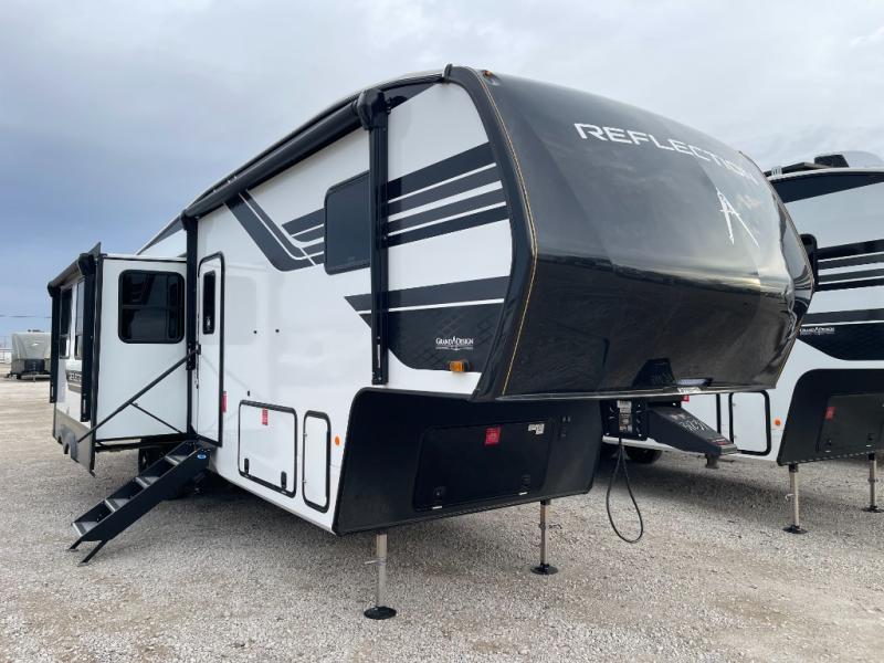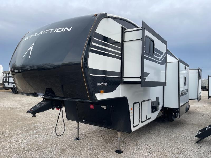 With any Reflection fifth wheel by Grand Design, you will have a solar panel for off-grid camping and a 60 amp charge controller and inverter prep, a Universal All-In-One docking station, unobstructed pass-through storage, and Goodyear Endurance tires. Each is constructed of gel coat exterior sidewalls, residential 5" truss rafters, walk-on roof decking, a fiberglass and radiant foil roof and front cap insulation plus laminated aluminum framed side walls, roof and end walls in slide rooms. Head inside to enjoy residential hardwood cabinet doors, premium Congoleum flooring, a spacious shower with a glass door, and many more comforts!
