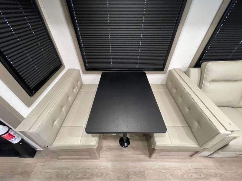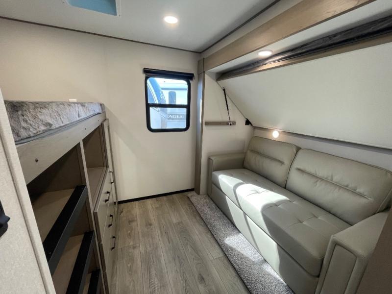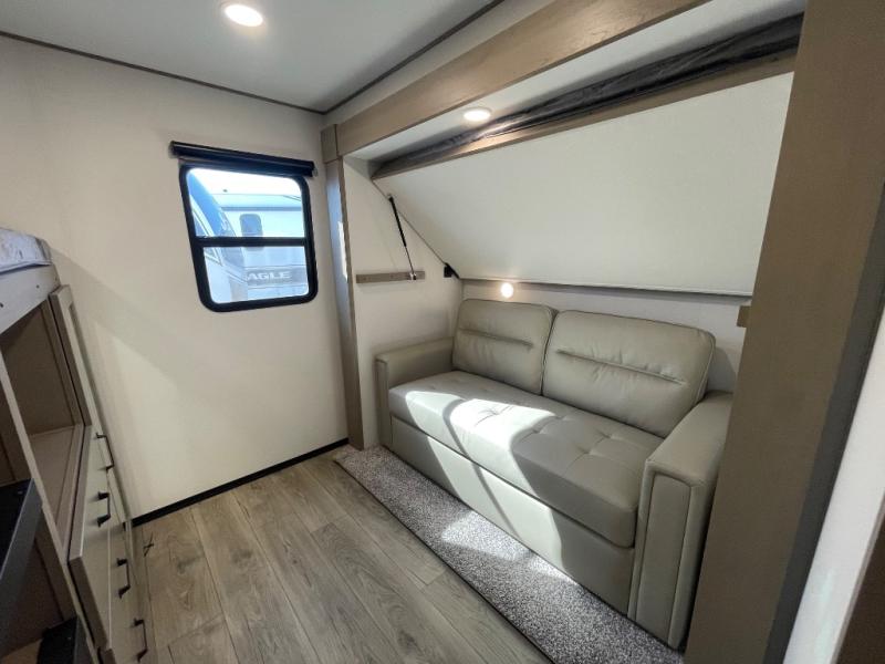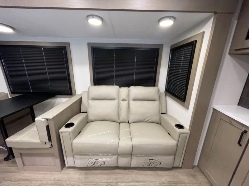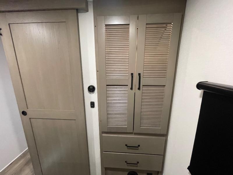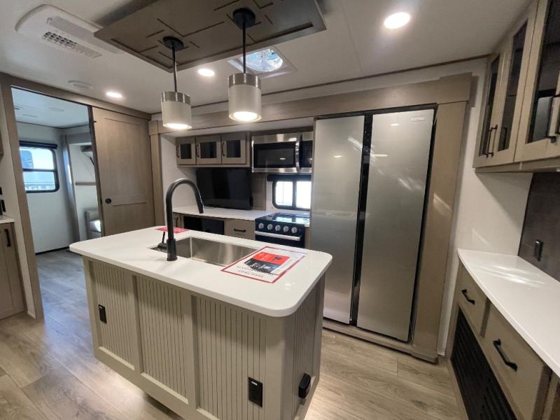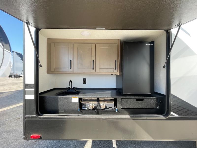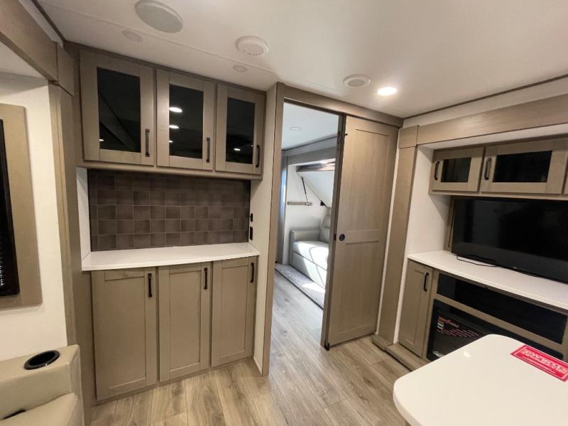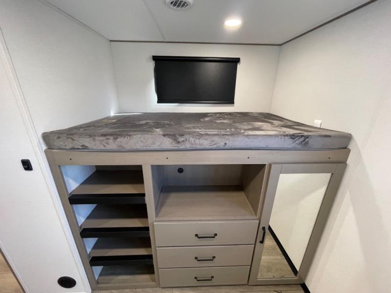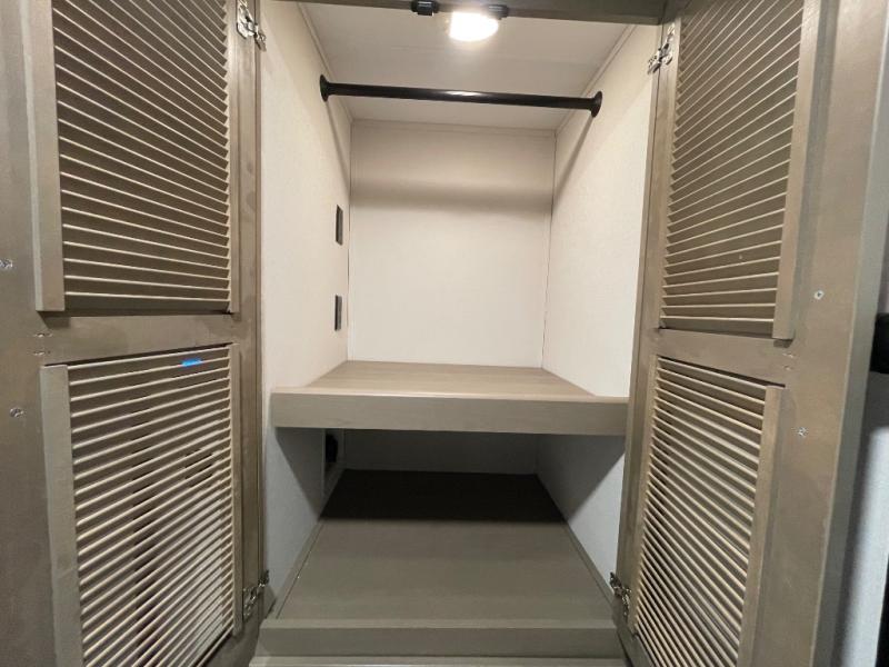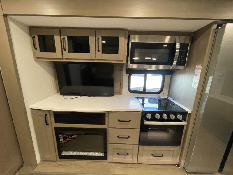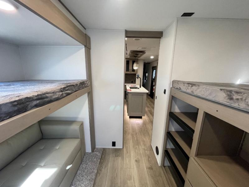 Finding the perfect trailer for a larger group is simple, take a look at this one for your next RV! The rear bunkhouse might be the first reason you fall in love because of the slide out with a flip bunk above a tri-fold sofa, the second bunk bed with a window on the opposite side and storage below, and the large rear window for great views. The outside kitchen might be another reason allowing you to enjoy the outdoors while providing meals for everyone, and/or the inside gourmet kitchen with a 16 cu. ft. refrigerator, an island, and two hutches. Everyone can gather together and relax on the theater seating with cupholders and the booth dinette or optional swivel dinette, or watch the 40" LED HDTV with fireplace below. The full bathroom includes a space savings sliding door and linen storage, and the bedroom gives you a front walk-around queen bed with storage for your clothes on each side, plus there is an additional wardrobe with drawers for your clothes!