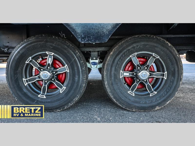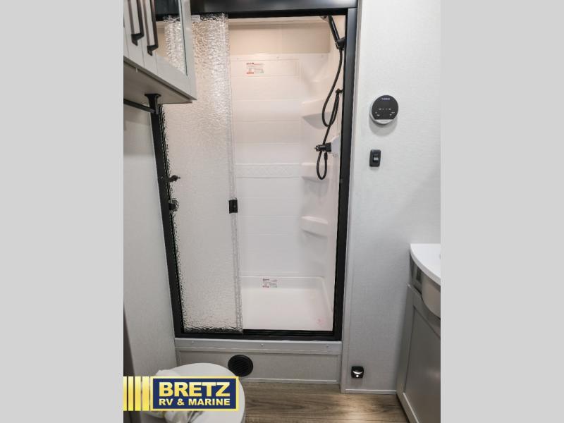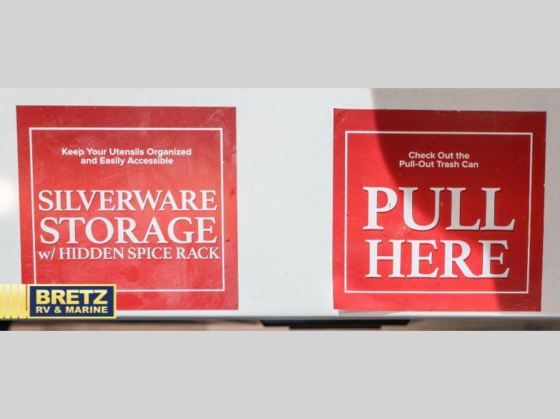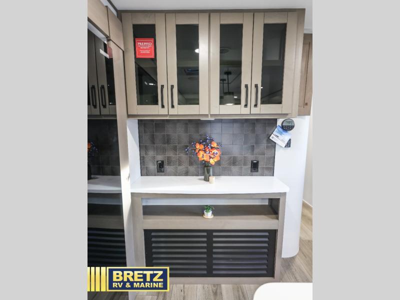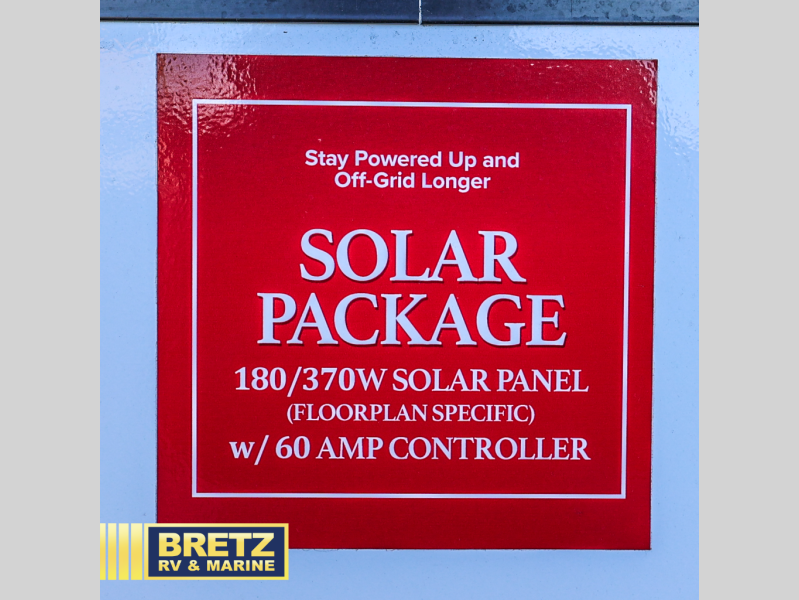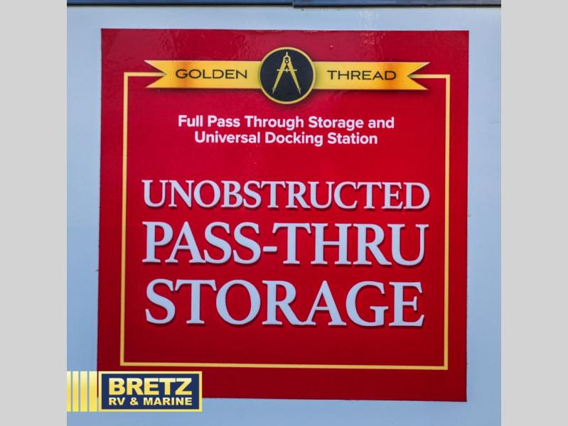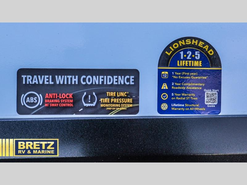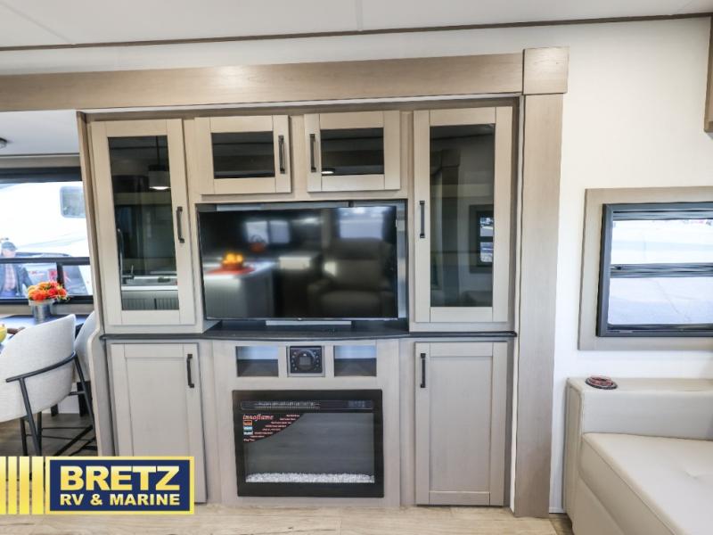 Whether you travel to explore or relax, this trailer will give you the choice depending where you park it! The kitchen amenities offer a gourmet kitchen including a 16 cu. ft. refrigerator, an island, and a hutch. You and your guests will find theater seating with cupholders, a booth dinette or optional swivel dinette, and a tri-fold sofa to sit on and visit while you watch the 40" LED HDTV with a fireplace below. The full bathroom includes a space saving sliding door and linen storage, and the bedroom gives you a front walk-around queen bed with storage for your clothes on each side. There is even washer and dryer prep here if you choose to go full-time. Outside, you'll find a 12' electric awning, an LP Quick Connect and Coax TV hookup, plus an exterior griddle, 4.1 cu. ft. refrigerator and outside spray port!
