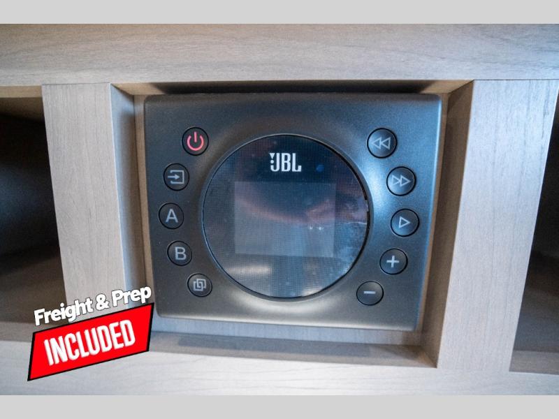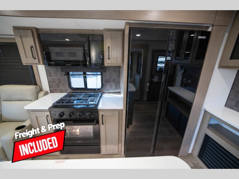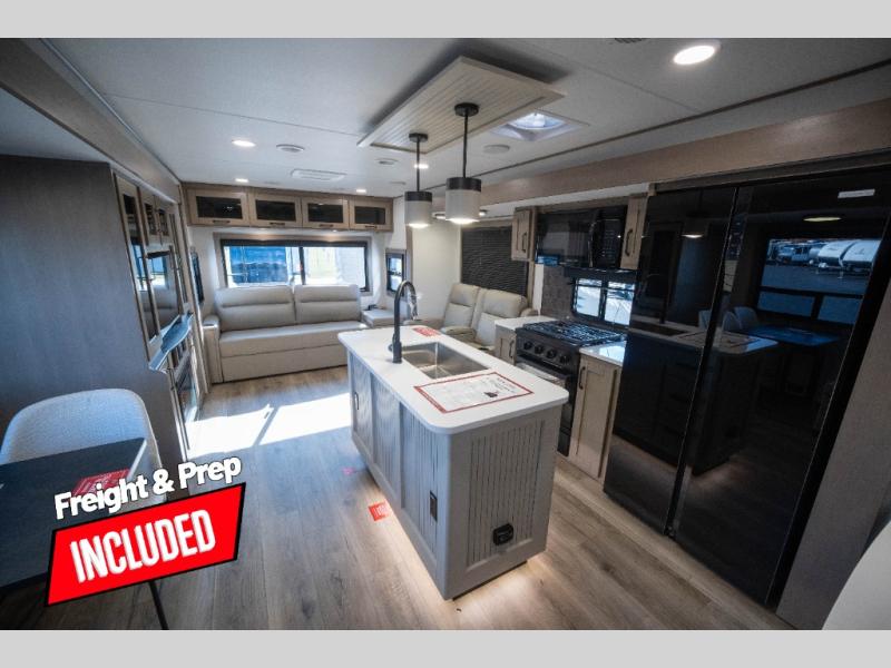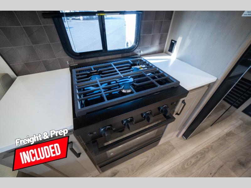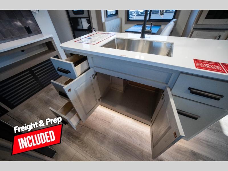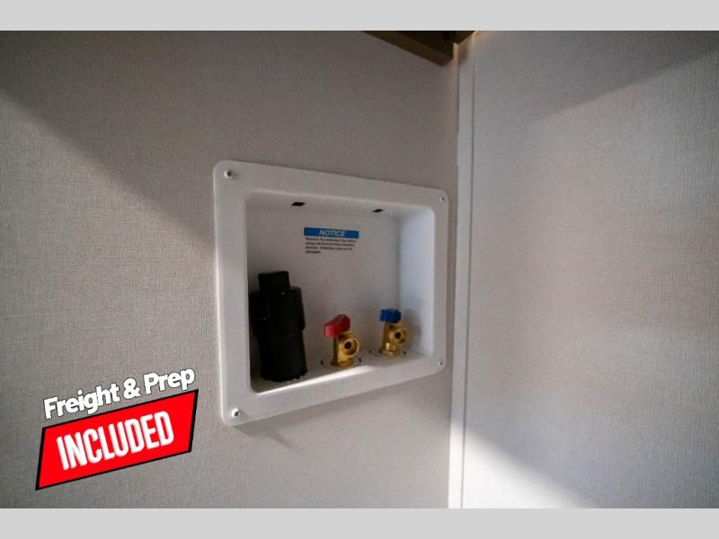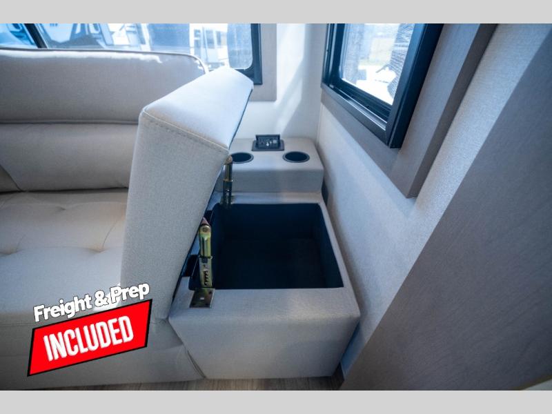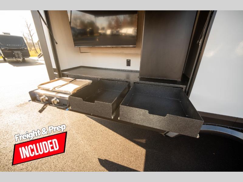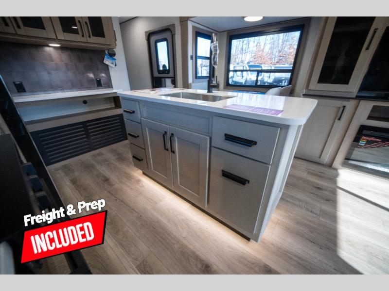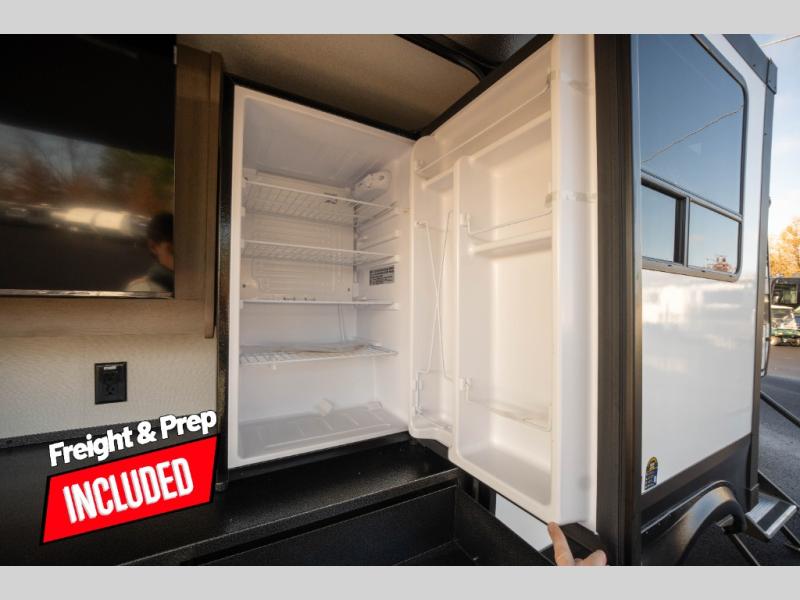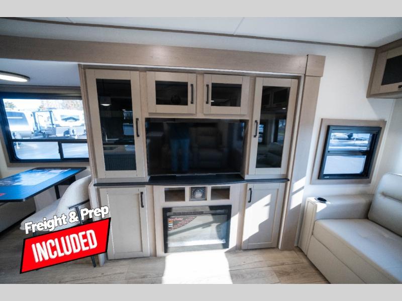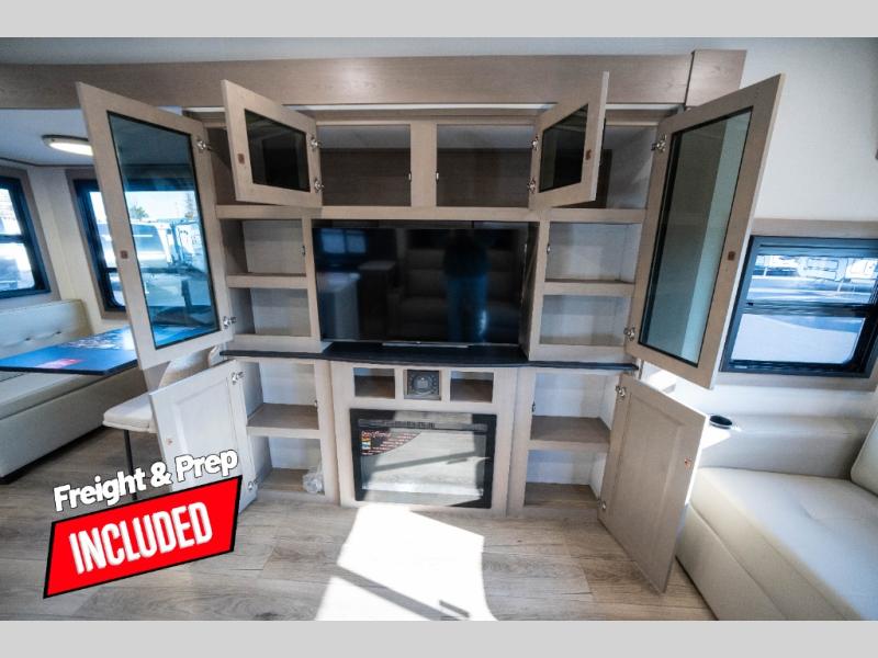 Whether you travel to explore or relax, this trailer will give you the choice depending where you park it! The kitchen amenities offer a gourmet kitchen including a 16 cu. ft. refrigerator, an island, and a hutch. You and your guests will find theater seating with cupholders, a booth dinette or optional swivel dinette, and a tri-fold sofa to sit on and visit while you watch the 40" LED HDTV with a fireplace below. The full bathroom includes a space saving sliding door and linen storage, and the bedroom gives you a front walk-around queen bed with storage for your clothes on each side. There is even washer and dryer prep here if you choose to go full-time. Outside, you'll find a 12' electric awning, an LP Quick Connect and Coax TV hookup, plus an exterior griddle, 4.1 cu. ft. refrigerator and outside spray port!