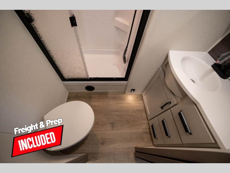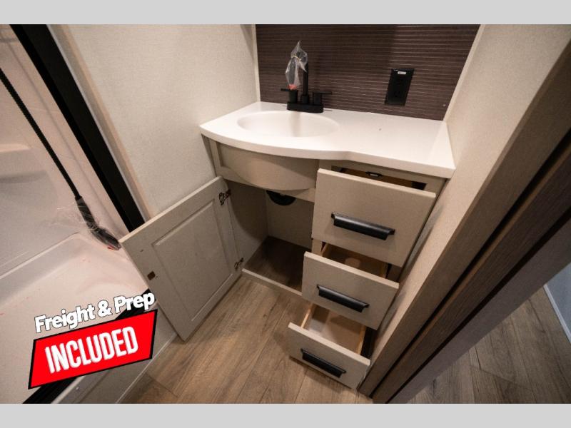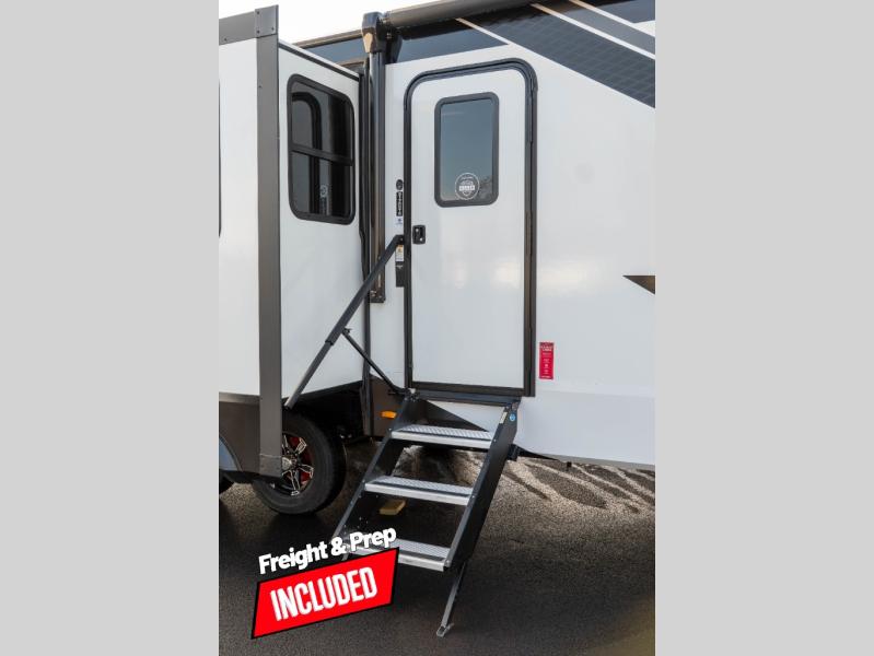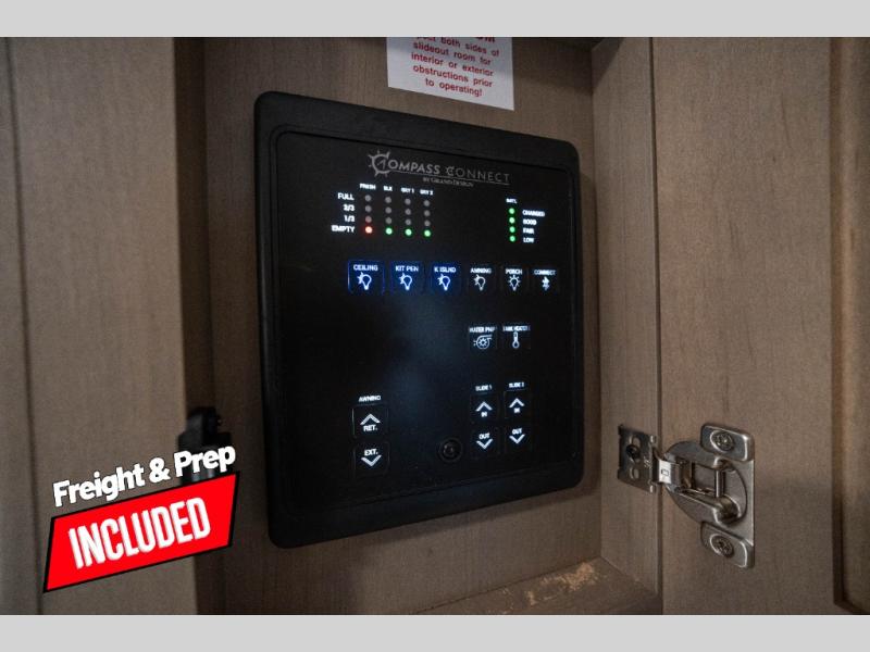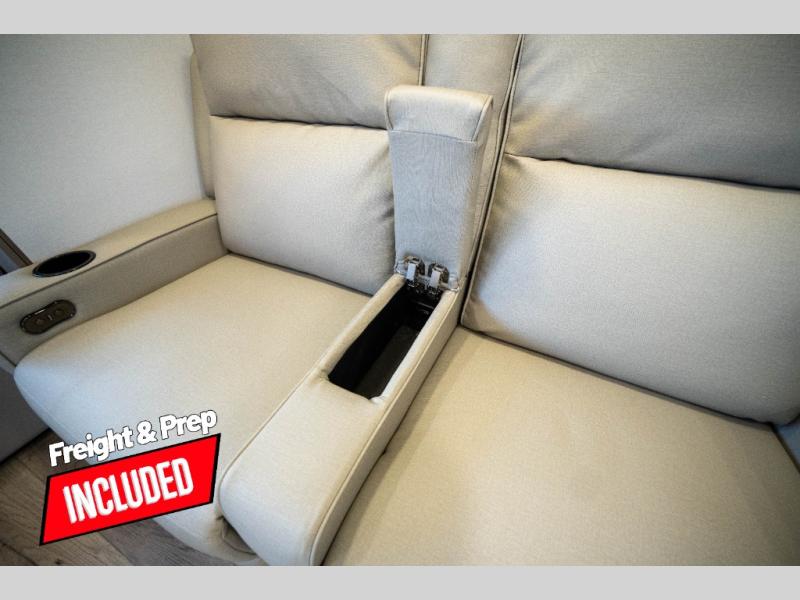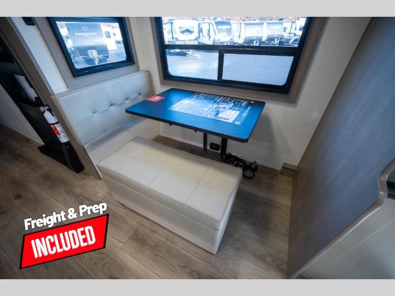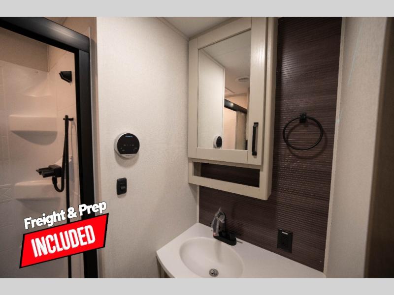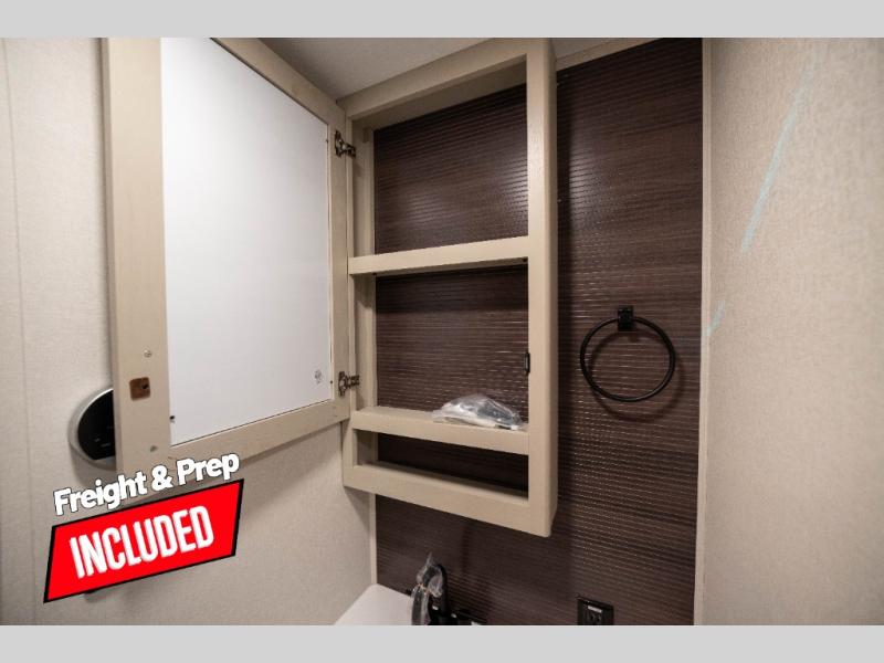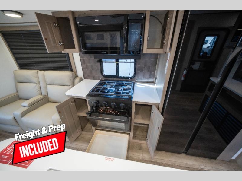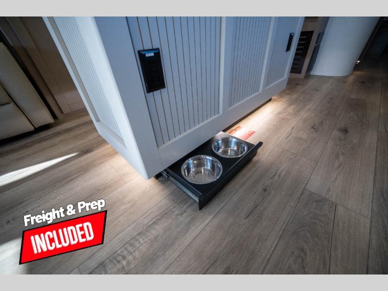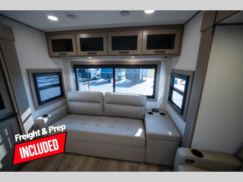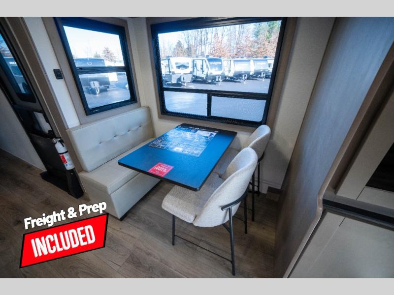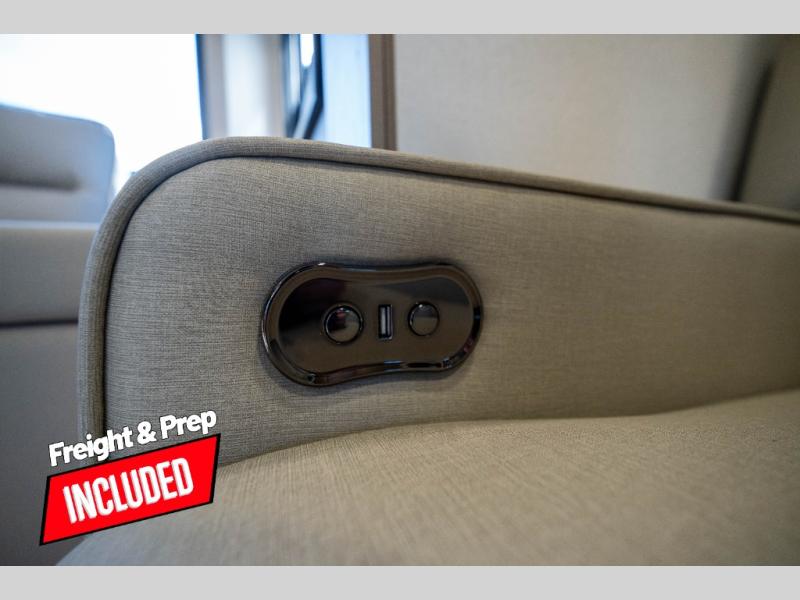 Whether you travel to explore or relax, this trailer will give you the choice depending where you park it! The kitchen amenities offer a gourmet kitchen including a 16 cu. ft. refrigerator, an island, and a hutch. You and your guests will find theater seating with cupholders, a booth dinette or optional swivel dinette, and a tri-fold sofa to sit on and visit while you watch the 40" LED HDTV with a fireplace below. The full bathroom includes a space saving sliding door and linen storage, and the bedroom gives you a front walk-around queen bed with storage for your clothes on each side. There is even washer and dryer prep here if you choose to go full-time. Outside, you'll find a 12' electric awning, an LP Quick Connect and Coax TV hookup, plus an exterior griddle, 4.1 cu. ft. refrigerator and outside spray port!