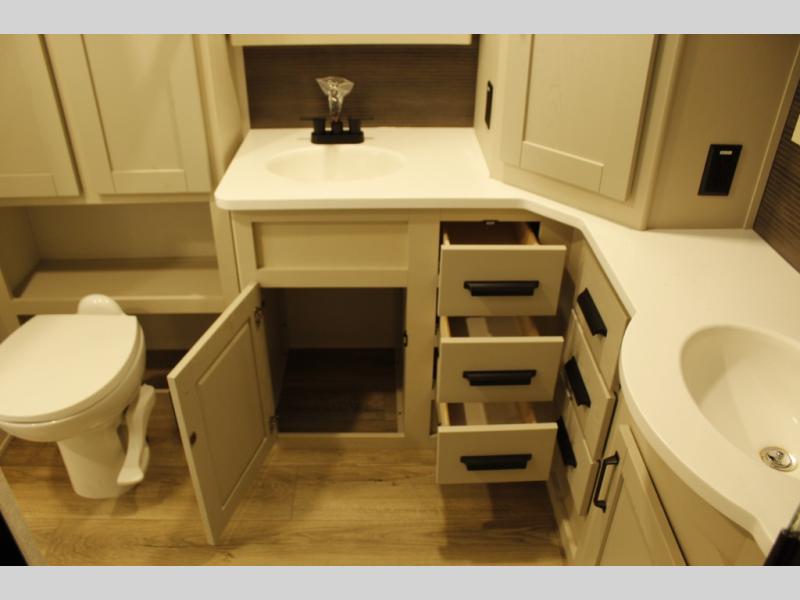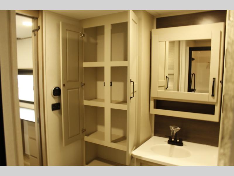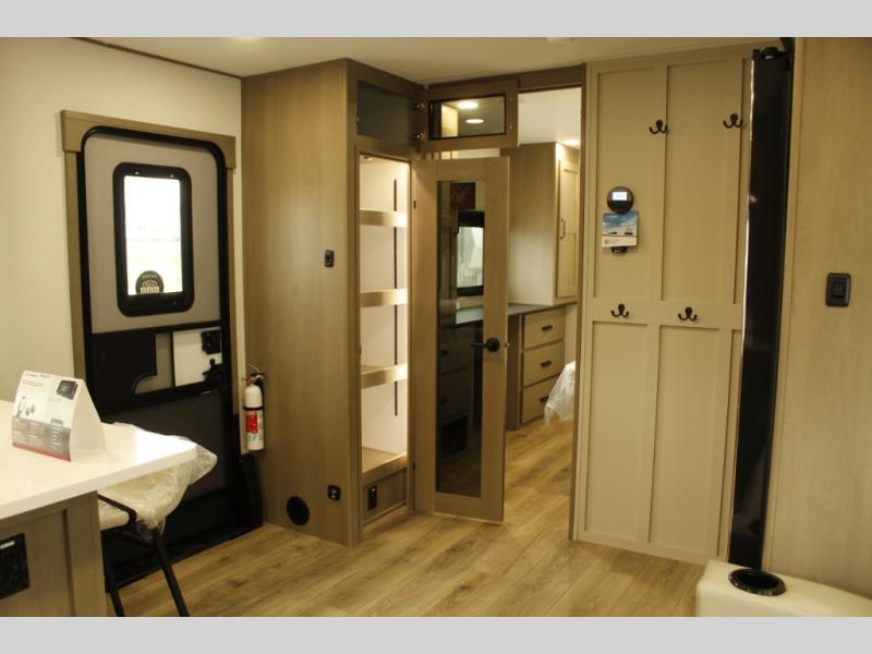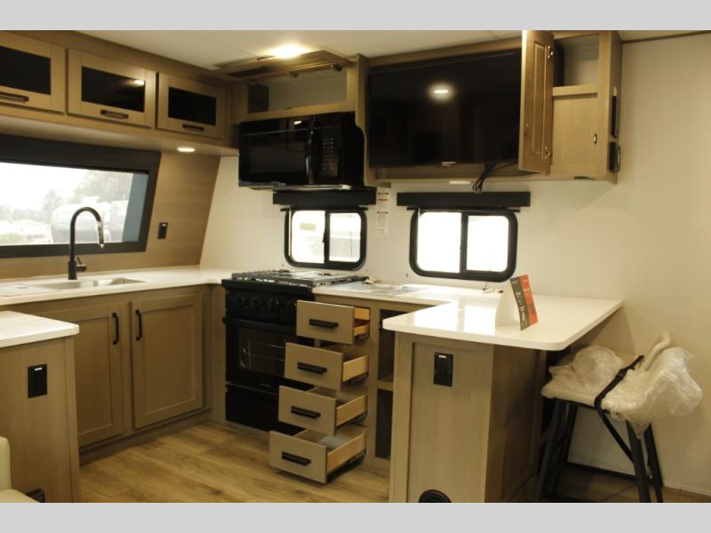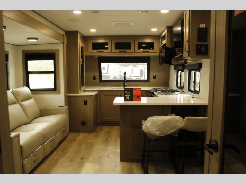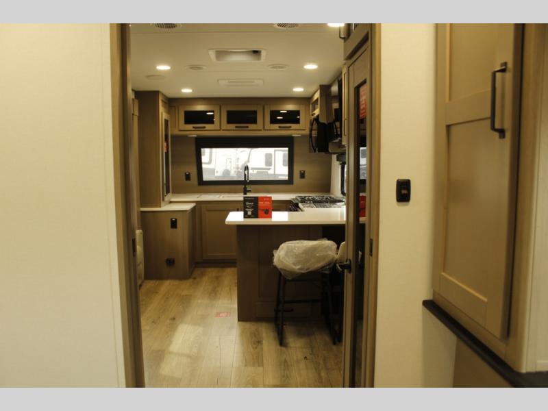 This front kitchen travel trailer will be perfect for camping trips to the lake or woods! There is ample counter space to prep your best meals, including an L-shaped kitchen counter with a bar stool to enjoy your coffee at. The theater seating is inviting, and you can choose the optional U-shaped dinette if you need more sleeping space for guests. This unit features a massive master bedroom with a queen bed slide and optional king bed, two closets, and a spacious rear bath. There are two bath sinks here, a 30" x 48" shower, plus washer and dryer prep if you choose to add these appliances!