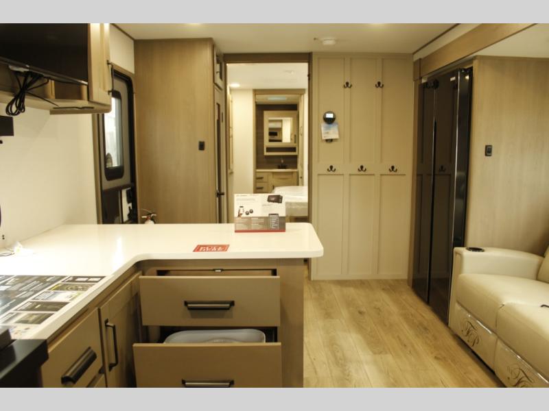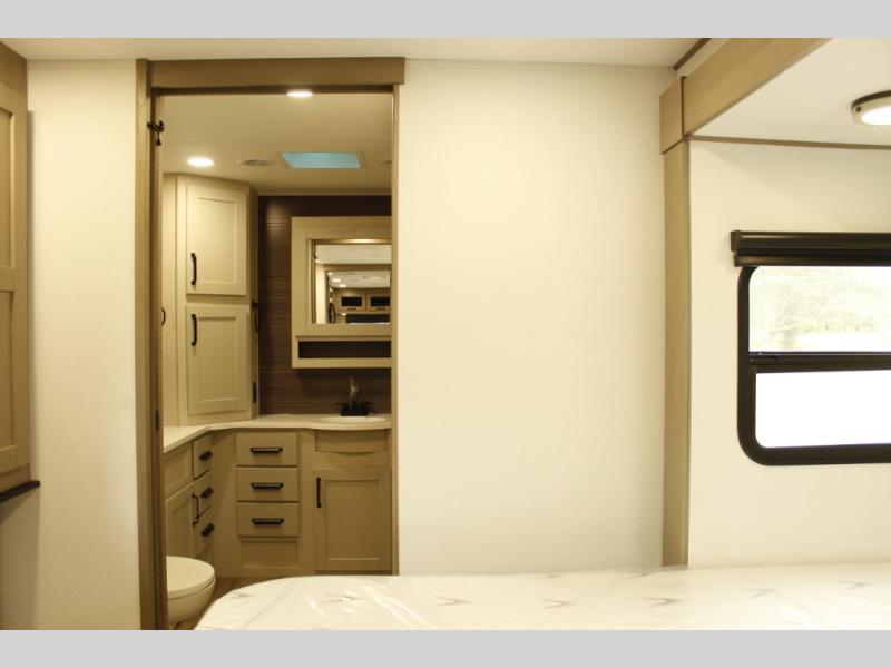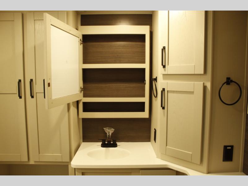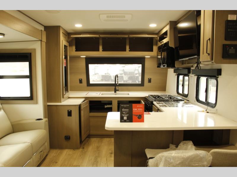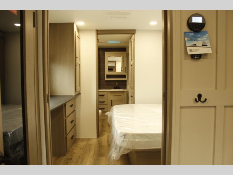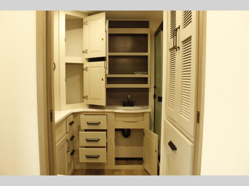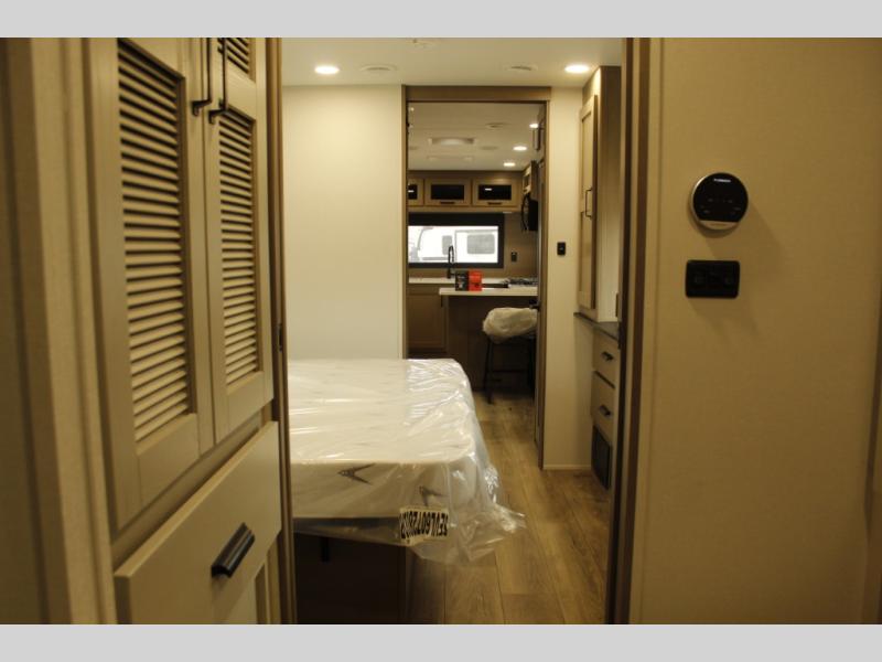 This front kitchen travel trailer will be perfect for camping trips to the lake or woods! There is ample counter space to prep your best meals, including an L-shaped kitchen counter with a bar stool to enjoy your coffee at. The theater seating is inviting, and you can choose the optional U-shaped dinette if you need more sleeping space for guests. This unit features a massive master bedroom with a queen bed slide and optional king bed, two closets, and a spacious rear bath. There are two bath sinks here, a 30" x 48" shower, plus washer and dryer prep if you choose to add these appliances!