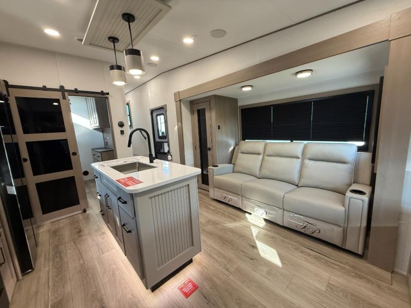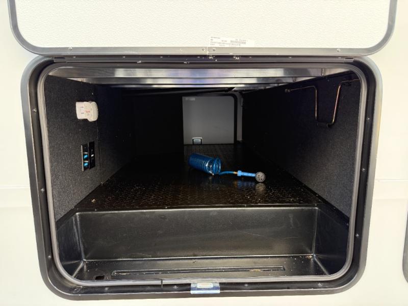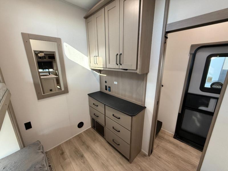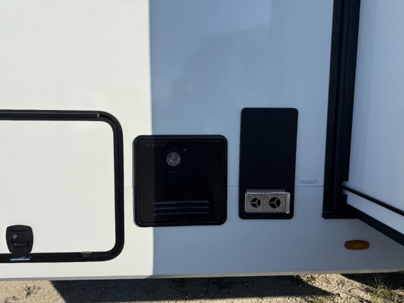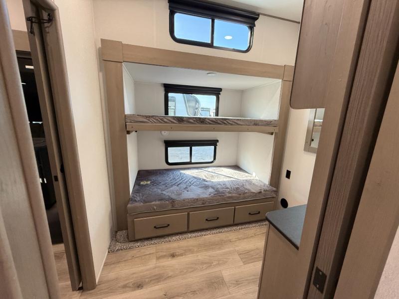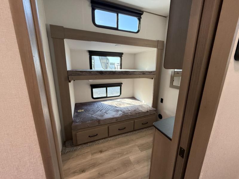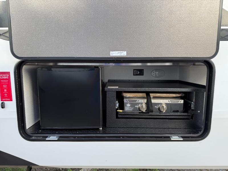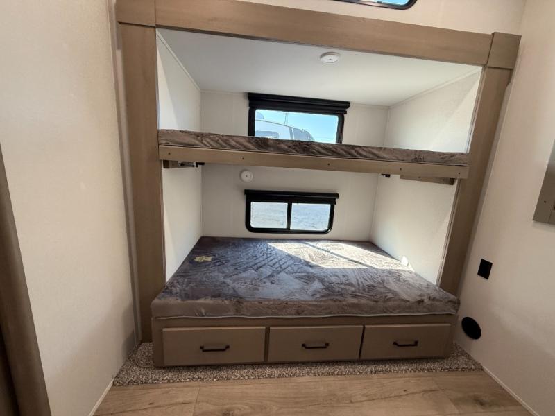 When you are looking for a versatile extra room for either a second bedroom or living area as well as an office, this middle bunkhouse might just work! There is a slide out with two bunks and drawers plus a dresser. You can sleep like a queen on the walk-around bed in the front private bedroom that offers more clothing storage and windows for views. The rear main living and kitchen area provides plenty of seating on the a 78" triple person theater seats, and on the 92" U-shaped lounge with table with windows within the slide for natural lighting and great views. The kitchen island gives the cook more space to make and serve meals, and the gourmet kitchen includes a 16 cu. ft. refrigerator, plus a pantry for dry goods. There is an exterior outside kitchen with a griddle and a 1.6 cu. ft. refrigerator for beverages and such, plus you will find an LP quick connect, Coax TV hookup, and a spray port to wash off your dirty shoes.