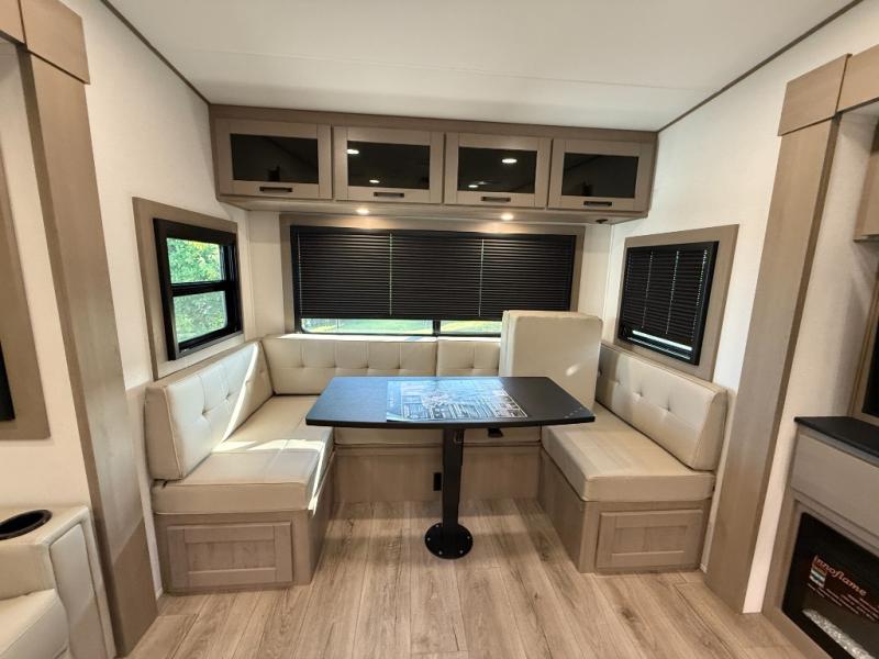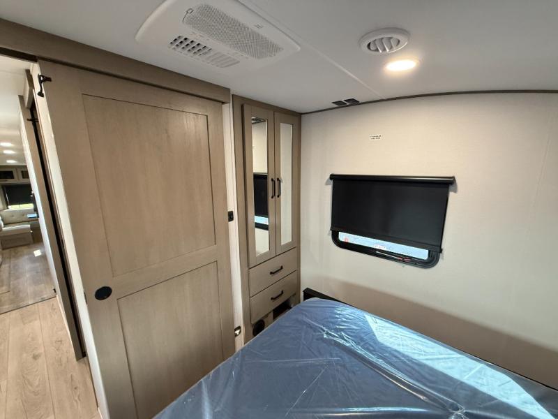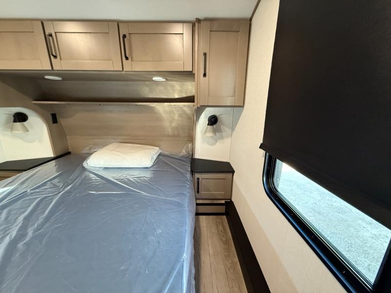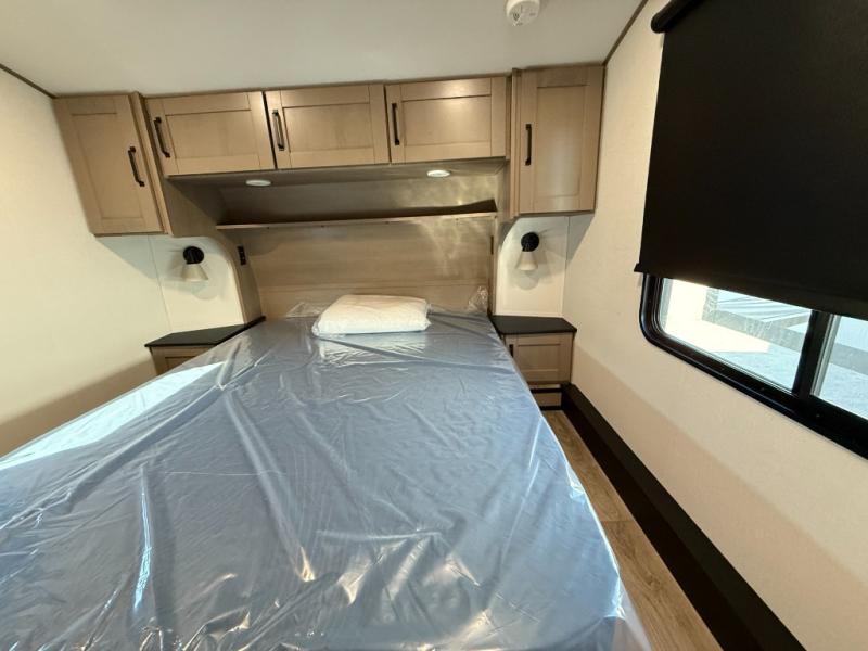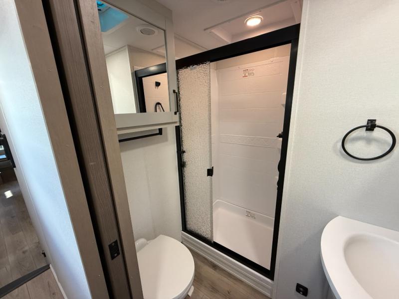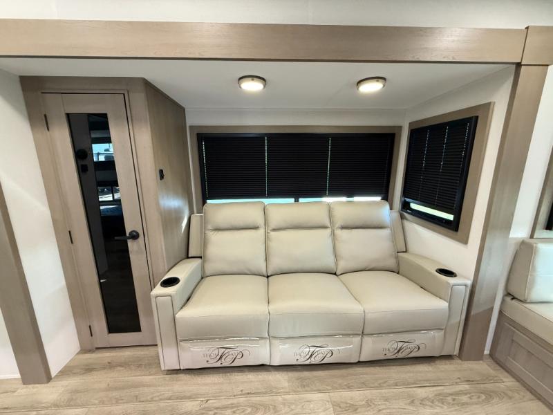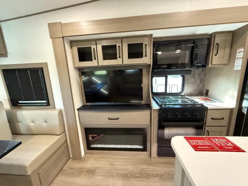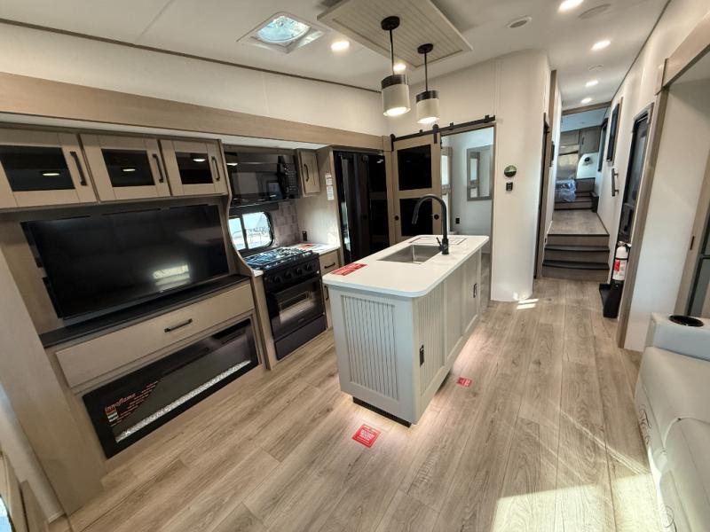 When you are looking for a versatile extra room for either a second bedroom or living area as well as an office, this middle bunkhouse might just work! There is a slide out with two bunks and drawers plus a dresser. You can sleep like a queen on the walk-around bed in the front private bedroom that offers more clothing storage and windows for views. The rear main living and kitchen area provides plenty of seating on the a 78" triple person theater seats, and on the 92" U-shaped lounge with table with windows within the slide for natural lighting and great views. The kitchen island gives the cook more space to make and serve meals, and the gourmet kitchen includes a 16 cu. ft. refrigerator, plus a pantry for dry goods. There is an exterior outside kitchen with a griddle and a 1.6 cu. ft. refrigerator for beverages and such, plus you will find an LP quick connect, Coax TV hookup, and a spray port to wash off your dirty shoes.