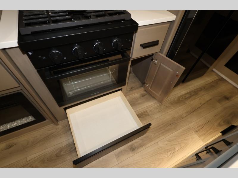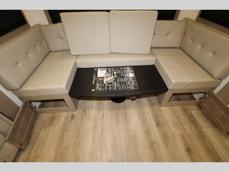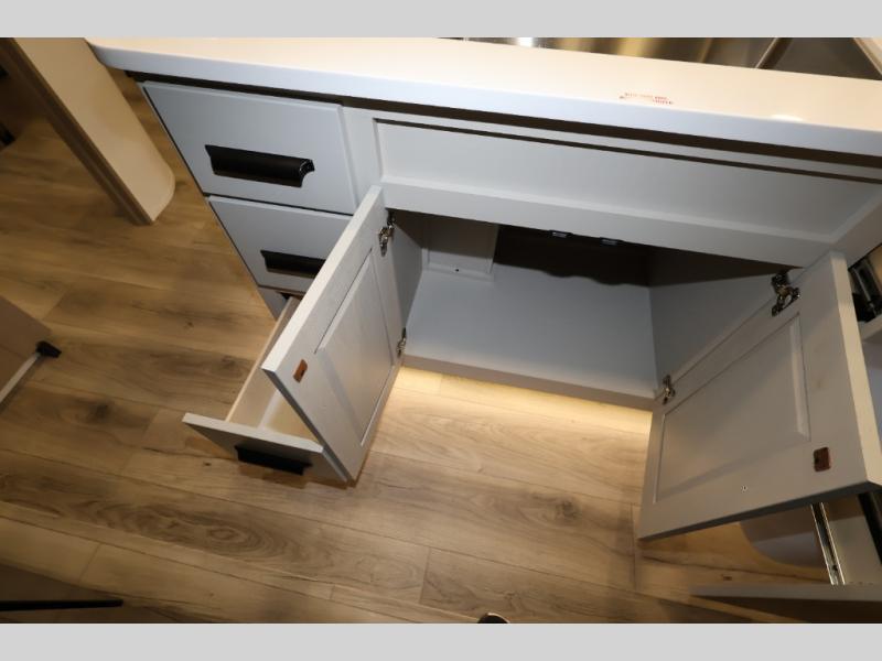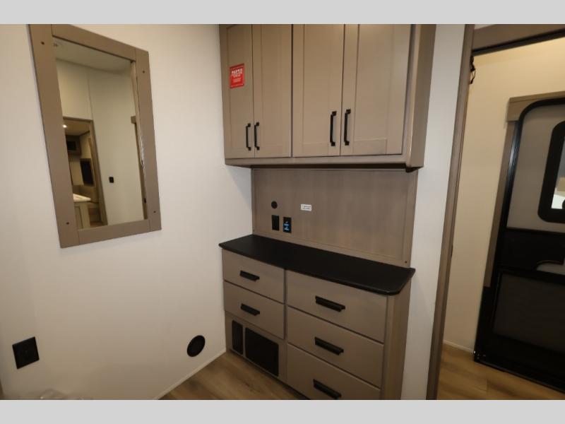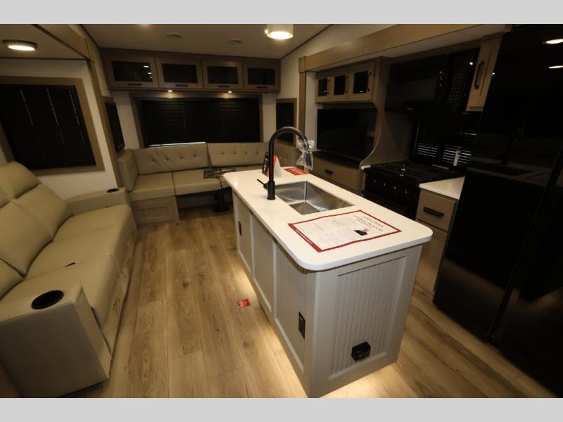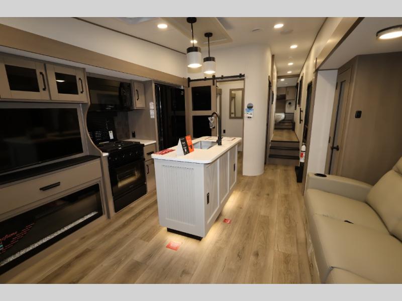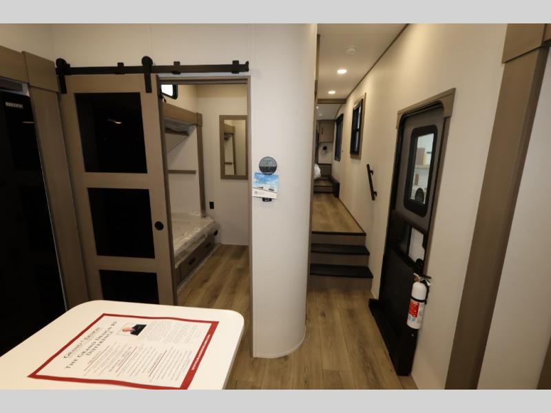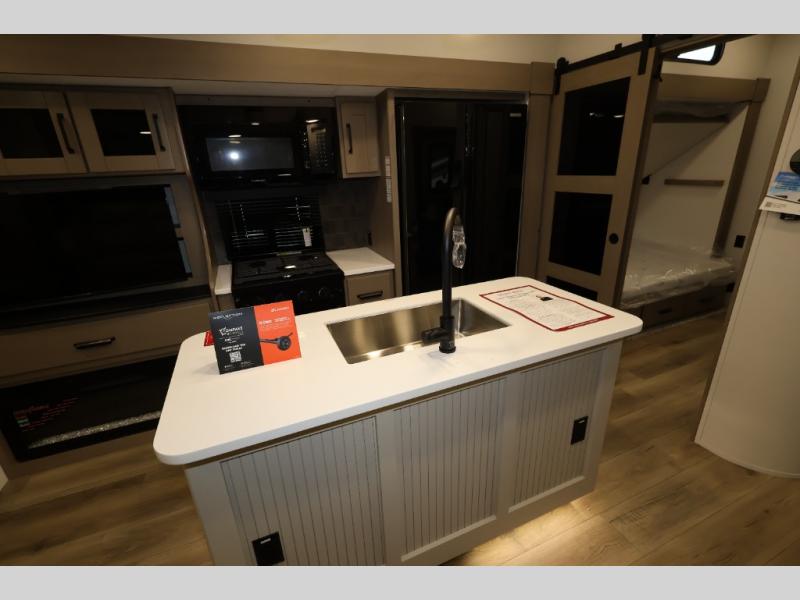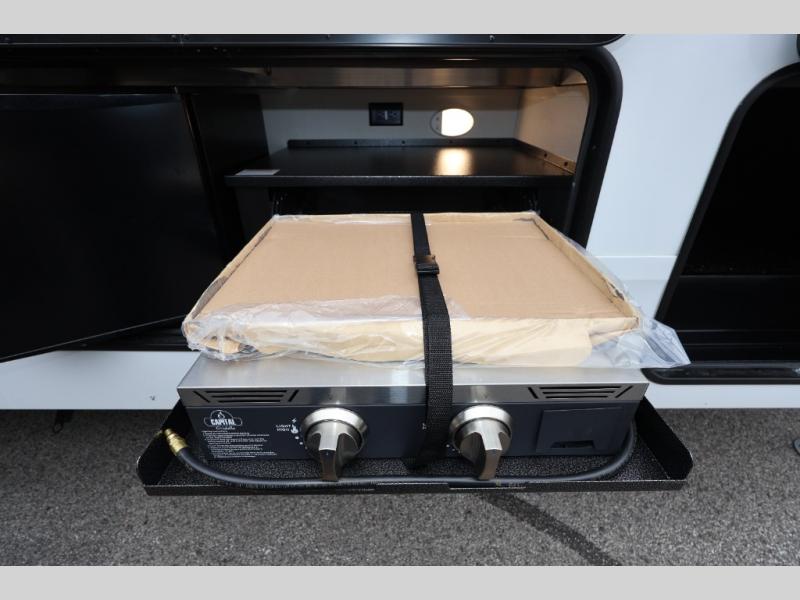 When you are looking for a versatile extra room for either a second bedroom or living area as well as an office, this middle bunkhouse might just work! There is a slide out with two bunks and drawers plus a dresser. You can sleep like a queen on the walk-around bed in the front private bedroom that offers more clothing storage and windows for views. The rear main living and kitchen area provides plenty of seating on the a 78" triple person theater seats, and on the 92" U-shaped lounge with table with windows within the slide for natural lighting and great views. The kitchen island gives the cook more space to make and serve meals, and the gourmet kitchen includes a 16 cu. ft. refrigerator, plus a pantry for dry goods. There is an exterior outside kitchen with a griddle and a 1.6 cu. ft. refrigerator for beverages and such, plus you will find an LP quick connect, Coax TV hookup, and a spray port to wash off your dirty shoes.