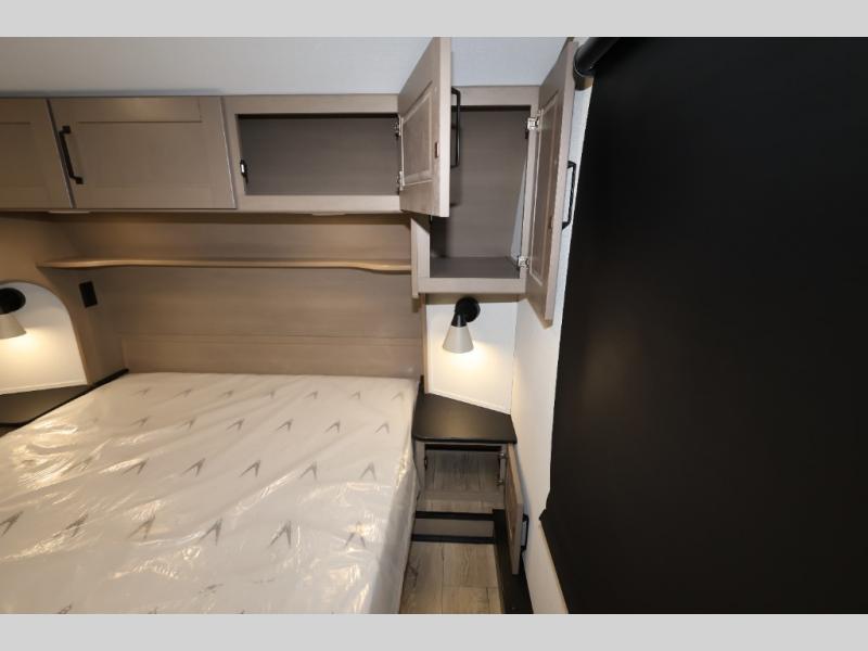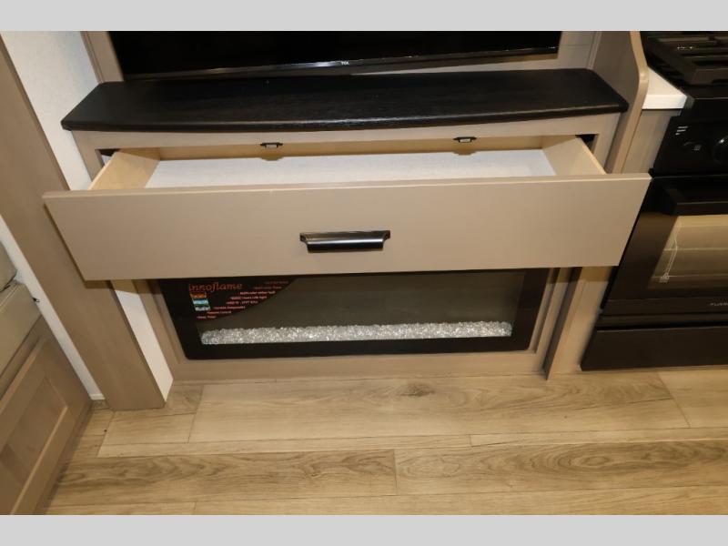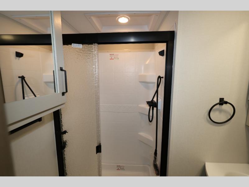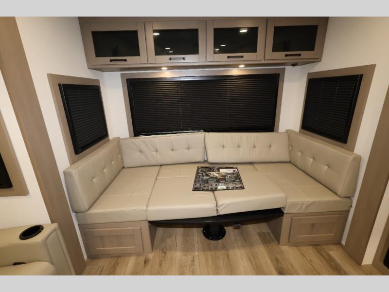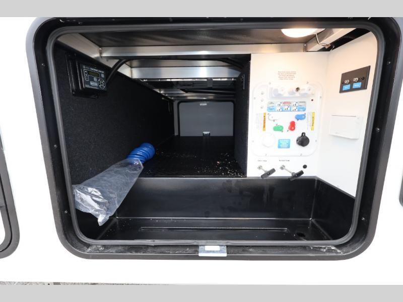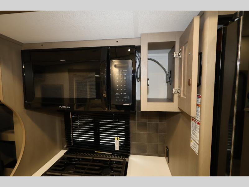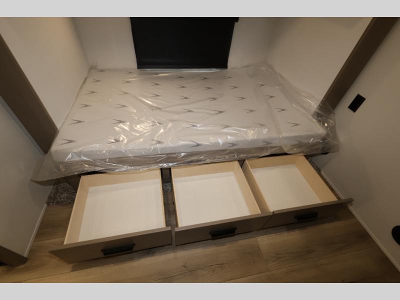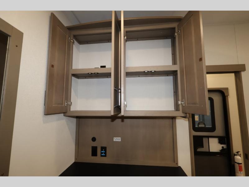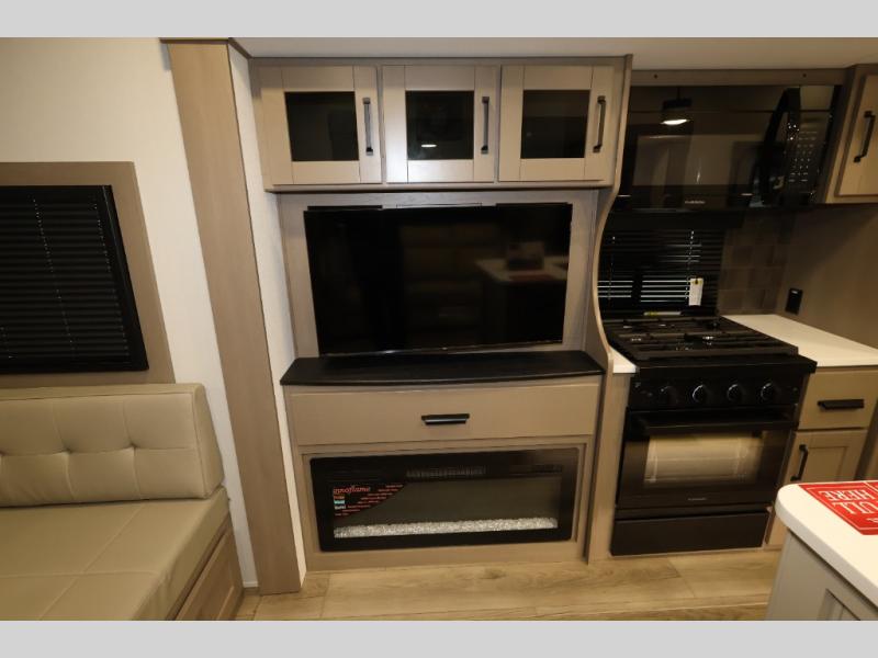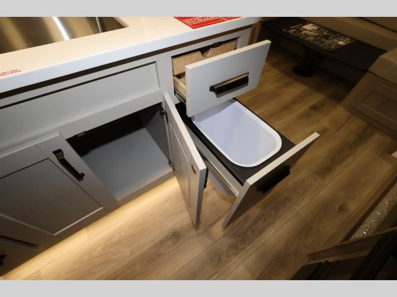 When you are looking for a versatile extra room for either a second bedroom or living area as well as an office, this middle bunkhouse might just work! There is a slide out with two bunks and drawers plus a dresser. You can sleep like a queen on the walk-around bed in the front private bedroom that offers more clothing storage and windows for views. The rear main living and kitchen area provides plenty of seating on the a 78" triple person theater seats, and on the 92" U-shaped lounge with table with windows within the slide for natural lighting and great views. The kitchen island gives the cook more space to make and serve meals, and the gourmet kitchen includes a 16 cu. ft. refrigerator, plus a pantry for dry goods. There is an exterior outside kitchen with a griddle and a 1.6 cu. ft. refrigerator for beverages and such, plus you will find an LP quick connect, Coax TV hookup, and a spray port to wash off your dirty shoes.