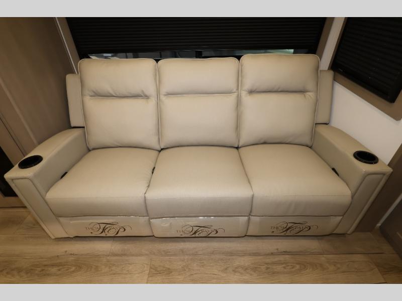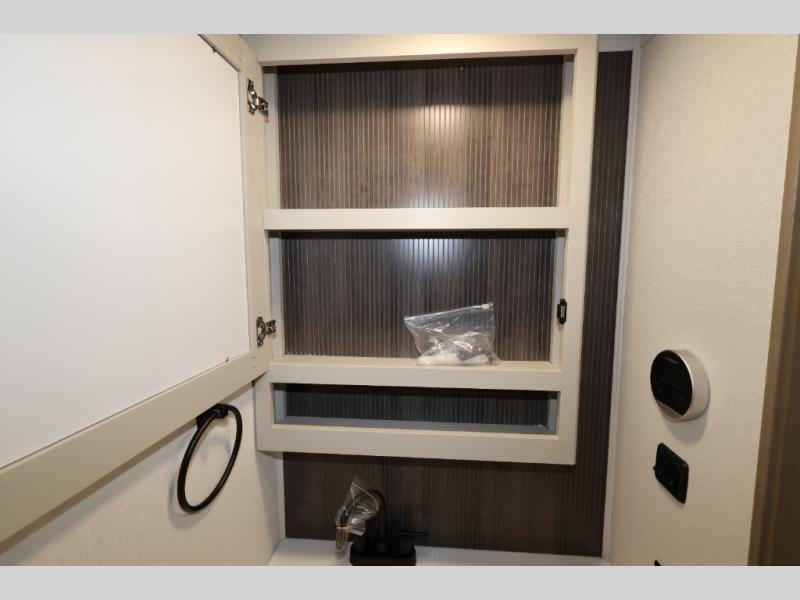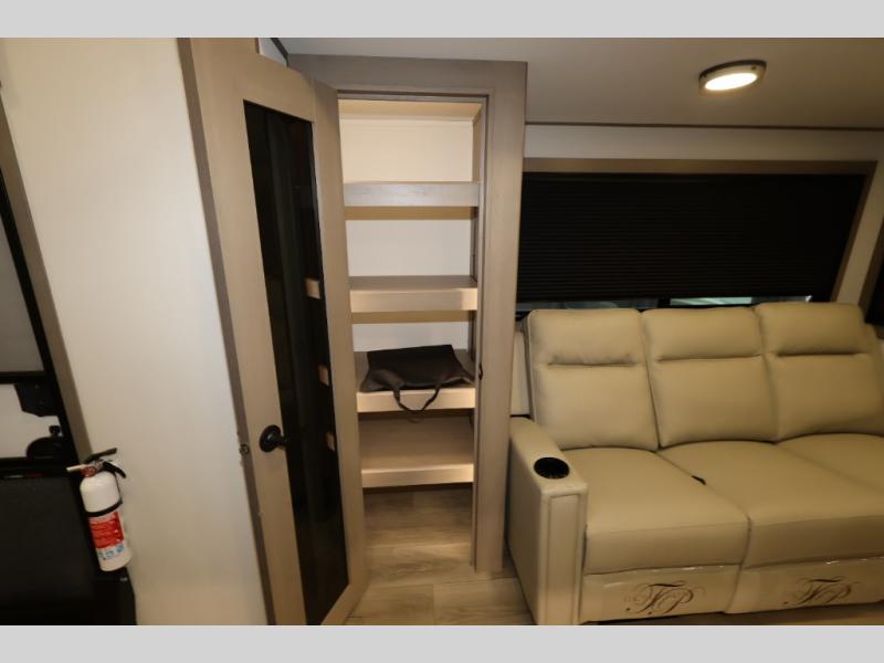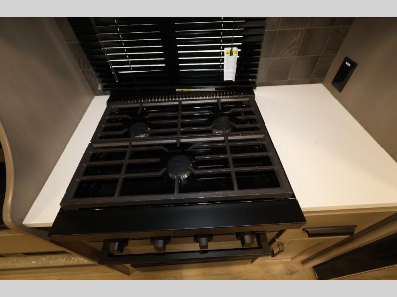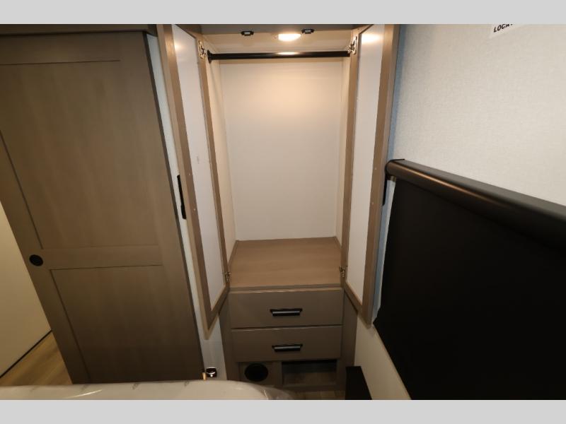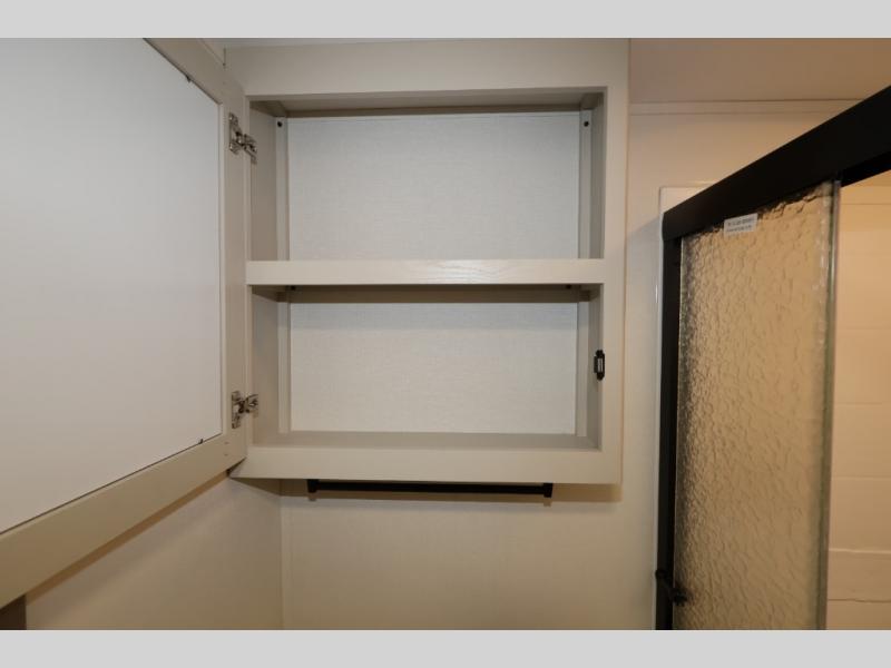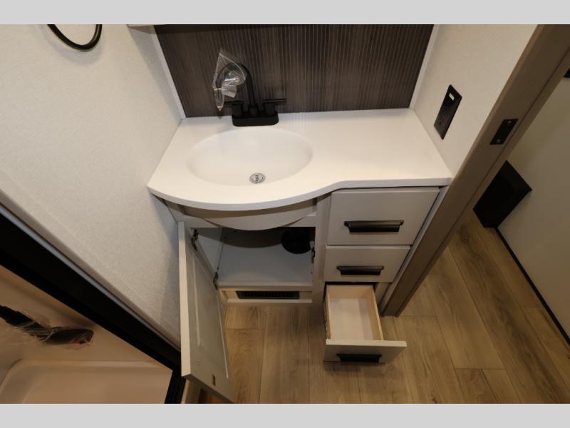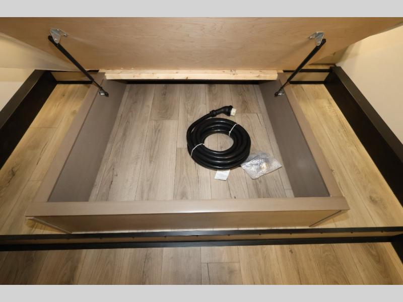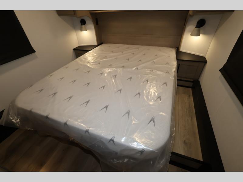 When you are looking for a versatile extra room for either a second bedroom or living area as well as an office, this middle bunkhouse might just work! There is a slide out with two bunks and drawers plus a dresser. You can sleep like a queen on the walk-around bed in the front private bedroom that offers more clothing storage and windows for views. The rear main living and kitchen area provides plenty of seating on the a 78" triple person theater seats, and on the 92" U-shaped lounge with table with windows within the slide for natural lighting and great views. The kitchen island gives the cook more space to make and serve meals, and the gourmet kitchen includes a 16 cu. ft. refrigerator, plus a pantry for dry goods. There is an exterior outside kitchen with a griddle and a 1.6 cu. ft. refrigerator for beverages and such, plus you will find an LP quick connect, Coax TV hookup, and a spray port to wash off your dirty shoes.