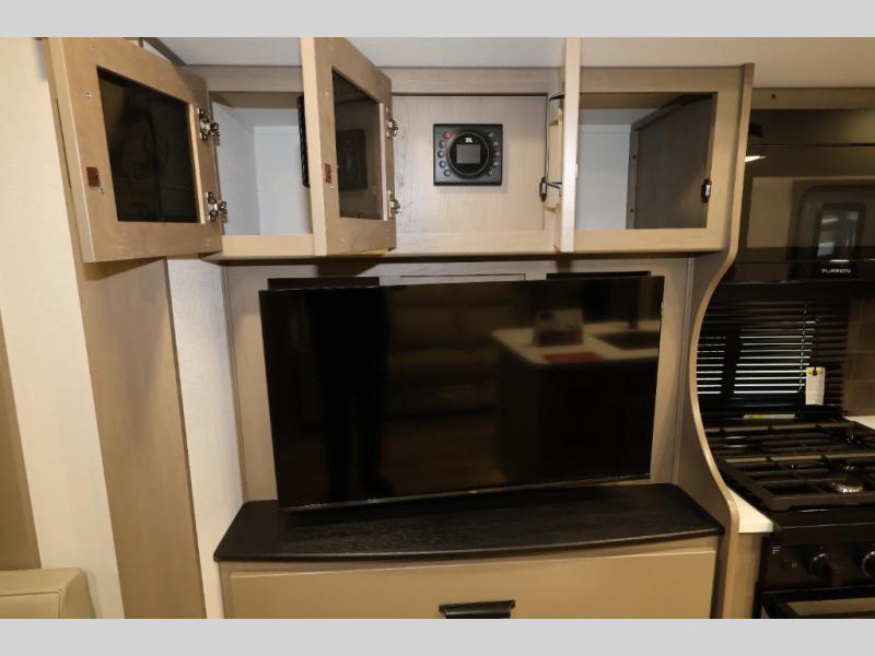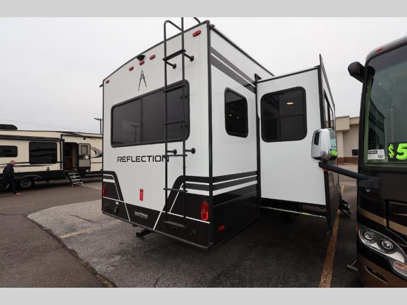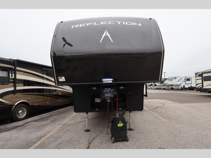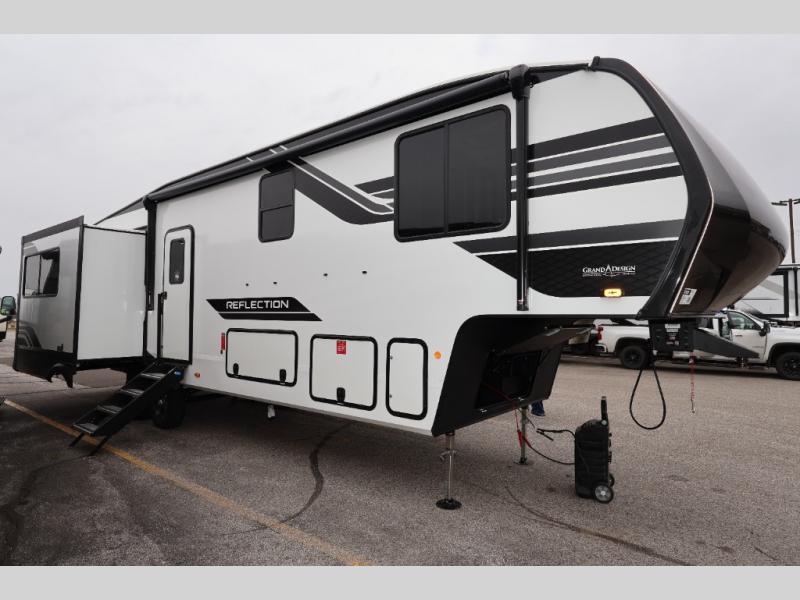 With any Reflection fifth wheel by Grand Design, you will have a solar panel for off-grid camping and a 60 amp charge controller and inverter prep, a Universal All-In-One docking station, unobstructed pass-through storage, and Goodyear Endurance tires. Each is constructed of gel coat exterior sidewalls, residential 5" truss rafters, walk-on roof decking, a fiberglass and radiant foil roof and front cap insulation plus laminated aluminum framed side walls, roof and end walls in slide rooms. Head inside to enjoy residential hardwood cabinet doors, premium Congoleum flooring, a spacious shower with a glass door, and many more comforts!