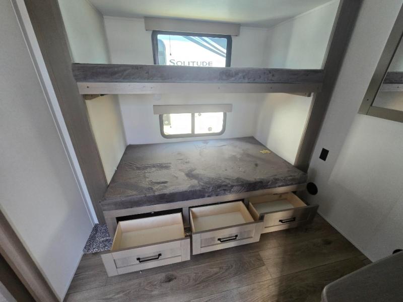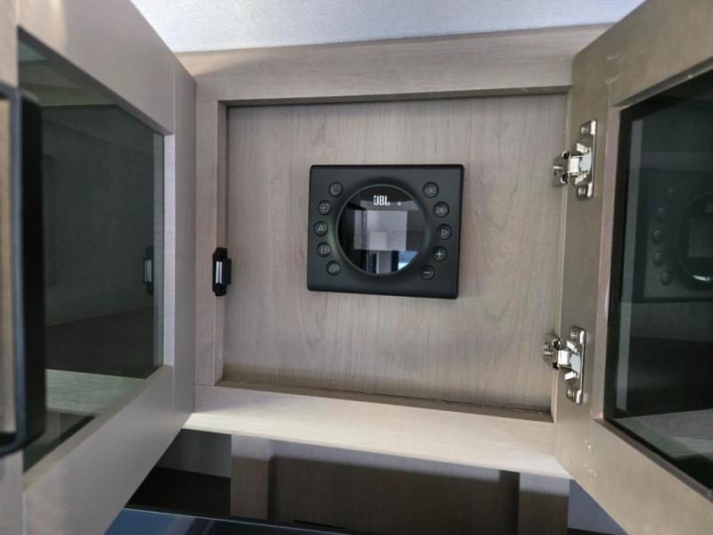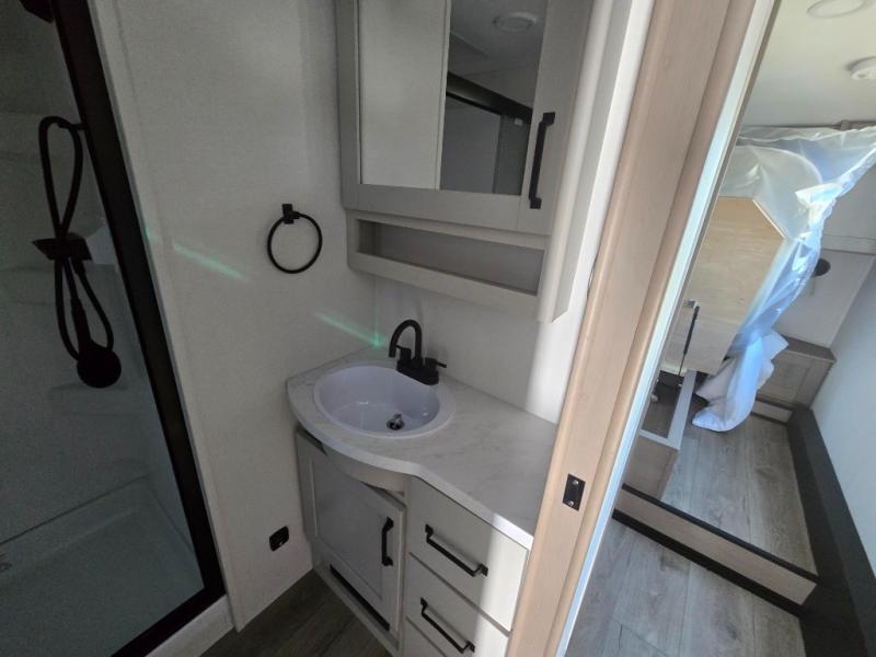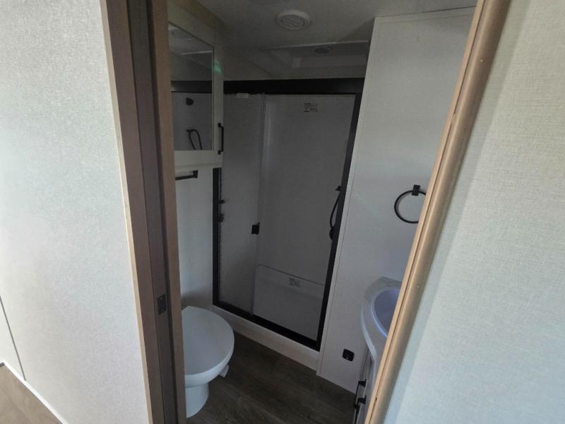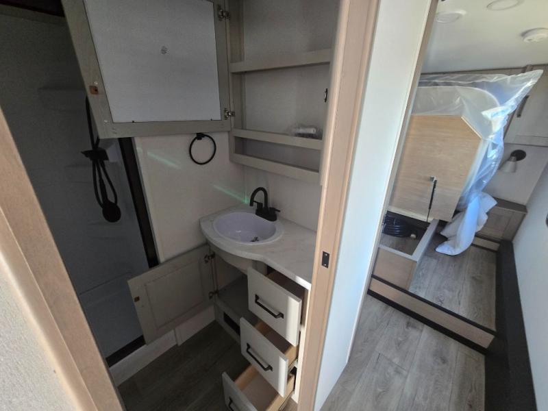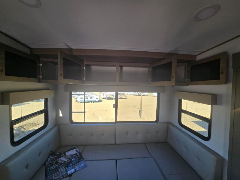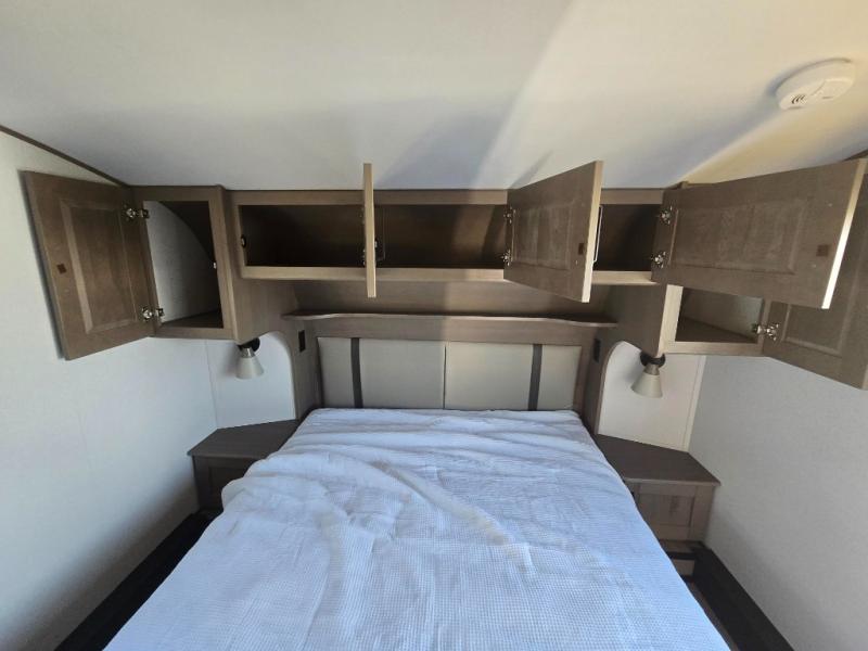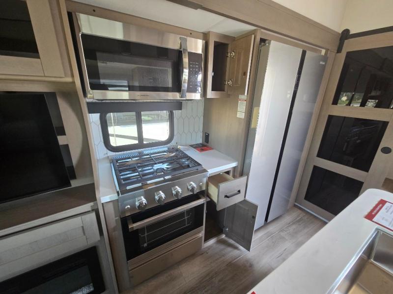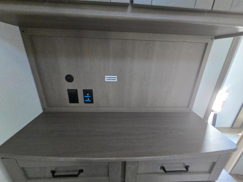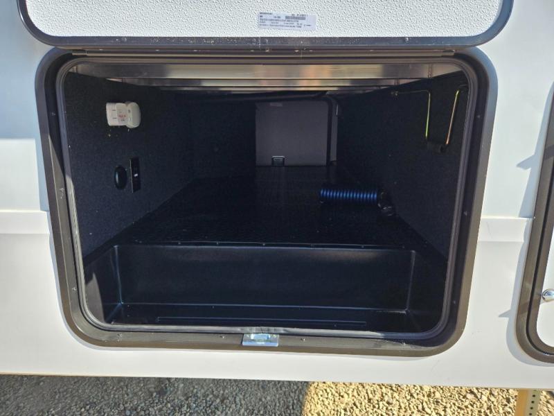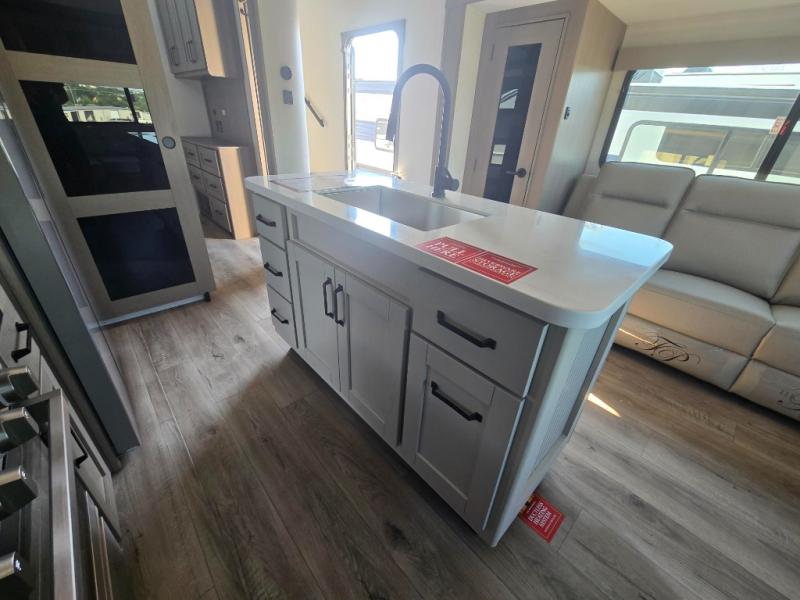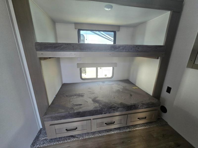 When you are looking for a versatile extra room for either a second bedroom or living area as well as an office, this middle bunkhouse might just work! There is a slide out with two bunks and drawers plus a dresser. You can sleep like a queen on the walk-around bed in the front private bedroom that offers more clothing storage and windows for views. The rear main living and kitchen area provides plenty of seating on the a 78" triple person theater seats, and on the 92" U-shaped lounge with table with windows within the slide for natural lighting and great views. The kitchen island gives the cook more space to make and serve meals, and the gourmet kitchen includes a 16 cu. ft. refrigerator, plus a pantry for dry goods. There is an exterior outside kitchen with a griddle and a 1.6 cu. ft. refrigerator for beverages and such, plus you will find an LP quick connect, Coax TV hookup, and a spray port to wash off your dirty shoes.