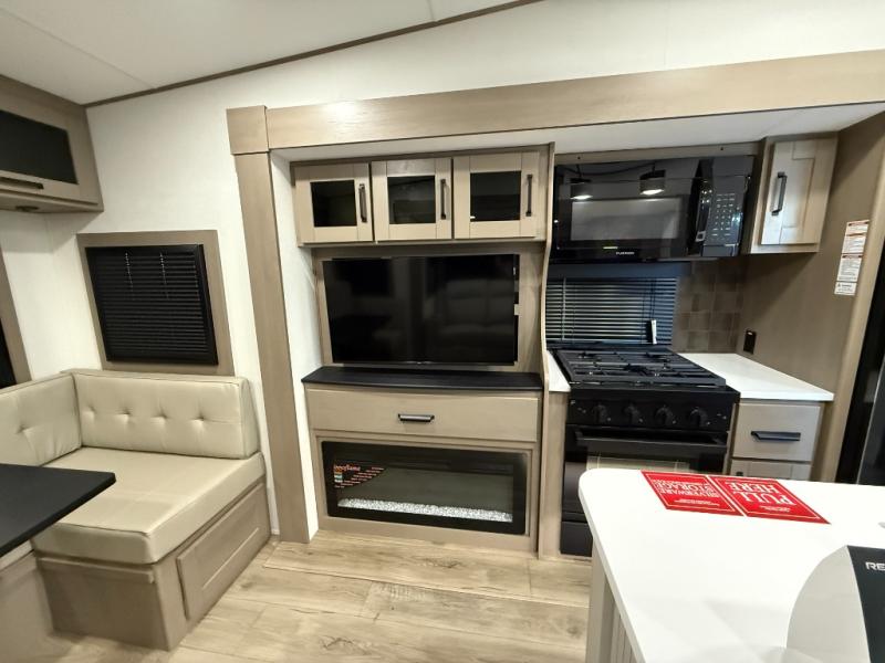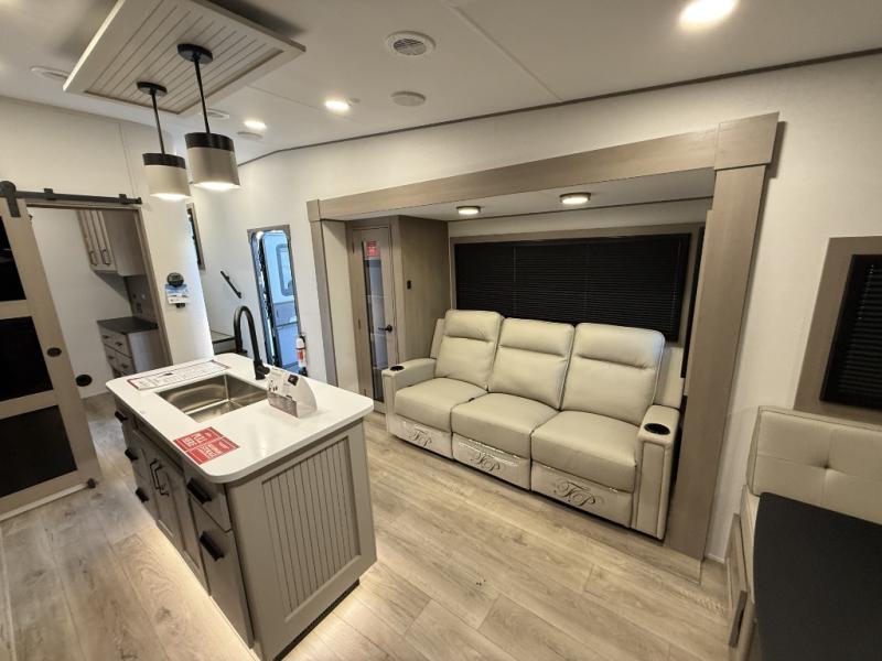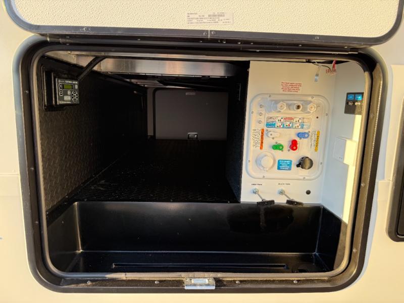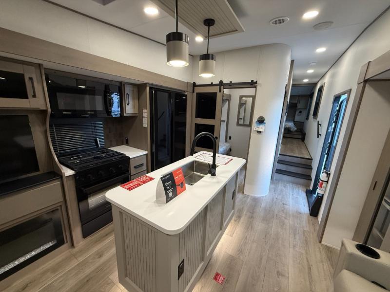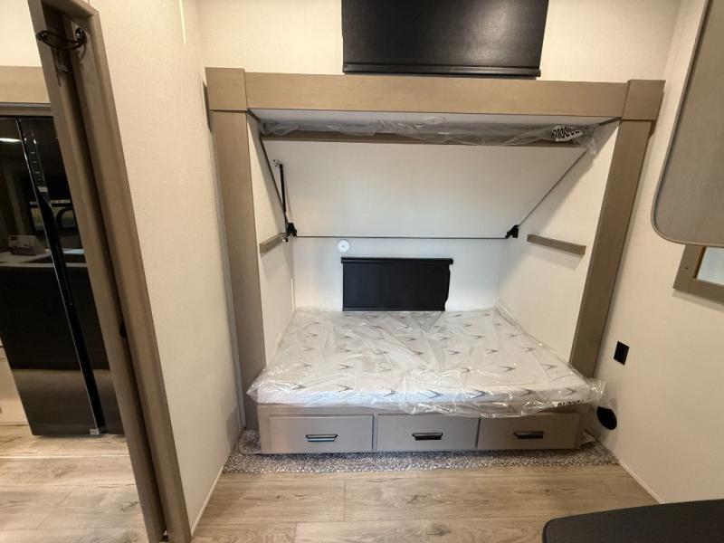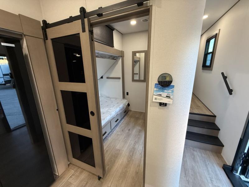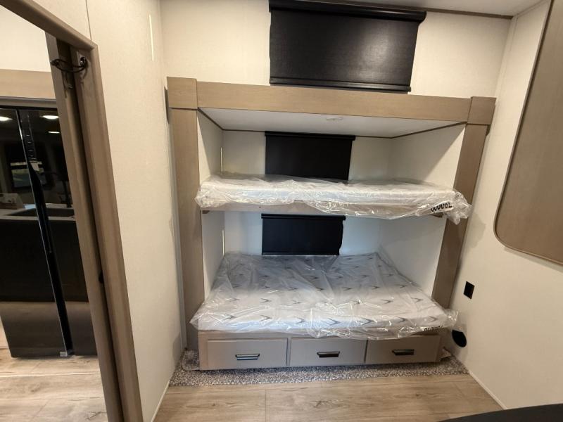 When you are looking for a versatile extra room for either a second bedroom or living area as well as an office, this middle bunkhouse might just work! There is a slide out with two bunks and drawers plus a dresser. You can sleep like a queen on the walk-around bed in the front private bedroom that offers more clothing storage and windows for views. The rear main living and kitchen area provides plenty of seating on the a 78" triple person theater seats, and on the 92" U-shaped lounge with table with windows within the slide for natural lighting and great views. The kitchen island gives the cook more space to make and serve meals, and the gourmet kitchen includes a 16 cu. ft. refrigerator, plus a pantry for dry goods. There is an exterior outside kitchen with a griddle and a 1.6 cu. ft. refrigerator for beverages and such, plus you will find an LP quick connect, Coax TV hookup, and a spray port to wash off your dirty shoes.