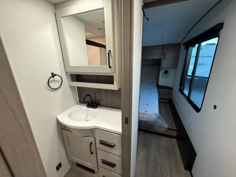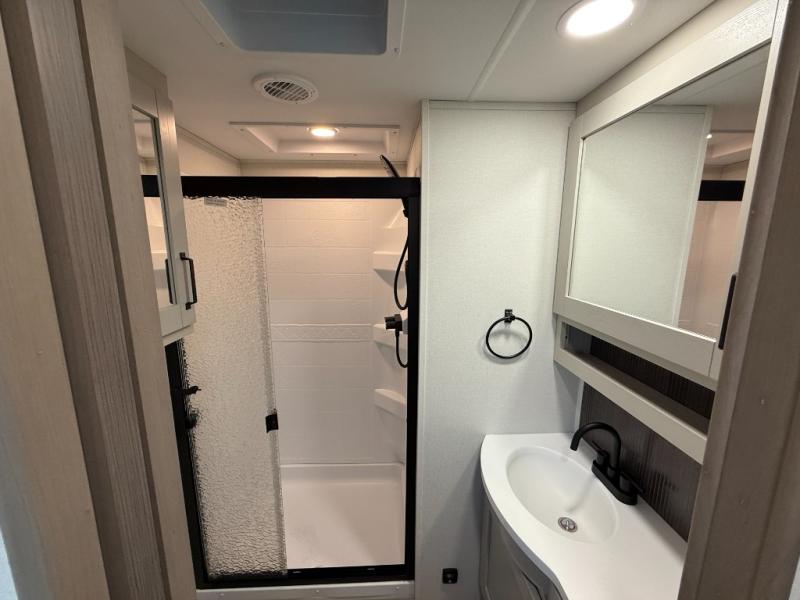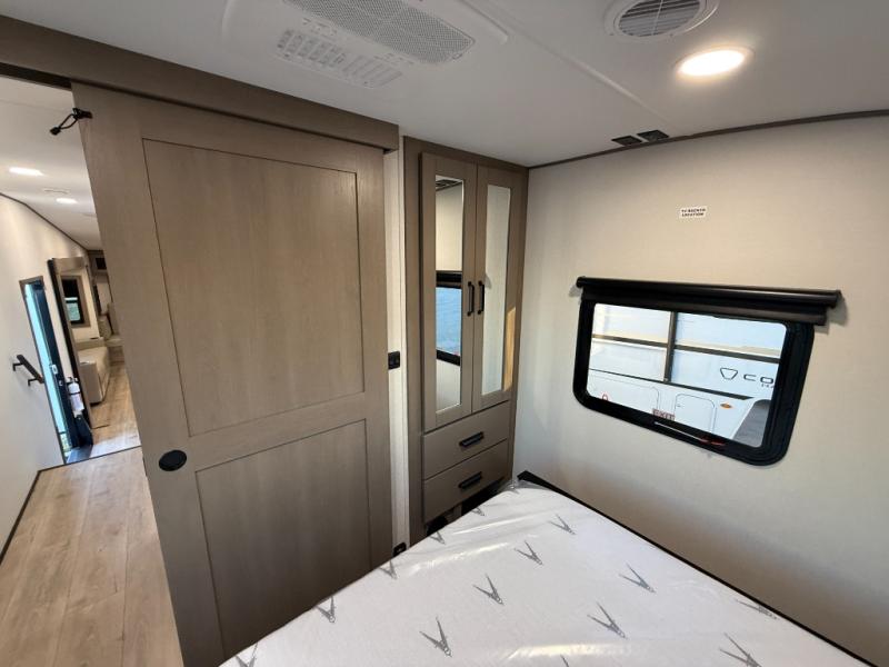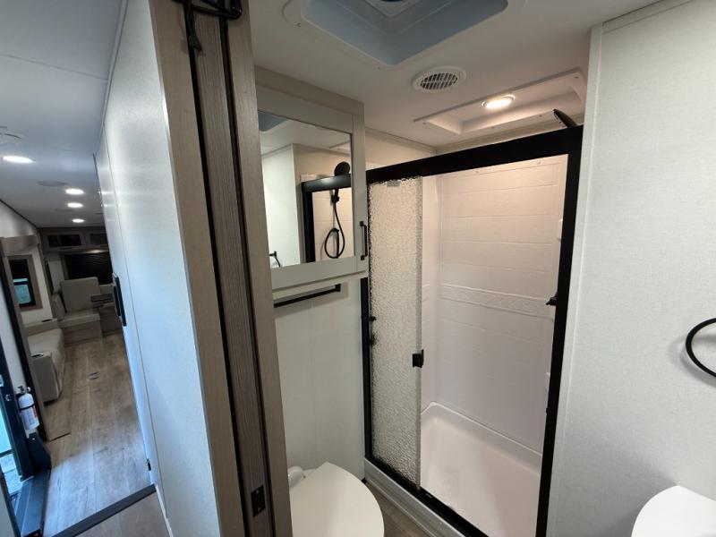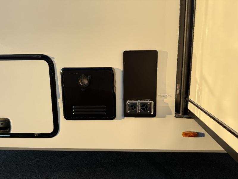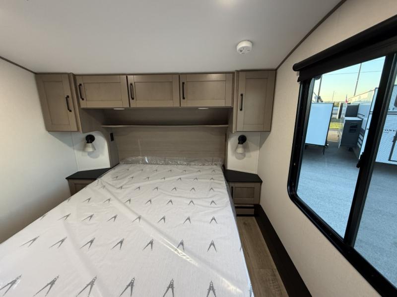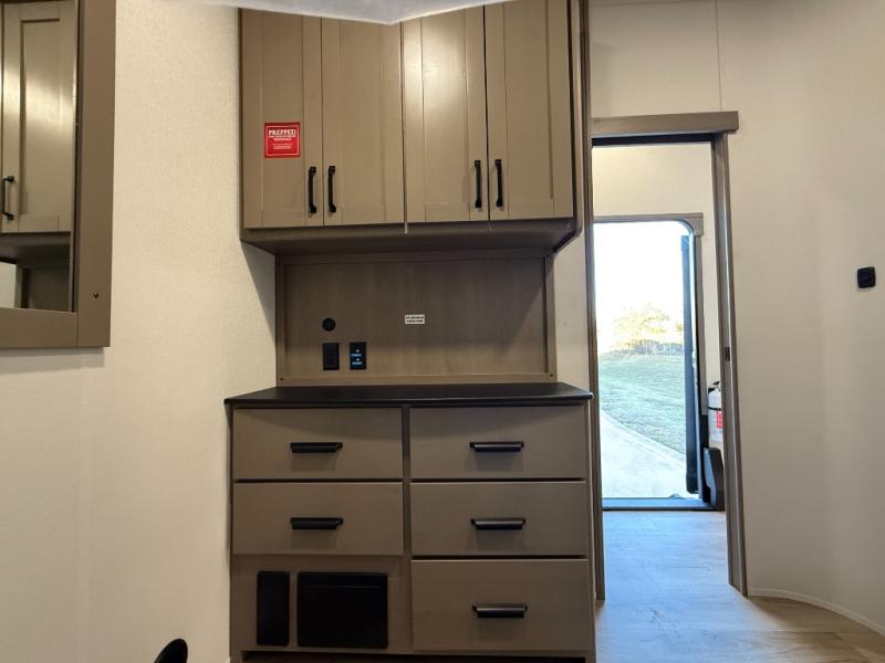 When you are looking for a versatile extra room for either a second bedroom or living area as well as an office, this middle bunkhouse might just work! There is a slide out with two bunks and drawers plus a dresser. You can sleep like a queen on the walk-around bed in the front private bedroom that offers more clothing storage and windows for views. The rear main living and kitchen area provides plenty of seating on the a 78" triple person theater seats, and on the 92" U-shaped lounge with table with windows within the slide for natural lighting and great views. The kitchen island gives the cook more space to make and serve meals, and the gourmet kitchen includes a 16 cu. ft. refrigerator, plus a pantry for dry goods. There is an exterior outside kitchen with a griddle and a 1.6 cu. ft. refrigerator for beverages and such, plus you will find an LP quick connect, Coax TV hookup, and a spray port to wash off your dirty shoes.