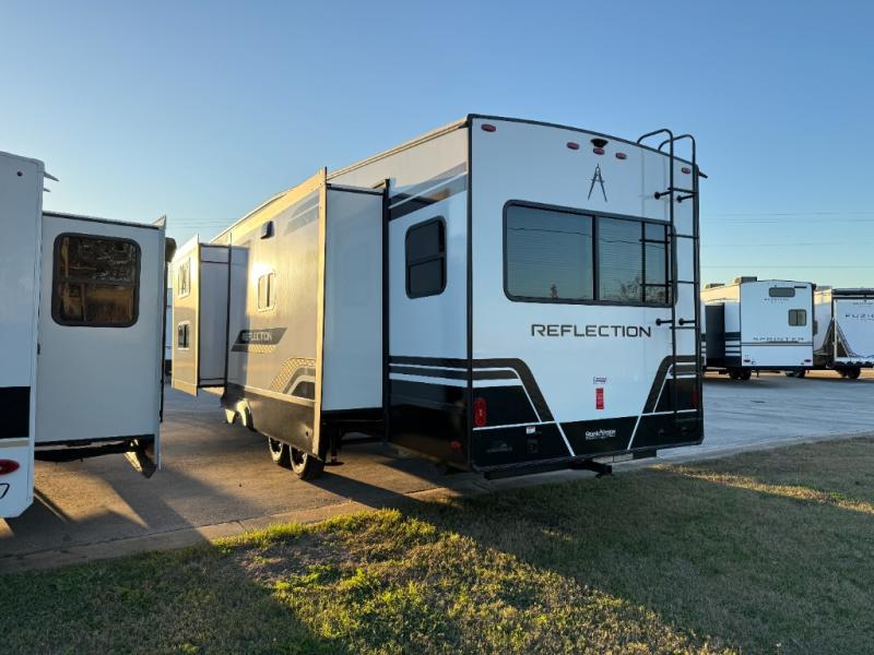 With any Reflection fifth wheel by Grand Design, you will have a solar panel for off-grid camping and a 60 amp charge controller and inverter prep, a Universal All-In-One docking station, unobstructed pass-through storage, and Goodyear Endurance tires. Each is constructed of gel coat exterior sidewalls, residential 5" truss rafters, walk-on roof decking, a fiberglass and radiant foil roof and front cap insulation plus laminated aluminum framed side walls, roof and end walls in slide rooms. Head inside to enjoy residential hardwood cabinet doors, premium Congoleum flooring, a spacious shower with a glass door, and many more comforts!