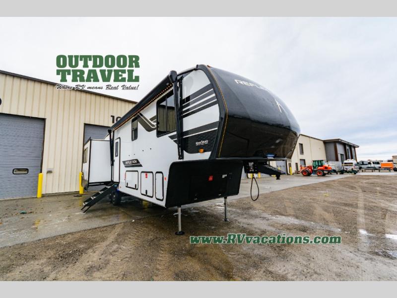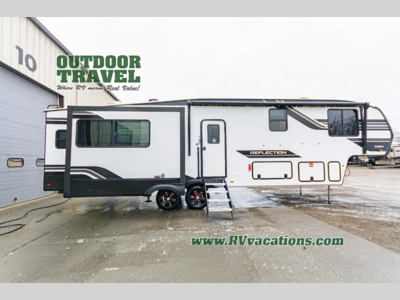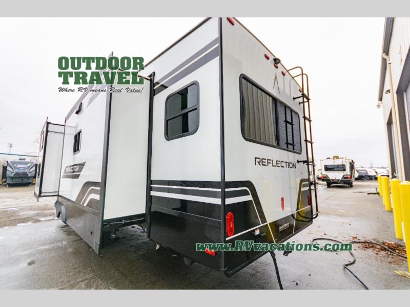 With any Reflection fifth wheel by Grand Design, you will have a solar panel for off-grid camping and a 60 amp charge controller and inverter prep, a Universal All-In-One docking station, unobstructed pass-through storage, and Goodyear Endurance tires. Each is constructed of gel coat exterior sidewalls, residential 5" truss rafters, walk-on roof decking, a fiberglass and radiant foil roof and front cap insulation plus laminated aluminum framed side walls, roof and end walls in slide rooms. Head inside to enjoy residential hardwood cabinet doors, premium Congoleum flooring, a spacious shower with a glass door, and many more comforts!