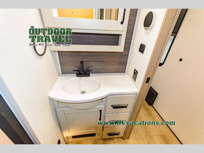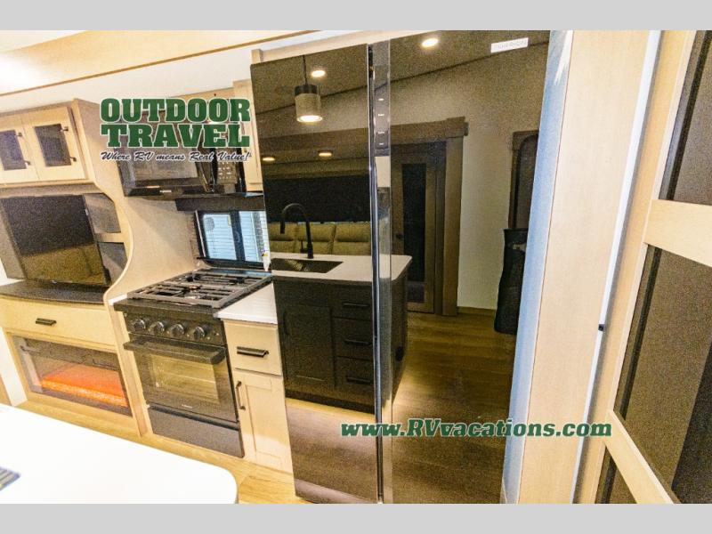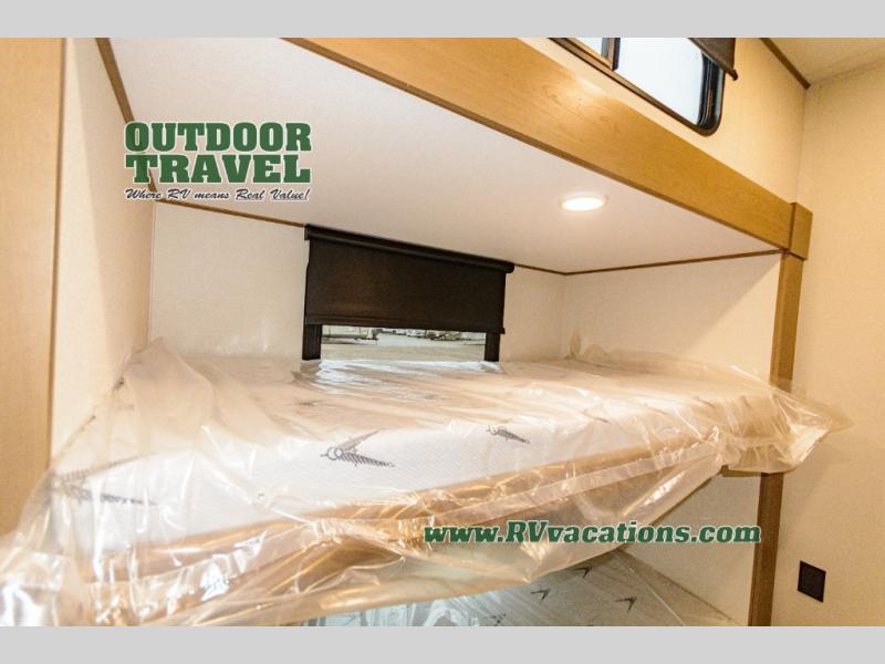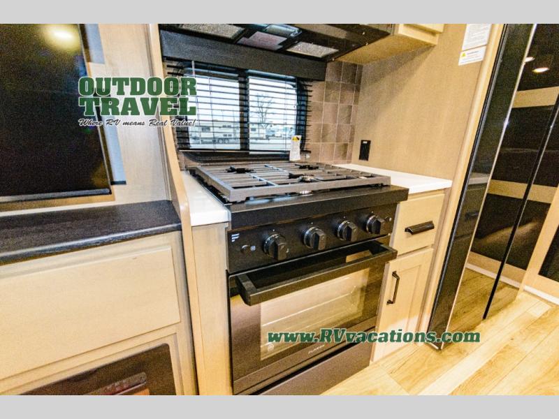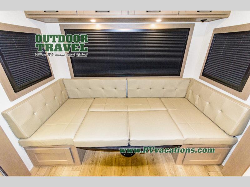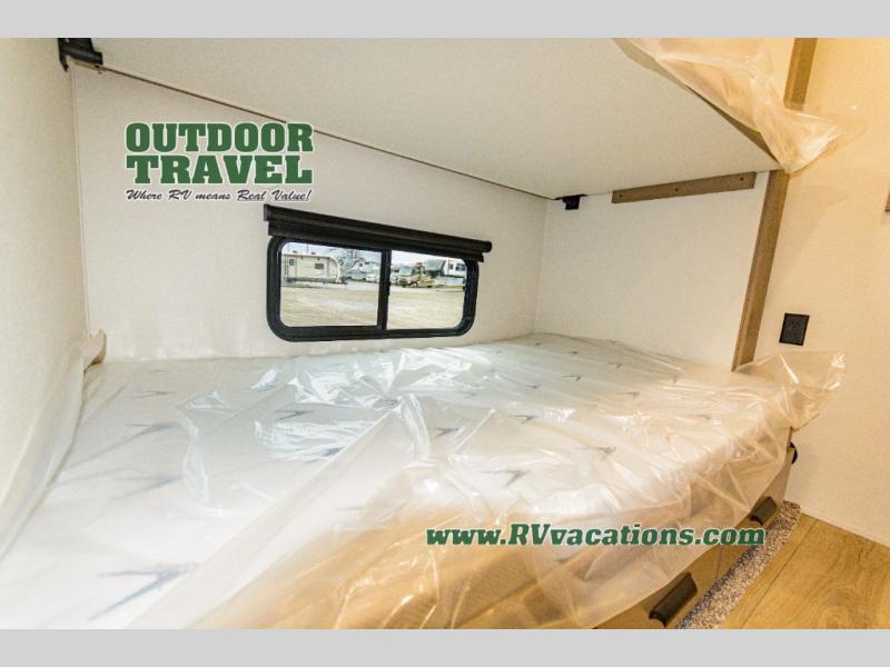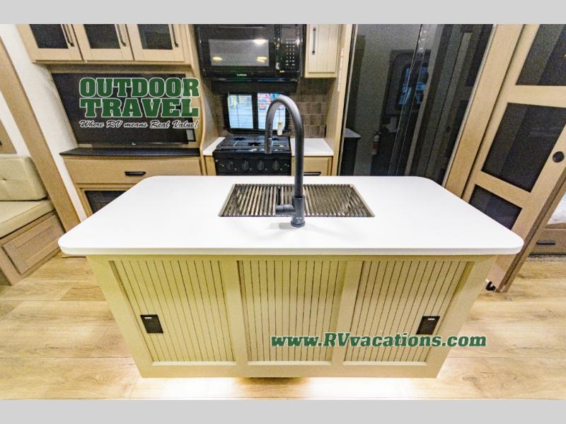 When you are looking for a versatile extra room for either a second bedroom or living area as well as an office, this middle bunkhouse might just work! There is a slide out with two bunks and drawers plus a dresser. You can sleep like a queen on the walk-around bed in the front private bedroom that offers more clothing storage and windows for views. The rear main living and kitchen area provides plenty of seating on the a 78" triple person theater seats, and on the 92" U-shaped lounge with table with windows within the slide for natural lighting and great views. The kitchen island gives the cook more space to make and serve meals, and the gourmet kitchen includes a 16 cu. ft. refrigerator, plus a pantry for dry goods. There is an exterior outside kitchen with a griddle and a 1.6 cu. ft. refrigerator for beverages and such, plus you will find an LP quick connect, Coax TV hookup, and a spray port to wash off your dirty shoes.