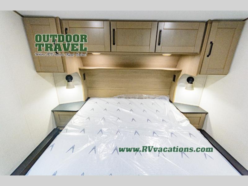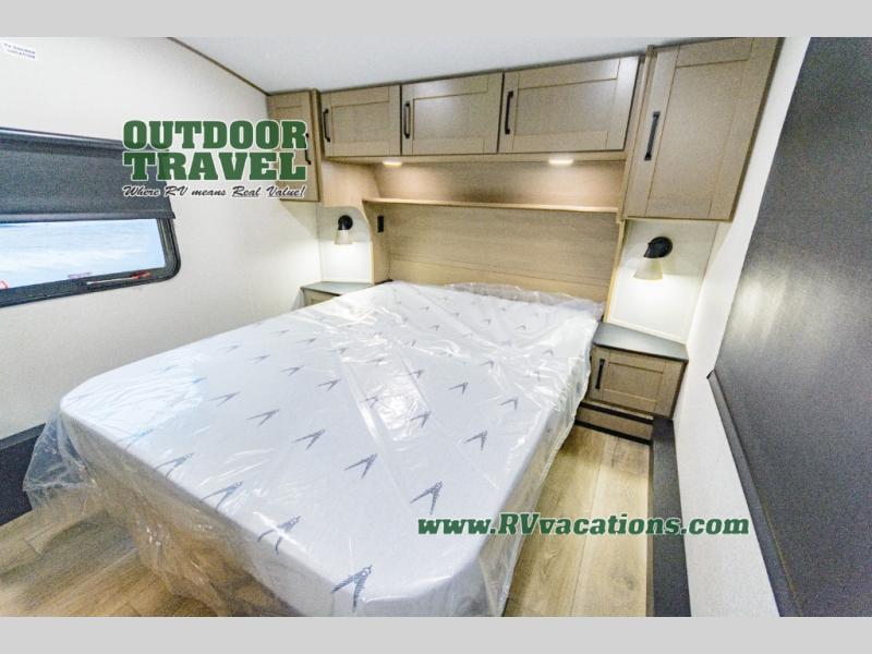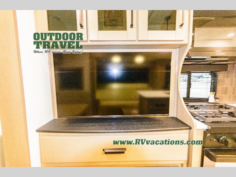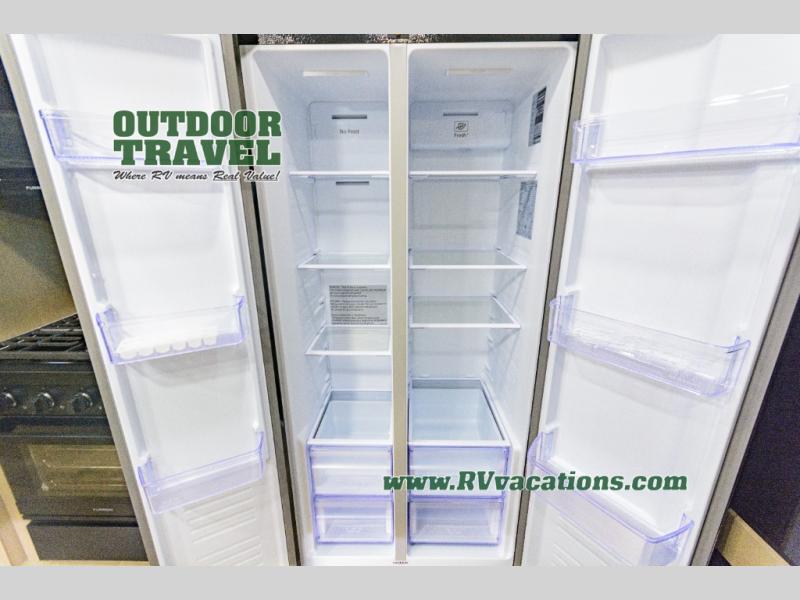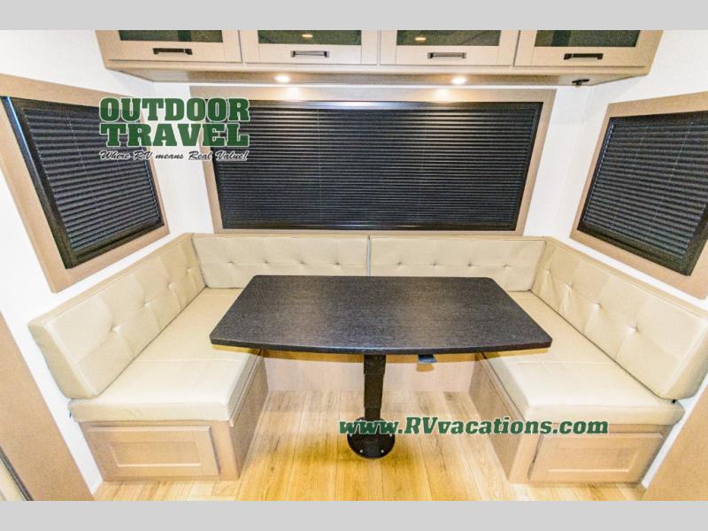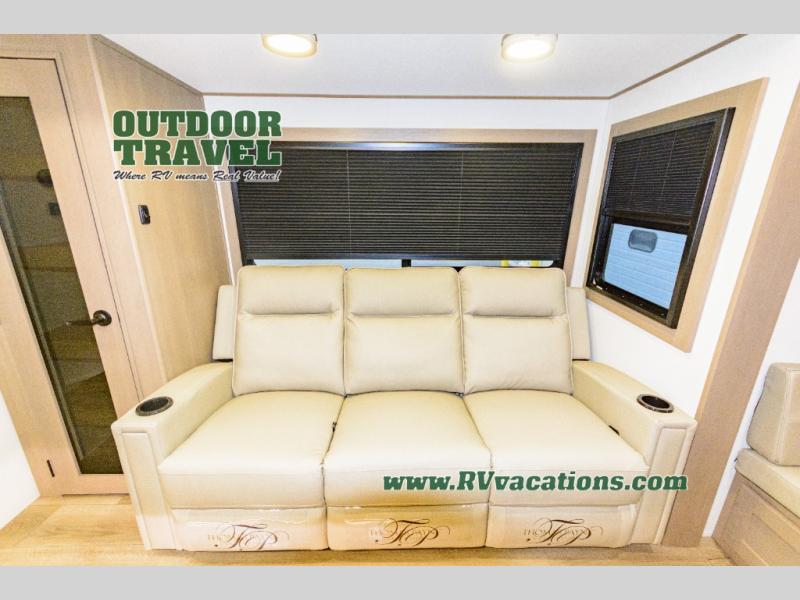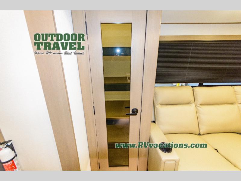 When you are looking for a versatile extra room for either a second bedroom or living area as well as an office, this middle bunkhouse might just work! There is a slide out with two bunks and drawers plus a dresser. You can sleep like a queen on the walk-around bed in the front private bedroom that offers more clothing storage and windows for views. The rear main living and kitchen area provides plenty of seating on the a 78" triple person theater seats, and on the 92" U-shaped lounge with table with windows within the slide for natural lighting and great views. The kitchen island gives the cook more space to make and serve meals, and the gourmet kitchen includes a 16 cu. ft. refrigerator, plus a pantry for dry goods. There is an exterior outside kitchen with a griddle and a 1.6 cu. ft. refrigerator for beverages and such, plus you will find an LP quick connect, Coax TV hookup, and a spray port to wash off your dirty shoes.