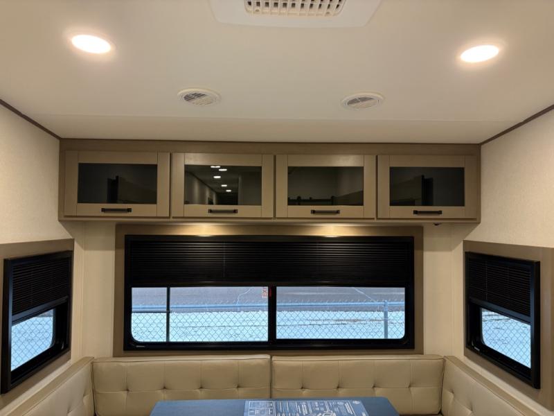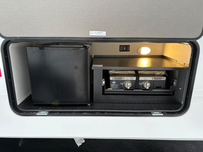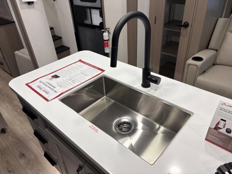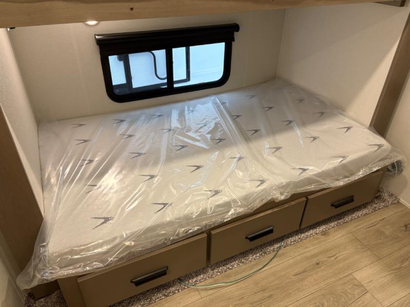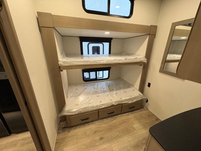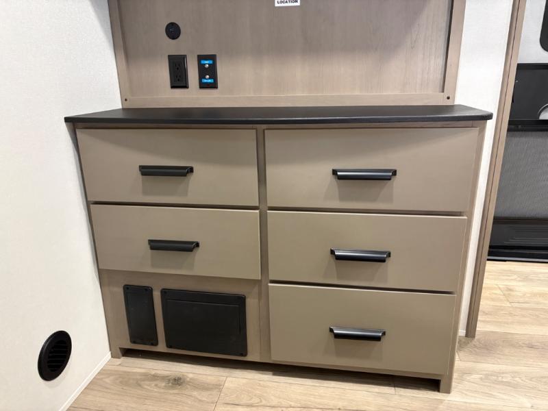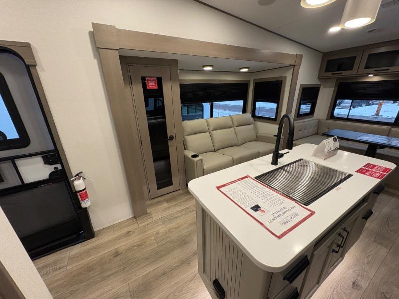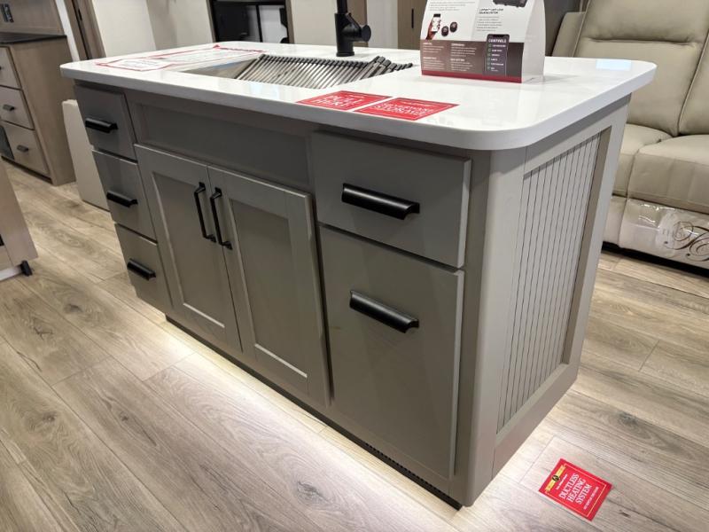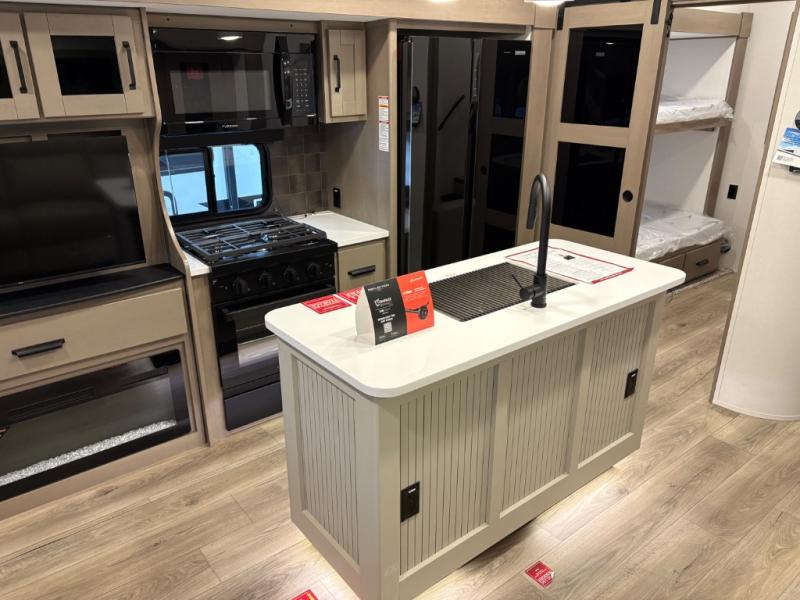 When you are looking for a versatile extra room for either a second bedroom or living area as well as an office, this middle bunkhouse might just work! There is a slide out with two bunks and drawers plus a dresser. You can sleep like a queen on the walk-around bed in the front private bedroom that offers more clothing storage and windows for views. The rear main living and kitchen area provides plenty of seating on the a 78" triple person theater seats, and on the 92" U-shaped lounge with table with windows within the slide for natural lighting and great views. The kitchen island gives the cook more space to make and serve meals, and the gourmet kitchen includes a 16 cu. ft. refrigerator, plus a pantry for dry goods. There is an exterior outside kitchen with a griddle and a 1.6 cu. ft. refrigerator for beverages and such, plus you will find an LP quick connect, Coax TV hookup, and a spray port to wash off your dirty shoes.