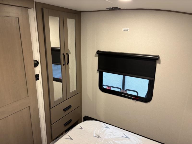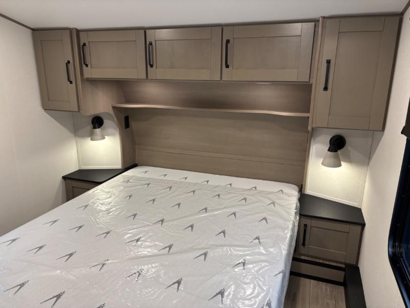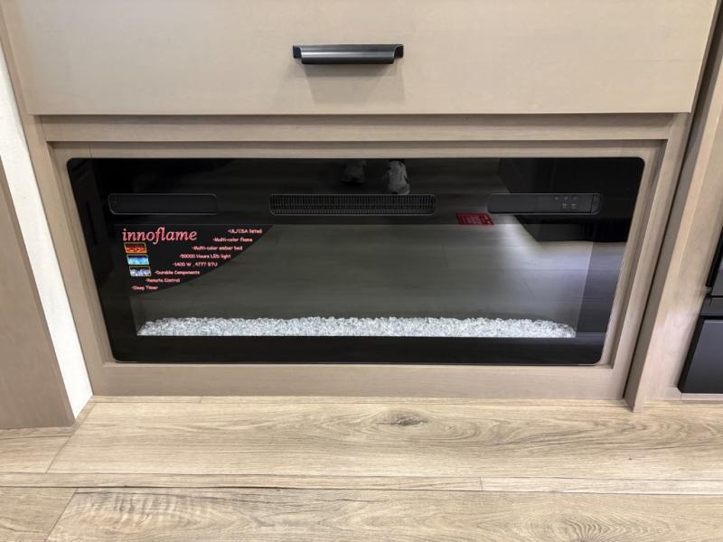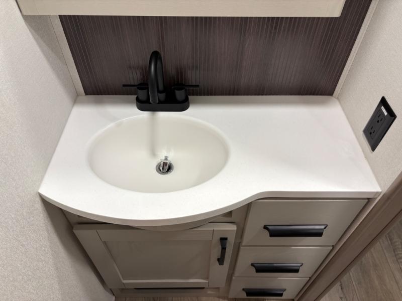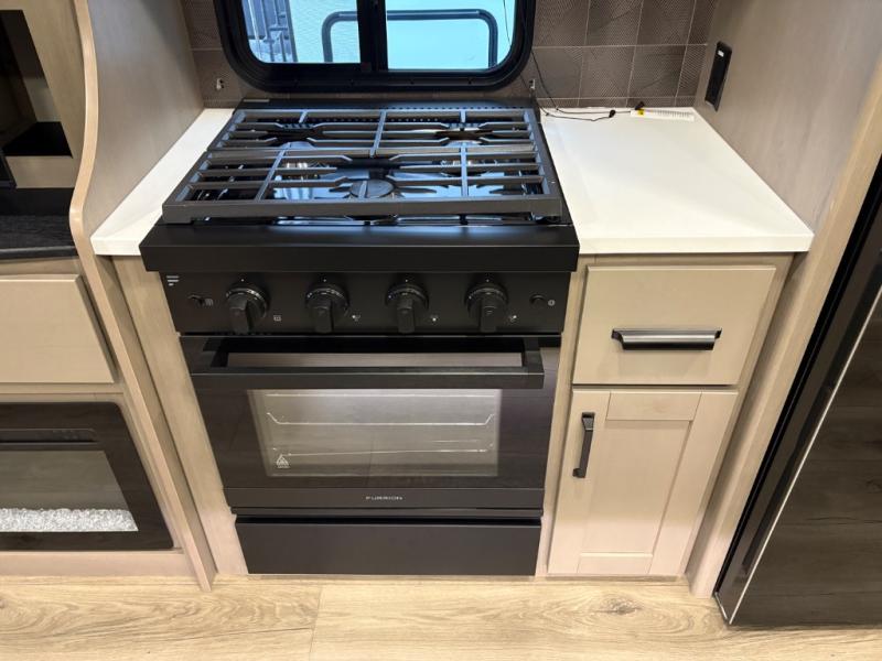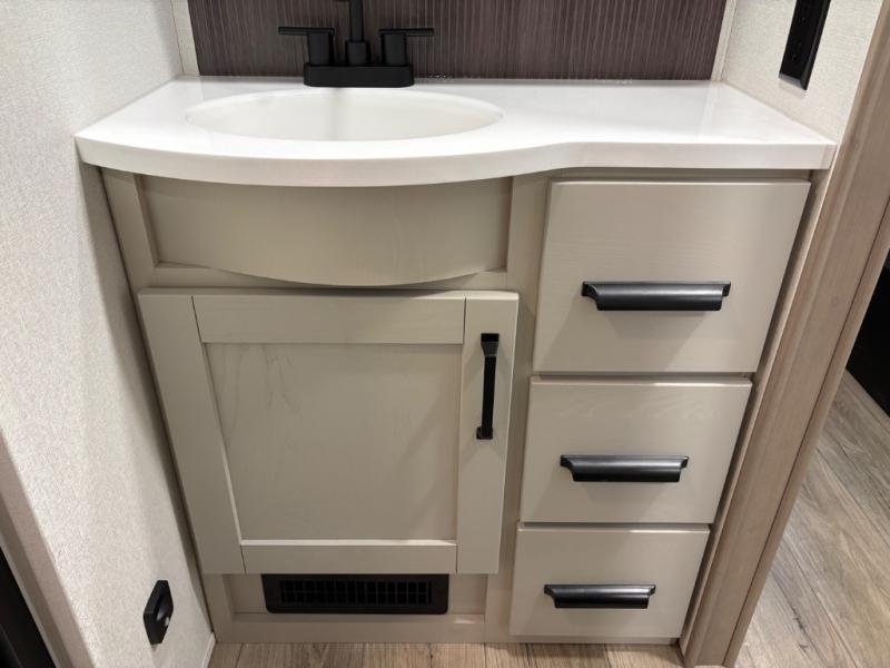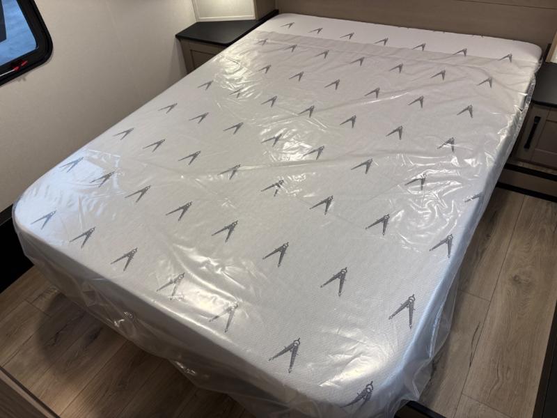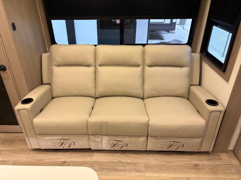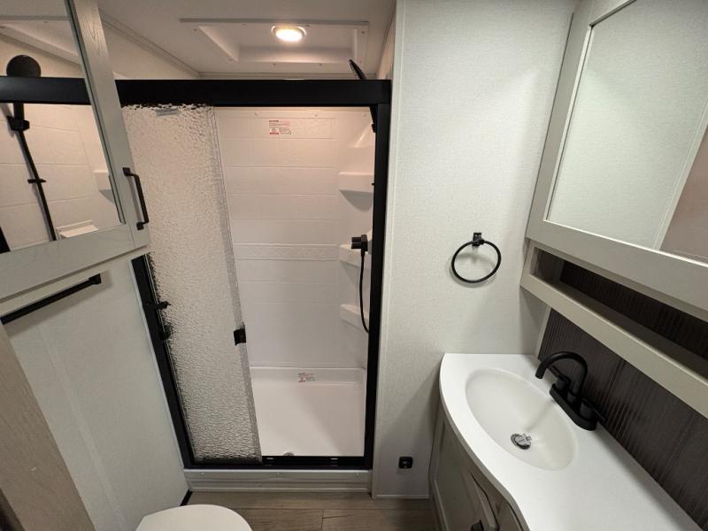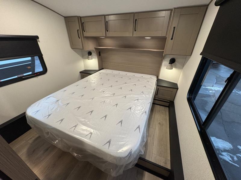 When you are looking for a versatile extra room for either a second bedroom or living area as well as an office, this middle bunkhouse might just work! There is a slide out with two bunks and drawers plus a dresser. You can sleep like a queen on the walk-around bed in the front private bedroom that offers more clothing storage and windows for views. The rear main living and kitchen area provides plenty of seating on the a 78" triple person theater seats, and on the 92" U-shaped lounge with table with windows within the slide for natural lighting and great views. The kitchen island gives the cook more space to make and serve meals, and the gourmet kitchen includes a 16 cu. ft. refrigerator, plus a pantry for dry goods. There is an exterior outside kitchen with a griddle and a 1.6 cu. ft. refrigerator for beverages and such, plus you will find an LP quick connect, Coax TV hookup, and a spray port to wash off your dirty shoes.