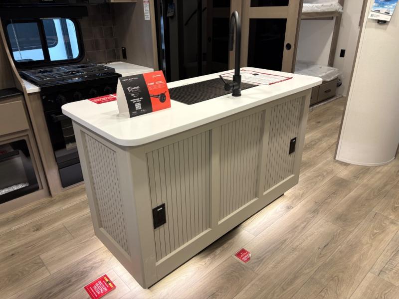 With any Reflection fifth wheel by Grand Design, you will have a solar panel for off-grid camping and a 60 amp charge controller and inverter prep, a Universal All-In-One docking station, unobstructed pass-through storage, and Goodyear Endurance tires. Each is constructed of gel coat exterior sidewalls, residential 5" truss rafters, walk-on roof decking, a fiberglass and radiant foil roof and front cap insulation plus laminated aluminum framed side walls, roof and end walls in slide rooms. Head inside to enjoy residential hardwood cabinet doors, premium Congoleum flooring, a spacious shower with a glass door, and many more comforts!