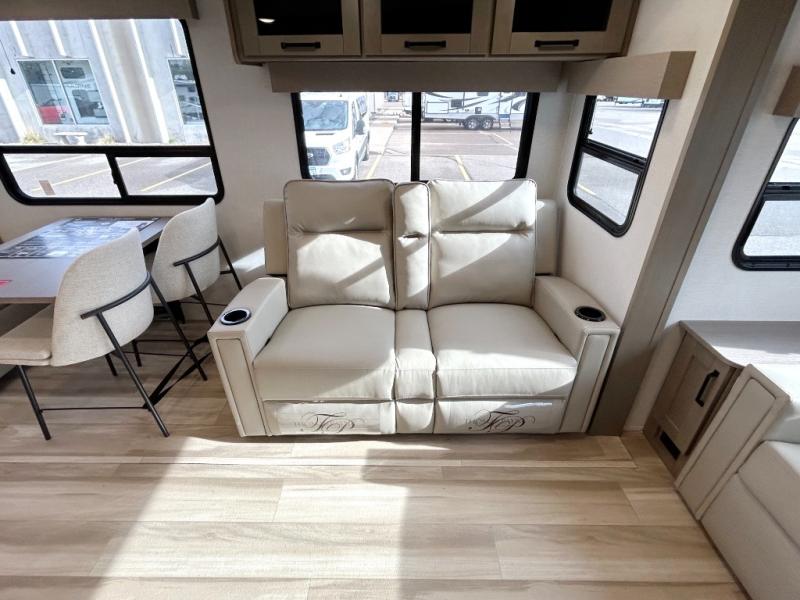 You can enjoy a spacious rear living area in this RV with dual opposing slides offering you entertainment, kitchen amenities, seating and windows for great views! The rear tri-fold sofa also converts into extra sleeping space for an extra guest or two, just like the booth dinette does. Yet you might like to add the swivel dinette option. There are theater seats to enjoy while you place your drinks in the cupholders and watch the entertainment center with a 40" LED HDTV and fireplace. The pantry is big enough to store your favorite snacks, and the kitchen island will make meal prepping easier, plus there is a 16 cu. ft. refrigerator to store any leftovers. The full bathroom has a 30" x 48" fiberglass shower and a linen closet to store your towels. The front private bedroom has a comfortable queen bed slide that can be switched out for the optional king bed, a dresser with overhead cabinets, and a full wall wardrobe that is prepped to add the optional washer and dryer so that you can extend your camping trip with clean clothes!