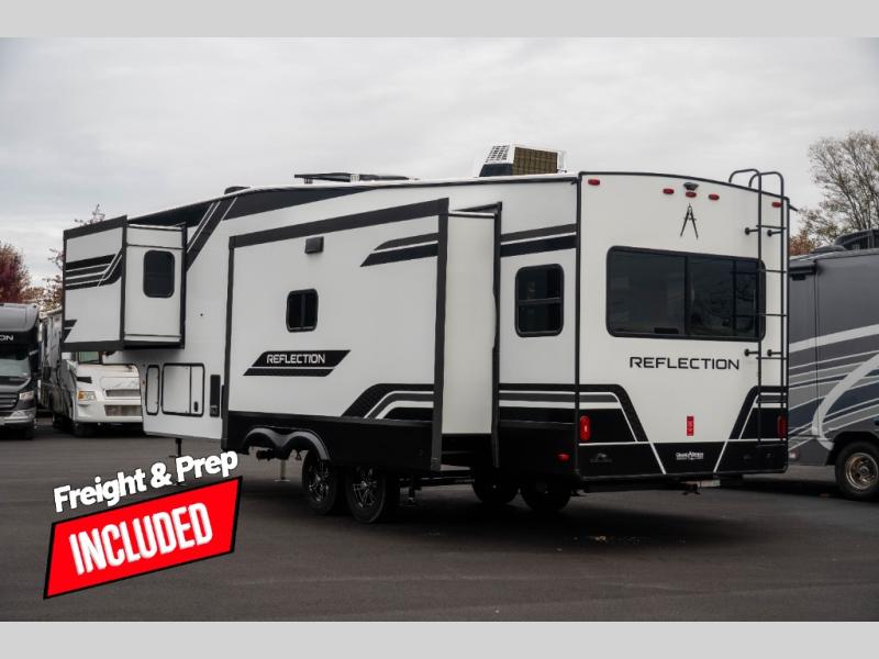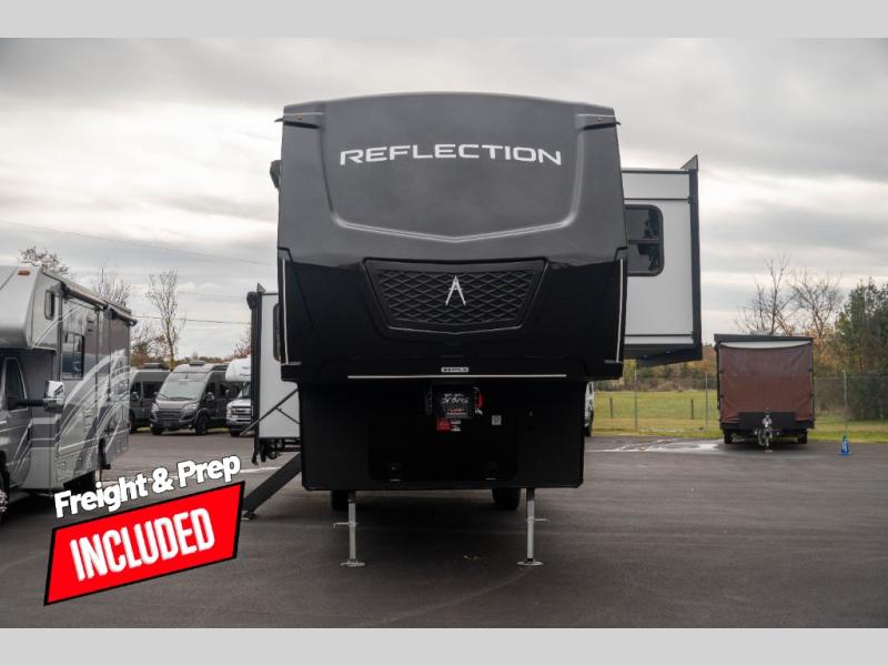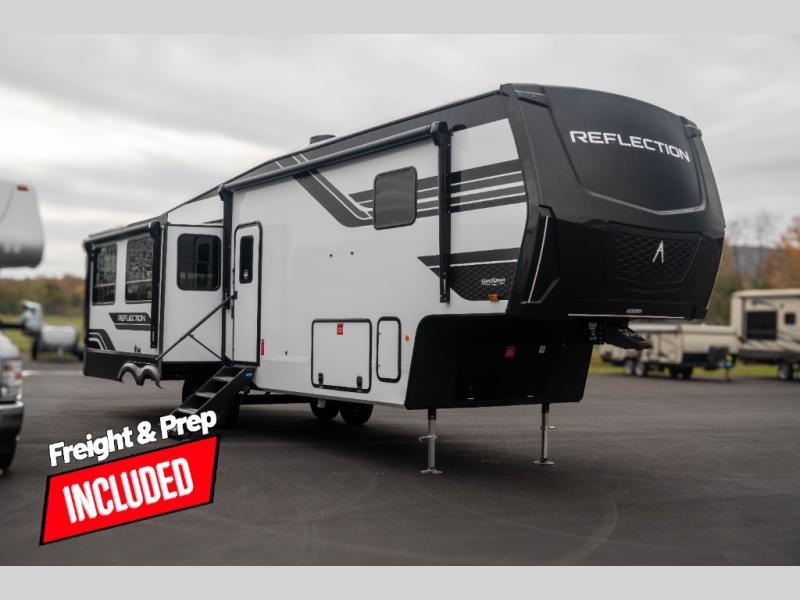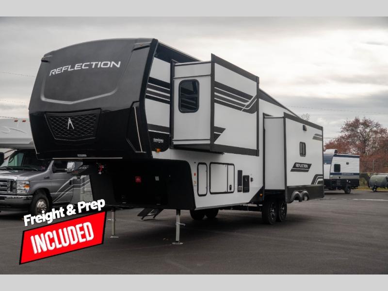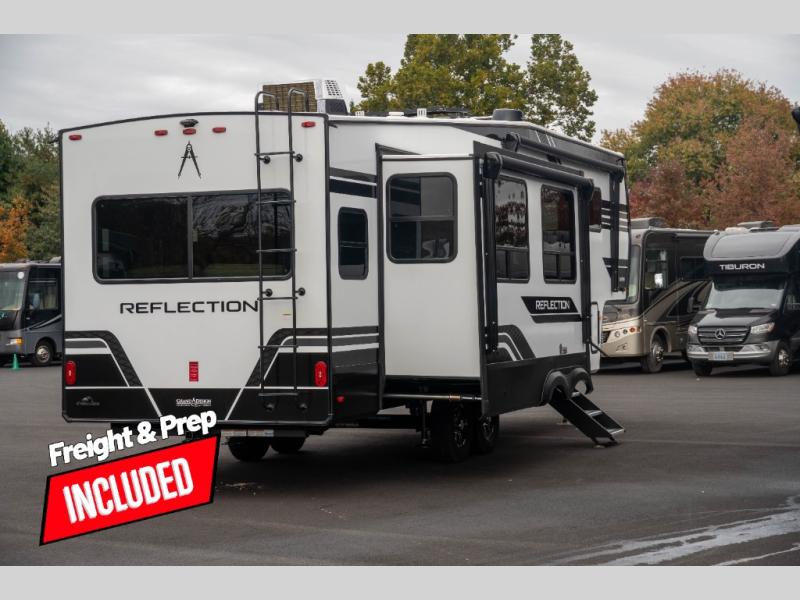 With any Reflection fifth wheel by Grand Design, you will have a solar panel for off-grid camping and a 60 amp charge controller and inverter prep, a Universal All-In-One docking station, unobstructed pass-through storage, and Goodyear Endurance tires. Each is constructed of gel coat exterior sidewalls, residential 5" truss rafters, walk-on roof decking, a fiberglass and radiant foil roof and front cap insulation plus laminated aluminum framed side walls, roof and end walls in slide rooms. Head inside to enjoy residential hardwood cabinet doors, premium Congoleum flooring, a spacious shower with a glass door, and many more comforts!