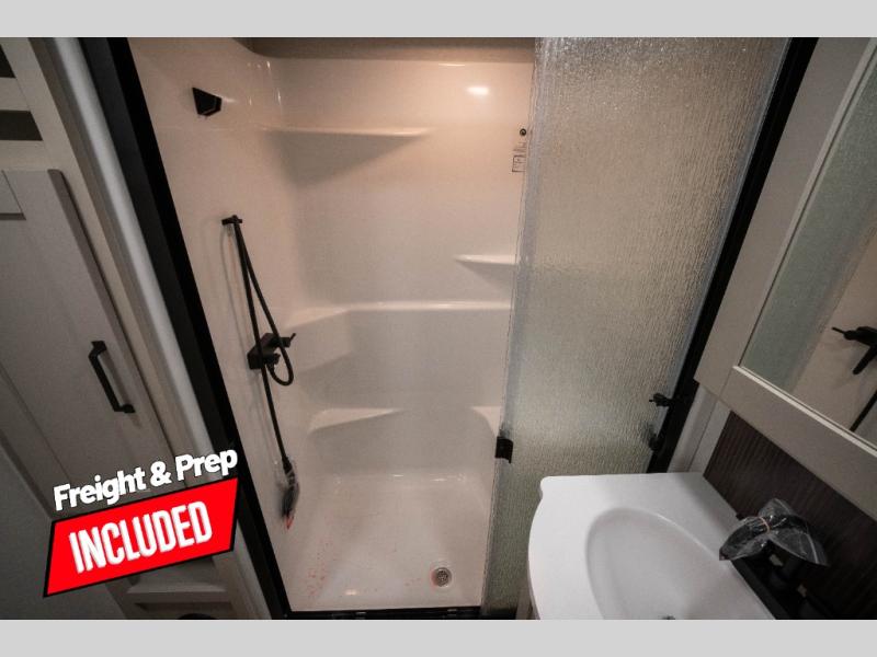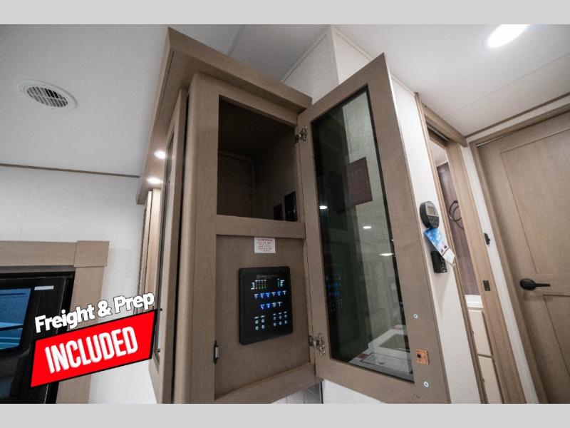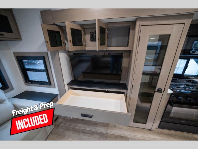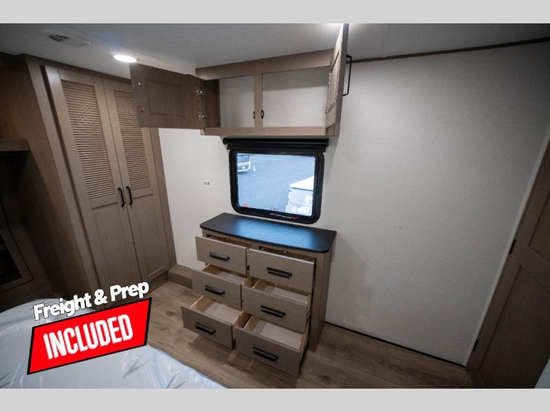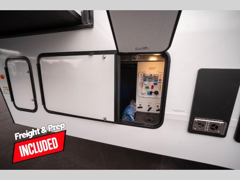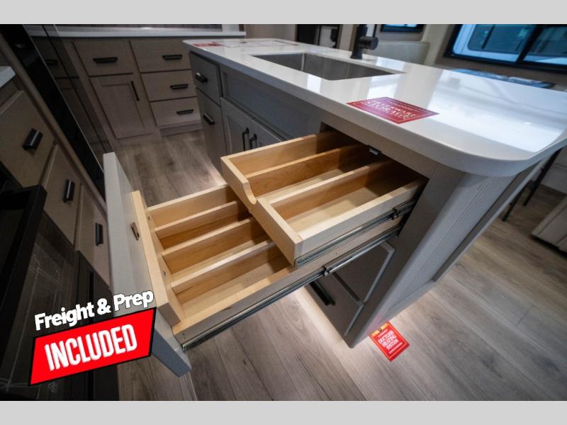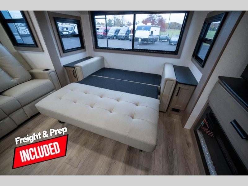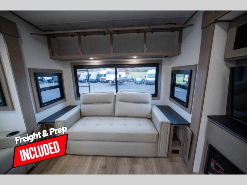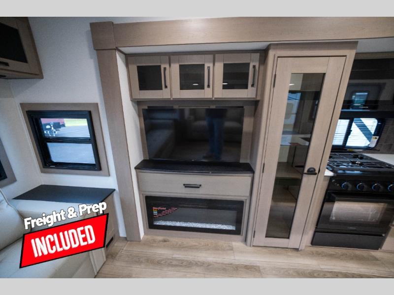You can enjoy a spacious rear living area in this RV with dual opposing slides offering you entertainment, kitchen amenities, seating and windows for great views! The rear tri-fold sofa also converts into extra sleeping space for an extra guest or two, just like the booth dinette does. Yet you might like to add the swivel dinette option. There are theater seats to enjoy while you place your drinks in the cupholders and watch the entertainment center with a 40" LED HDTV and fireplace. The pantry is big enough to store your favorite snacks, and the kitchen island will make meal prepping easier, plus there is a 16 cu. ft. refrigerator to store any leftovers. The full bathroom has a 30" x 48" fiberglass shower and a linen closet to store your towels. The front private bedroom has a comfortable queen bed slide that can be switched out for the optional king bed, a dresser with overhead cabinets, and a full wall wardrobe that is prepped to add the optional washer and dryer so that you can extend your camping trip with clean clothes!