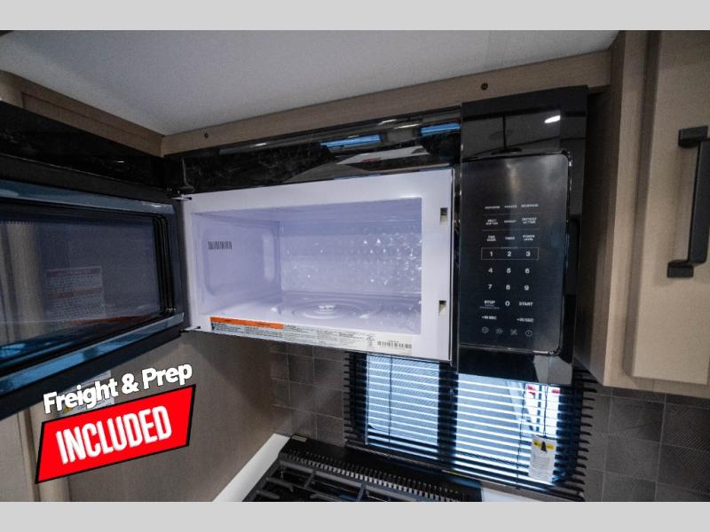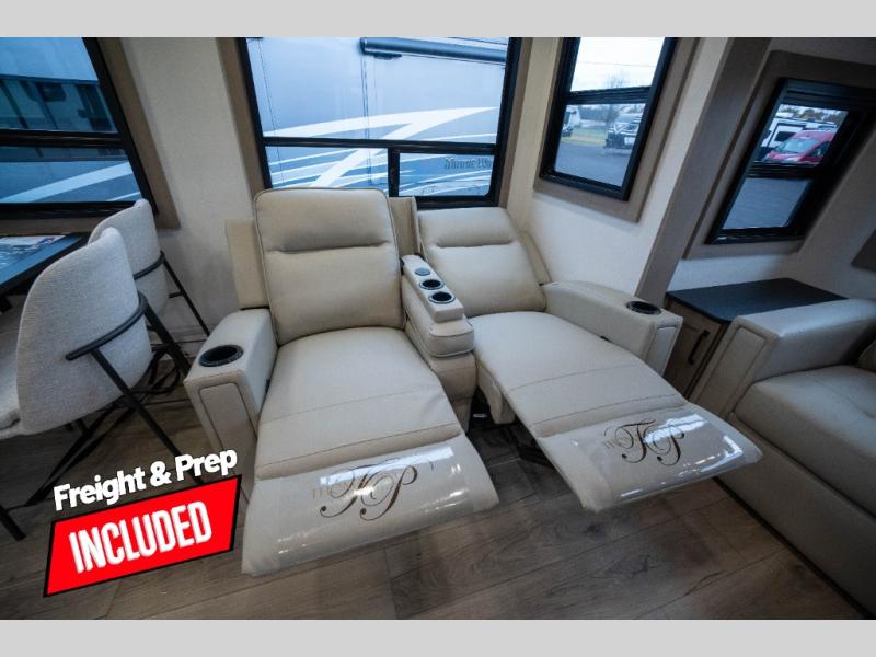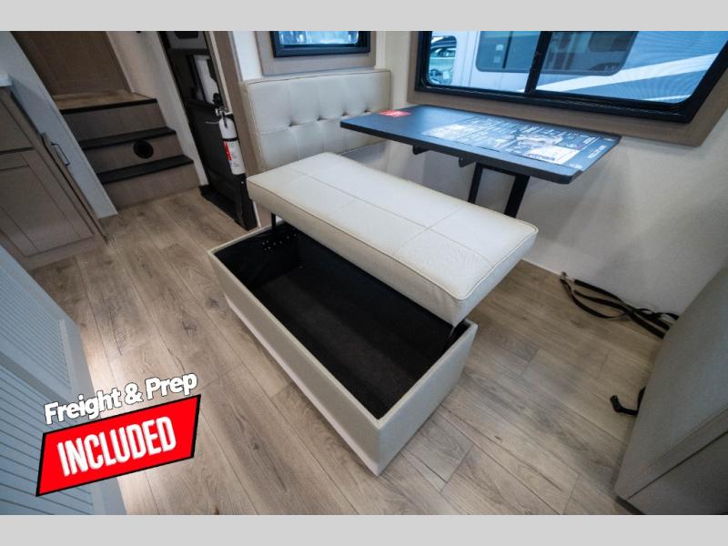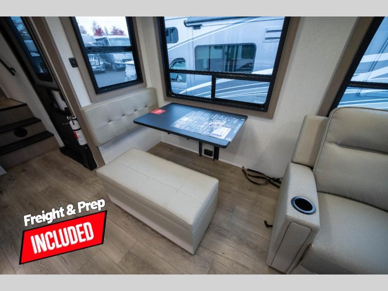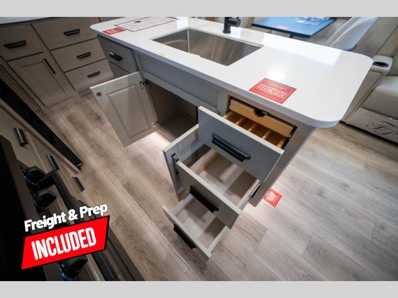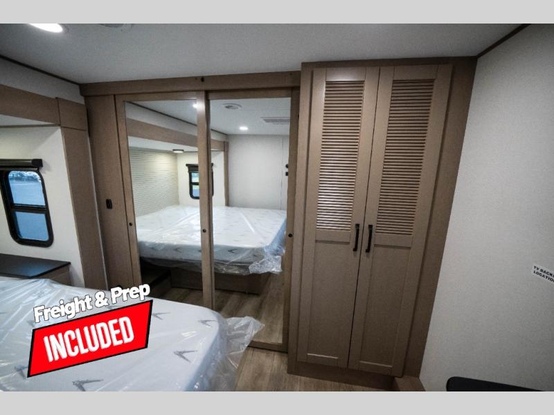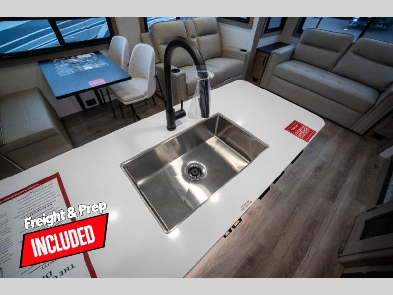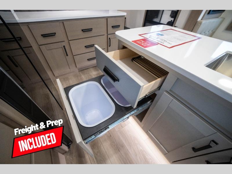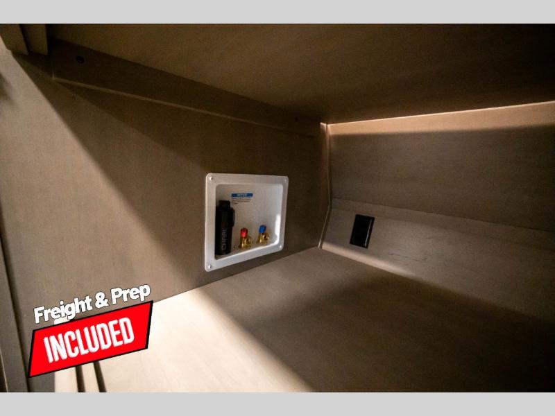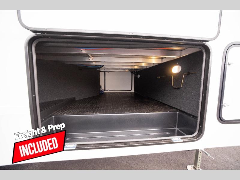 You can enjoy a spacious rear living area in this RV with dual opposing slides offering you entertainment, kitchen amenities, seating and windows for great views! The rear tri-fold sofa also converts into extra sleeping space for an extra guest or two, just like the booth dinette does. Yet you might like to add the swivel dinette option. There are theater seats to enjoy while you place your drinks in the cupholders and watch the entertainment center with a 40" LED HDTV and fireplace. The pantry is big enough to store your favorite snacks, and the kitchen island will make meal prepping easier, plus there is a 16 cu. ft. refrigerator to store any leftovers. The full bathroom has a 30" x 48" fiberglass shower and a linen closet to store your towels. The front private bedroom has a comfortable queen bed slide that can be switched out for the optional king bed, a dresser with overhead cabinets, and a full wall wardrobe that is prepped to add the optional washer and dryer so that you can extend your camping trip with clean clothes!