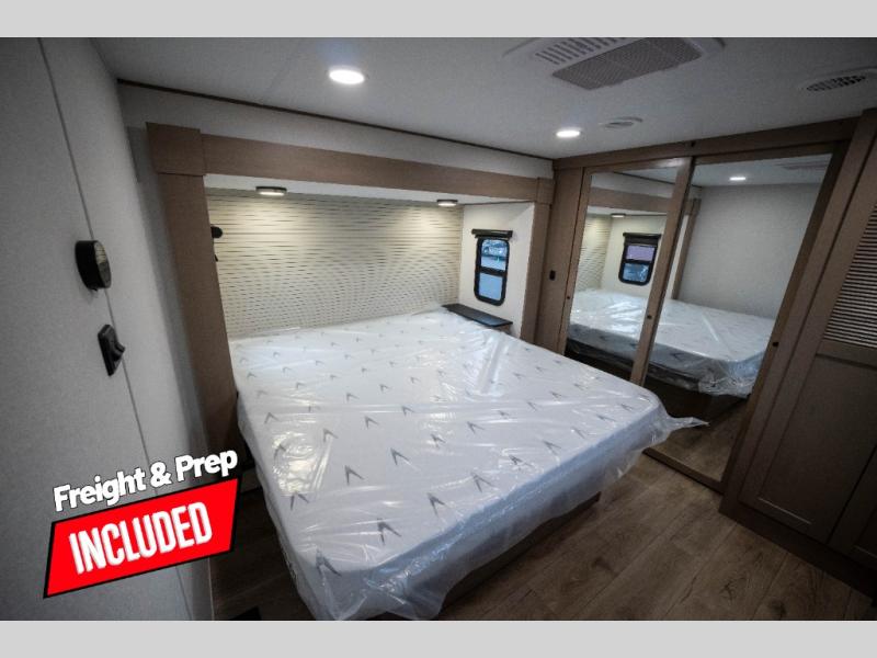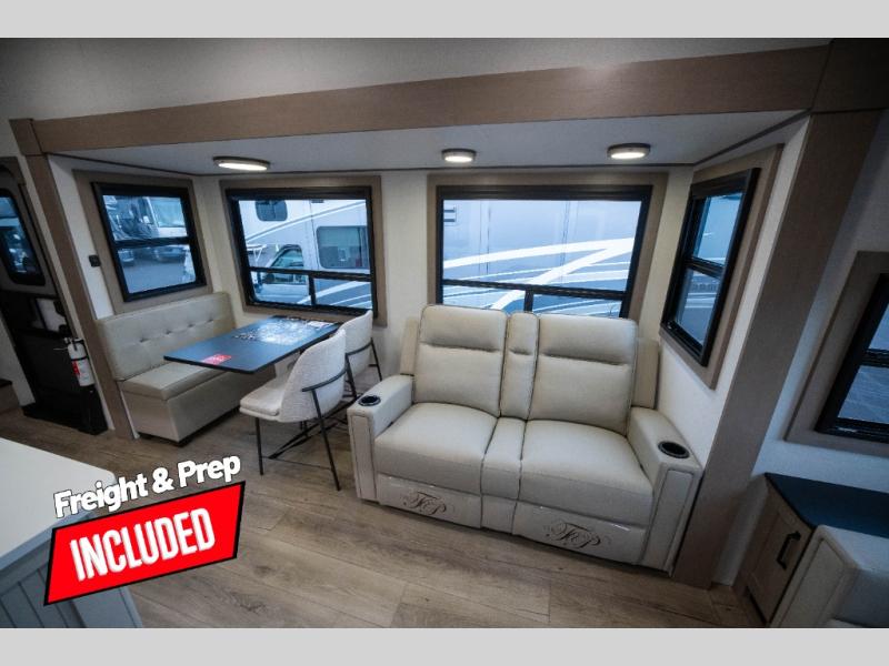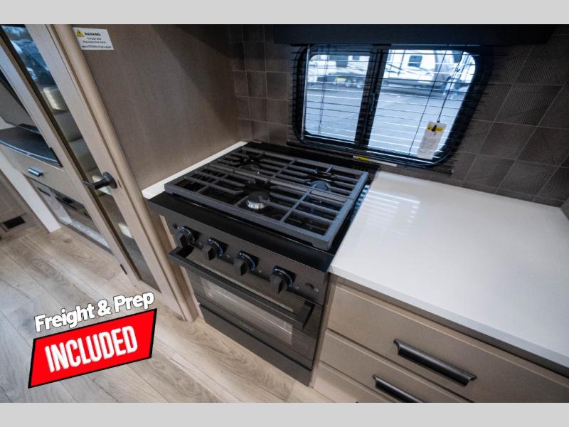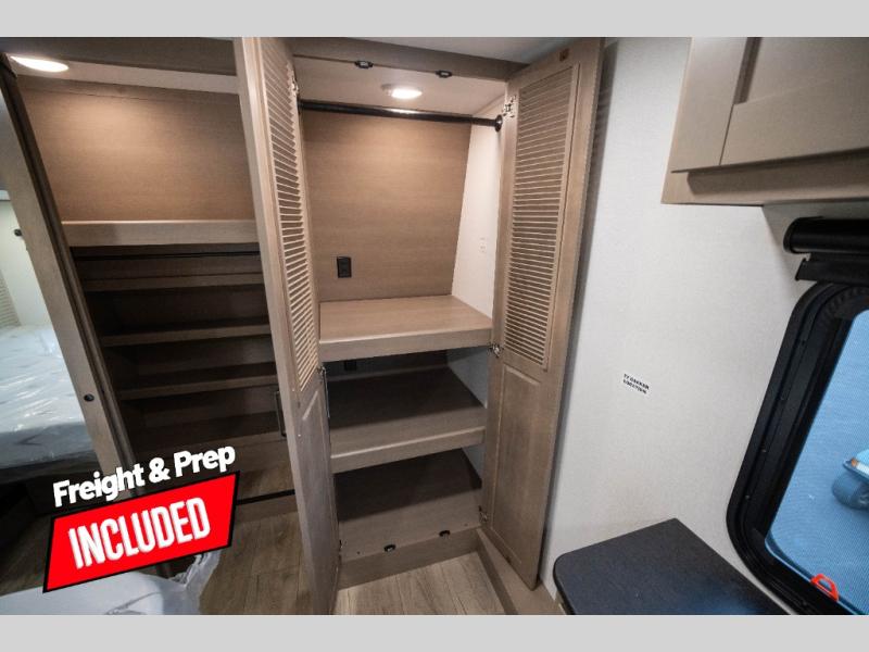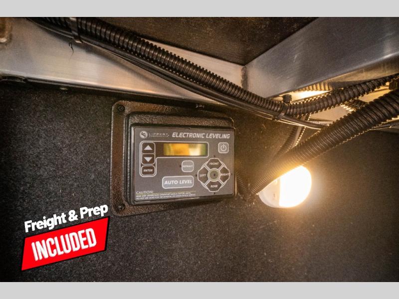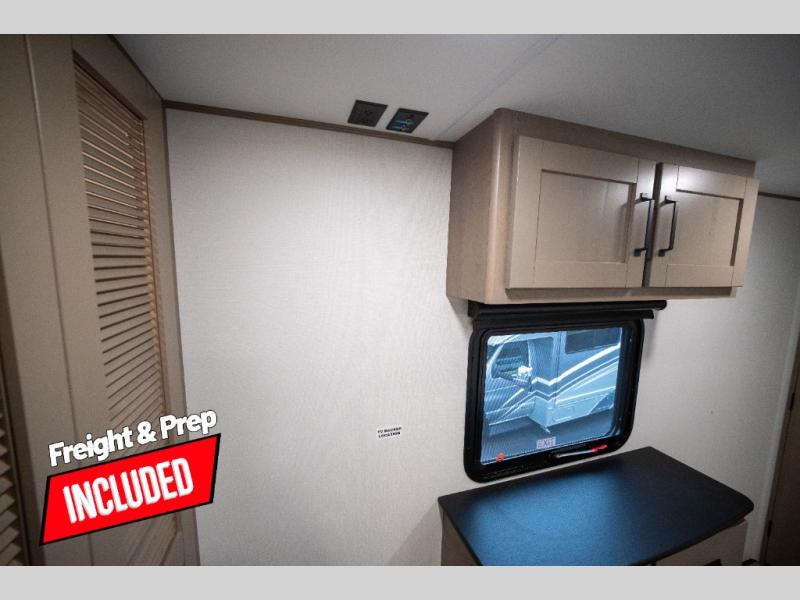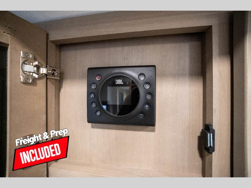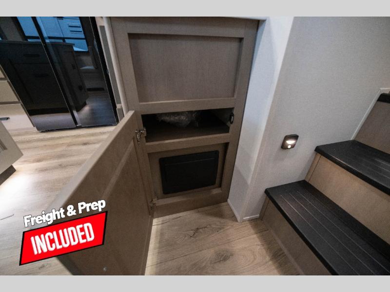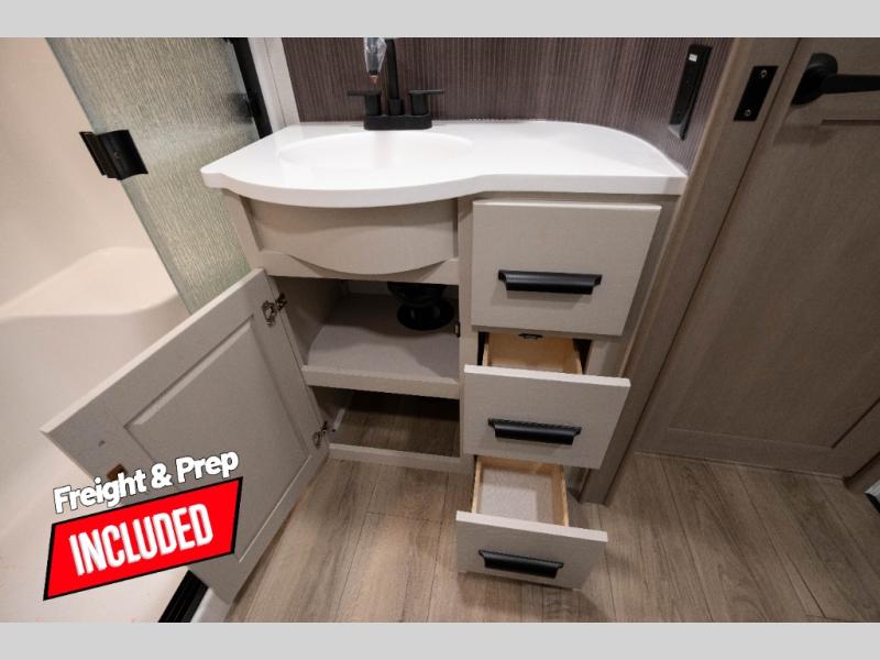 You can enjoy a spacious rear living area in this RV with dual opposing slides offering you entertainment, kitchen amenities, seating and windows for great views! The rear tri-fold sofa also converts into extra sleeping space for an extra guest or two, just like the booth dinette does. Yet you might like to add the swivel dinette option. There are theater seats to enjoy while you place your drinks in the cupholders and watch the entertainment center with a 40" LED HDTV and fireplace. The pantry is big enough to store your favorite snacks, and the kitchen island will make meal prepping easier, plus there is a 16 cu. ft. refrigerator to store any leftovers. The full bathroom has a 30" x 48" fiberglass shower and a linen closet to store your towels. The front private bedroom has a comfortable queen bed slide that can be switched out for the optional king bed, a dresser with overhead cabinets, and a full wall wardrobe that is prepped to add the optional washer and dryer so that you can extend your camping trip with clean clothes!
