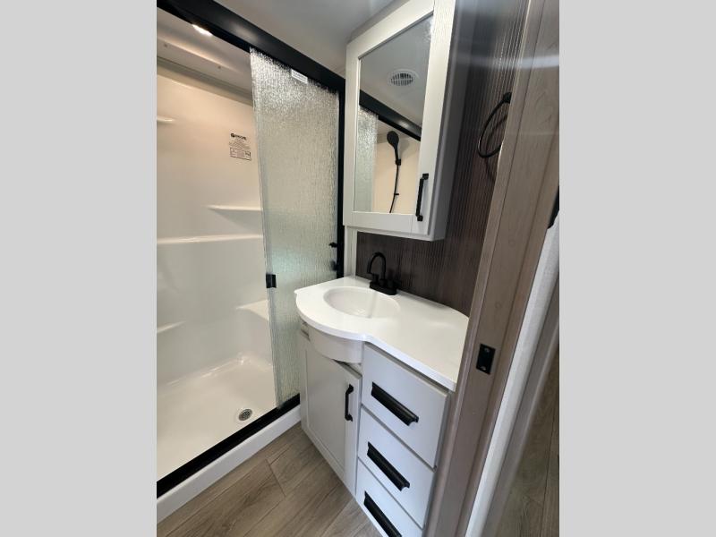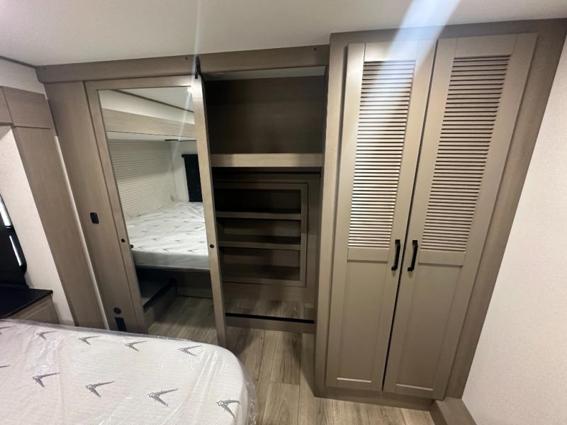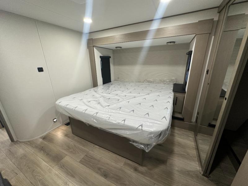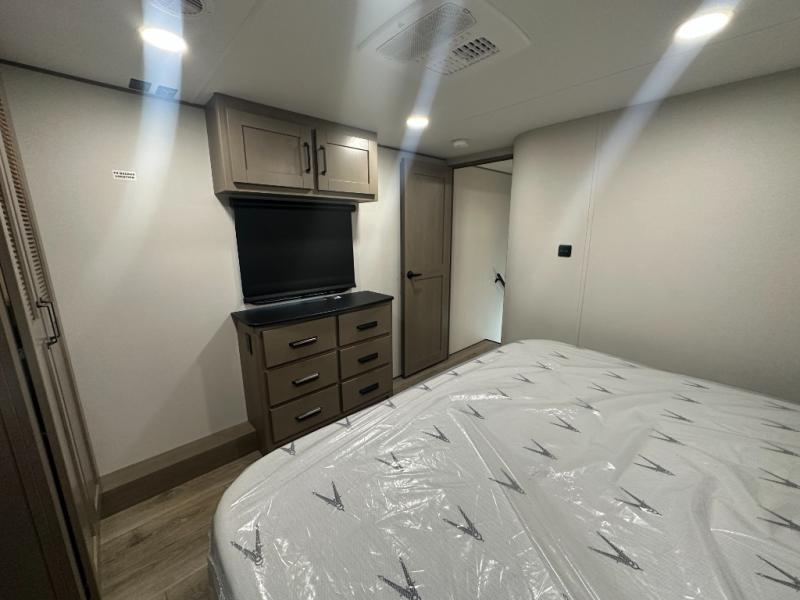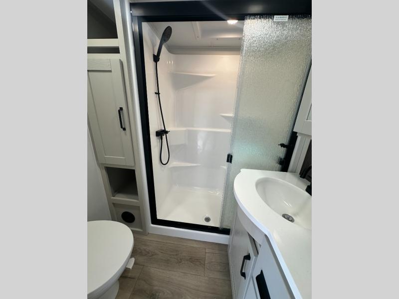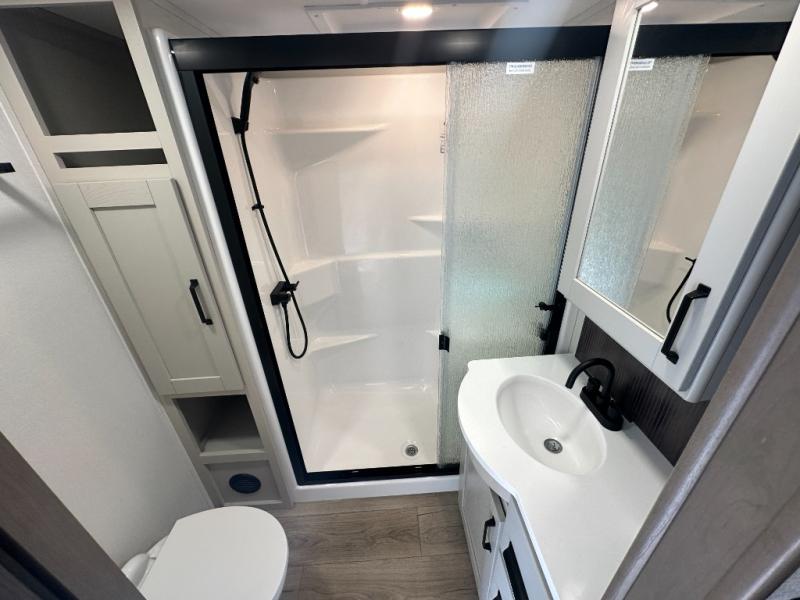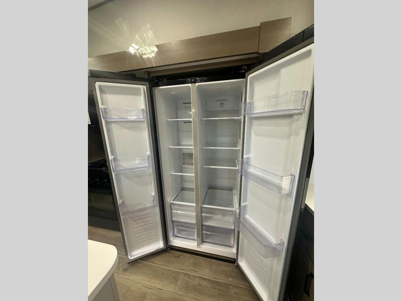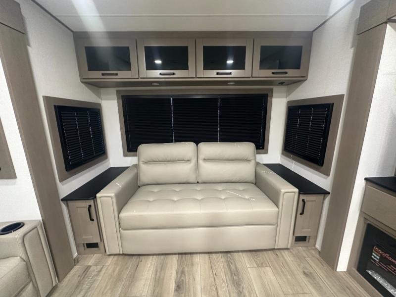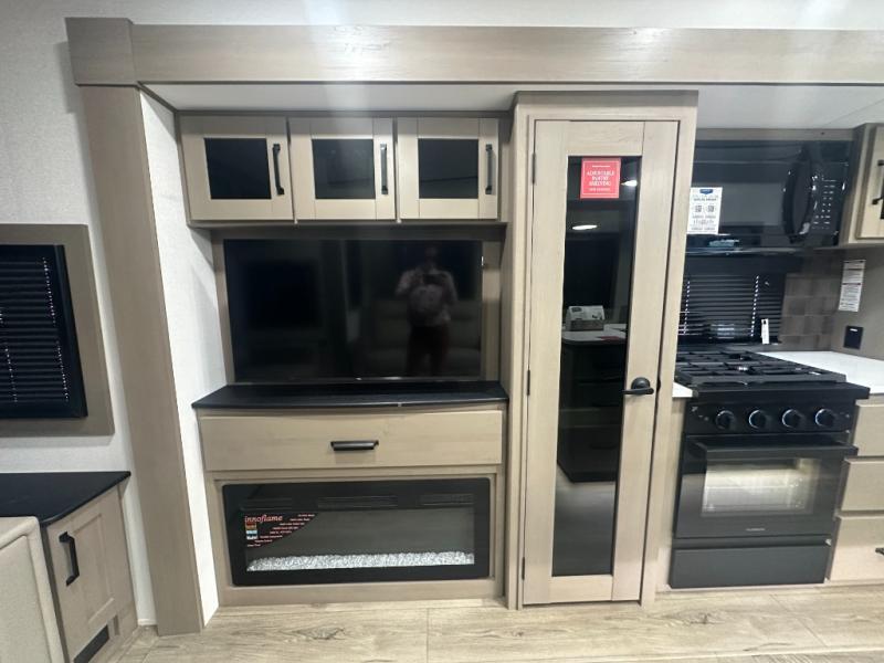 You can enjoy a spacious rear living area in this RV with dual opposing slides offering you entertainment, kitchen amenities, seating and windows for great views! The rear tri-fold sofa also converts into extra sleeping space for an extra guest or two, just like the booth dinette does. Yet you might like to add the swivel dinette option. There are theater seats to enjoy while you place your drinks in the cupholders and watch the entertainment center with a 40" LED HDTV and fireplace. The pantry is big enough to store your favorite snacks, and the kitchen island will make meal prepping easier, plus there is a 16 cu. ft. refrigerator to store any leftovers. The full bathroom has a 30" x 48" fiberglass shower and a linen closet to store your towels. The front private bedroom has a comfortable queen bed slide that can be switched out for the optional king bed, a dresser with overhead cabinets, and a full wall wardrobe that is prepped to add the optional washer and dryer so that you can extend your camping trip with clean clothes!