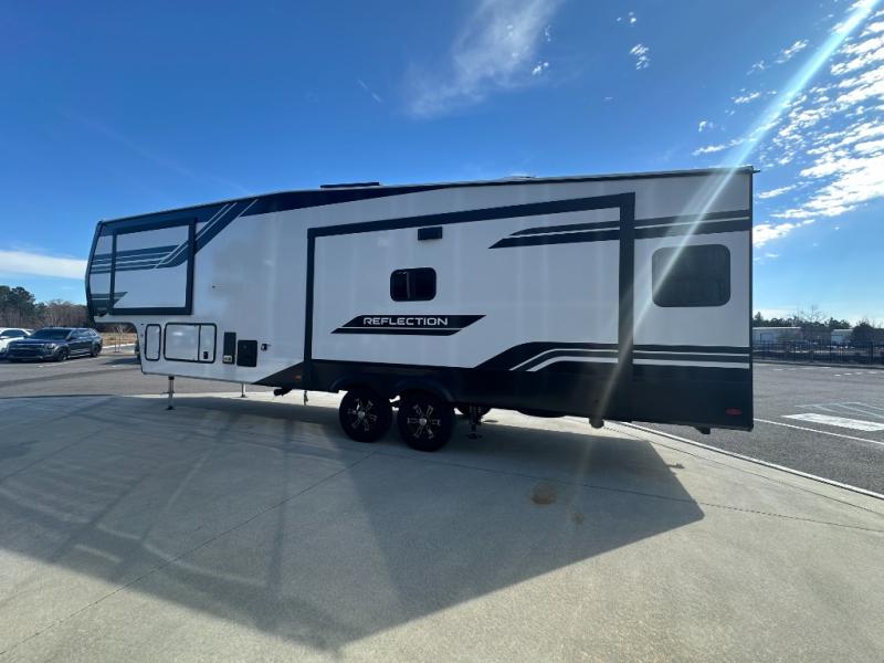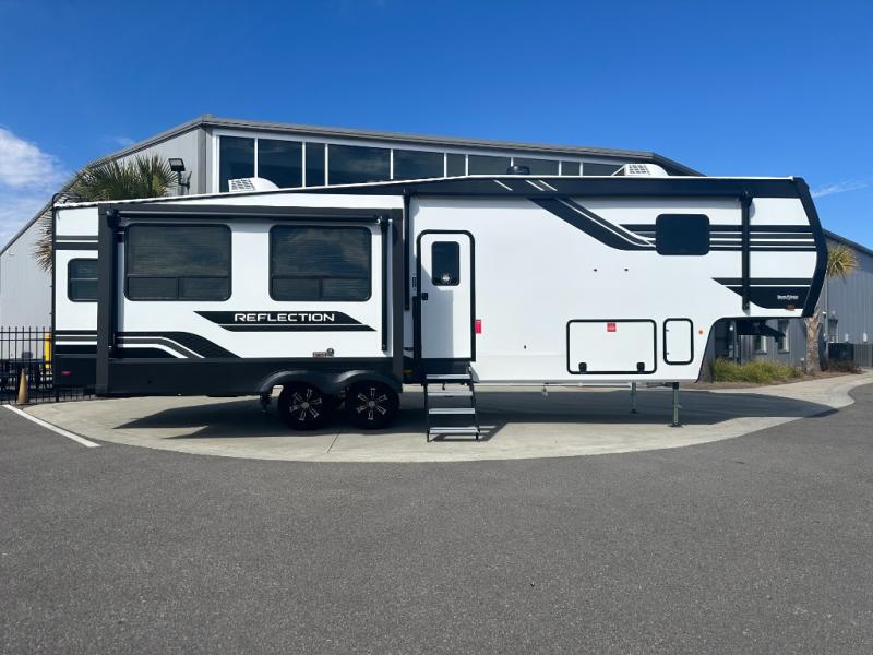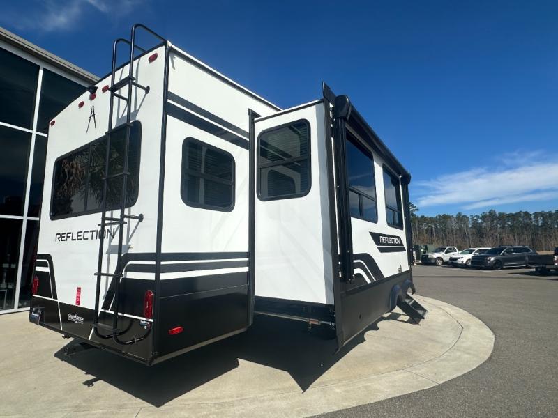 With any Reflection fifth wheel by Grand Design, you will have a solar panel for off-grid camping and a 60 amp charge controller and inverter prep, a Universal All-In-One docking station, unobstructed pass-through storage, and Goodyear Endurance tires. Each is constructed of gel coat exterior sidewalls, residential 5" truss rafters, walk-on roof decking, a fiberglass and radiant foil roof and front cap insulation plus laminated aluminum framed side walls, roof and end walls in slide rooms. Head inside to enjoy residential hardwood cabinet doors, premium Congoleum flooring, a spacious shower with a glass door, and many more comforts!