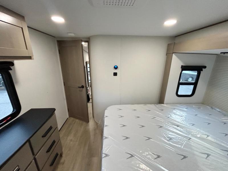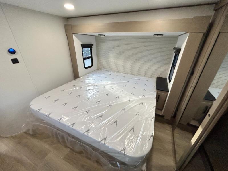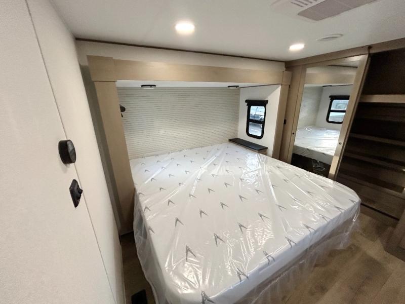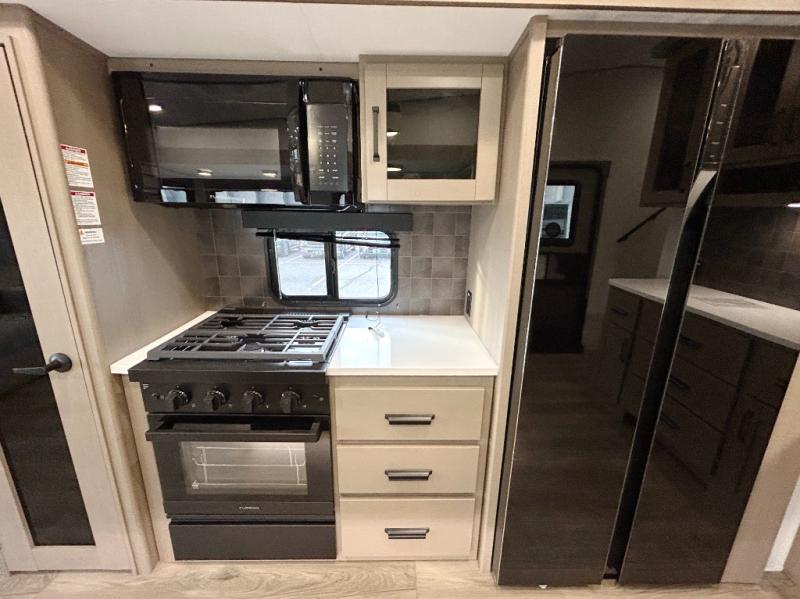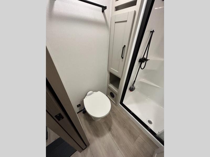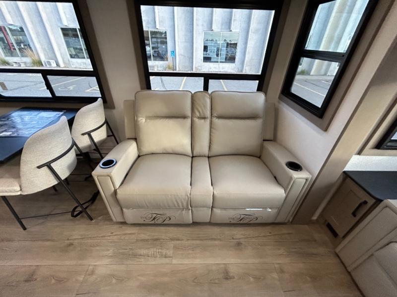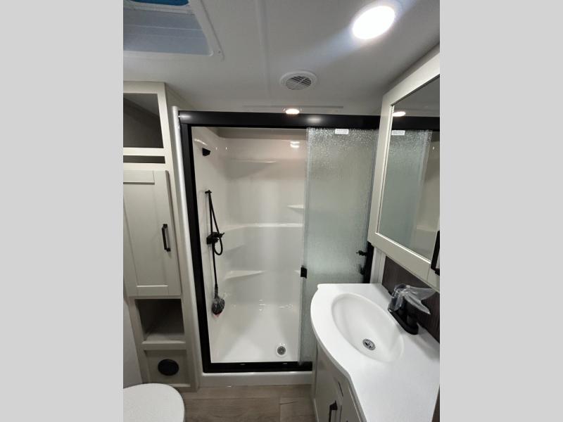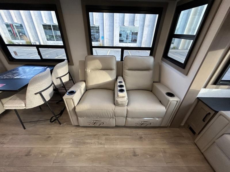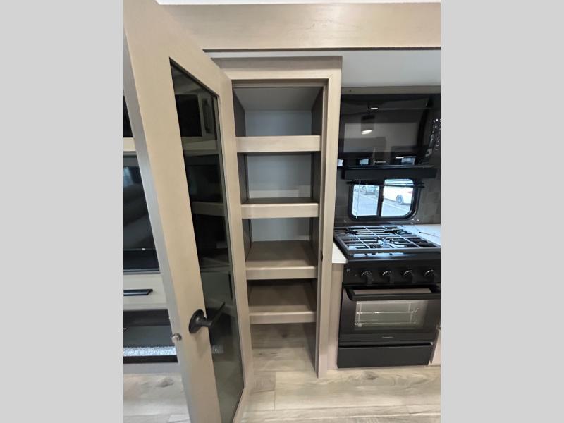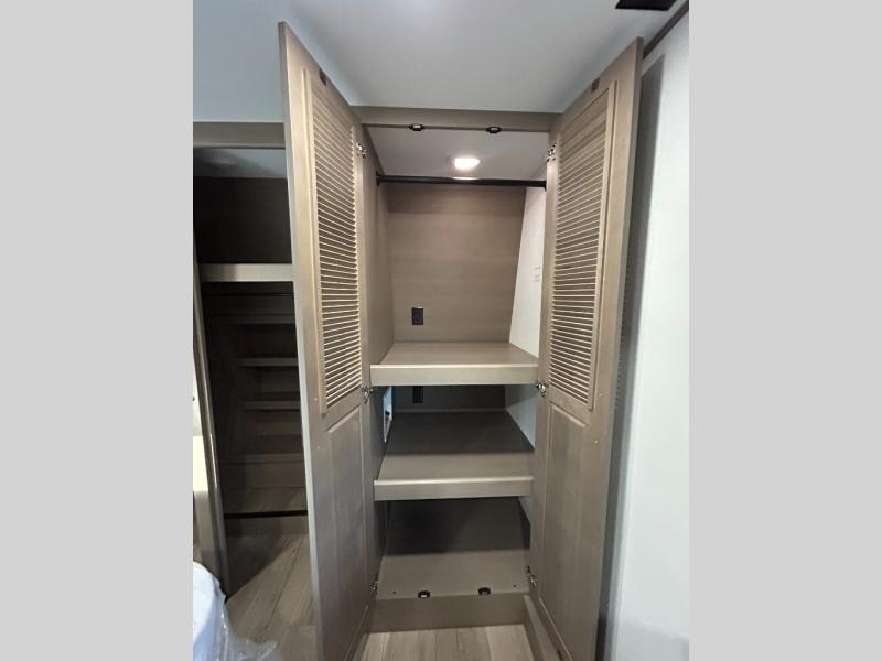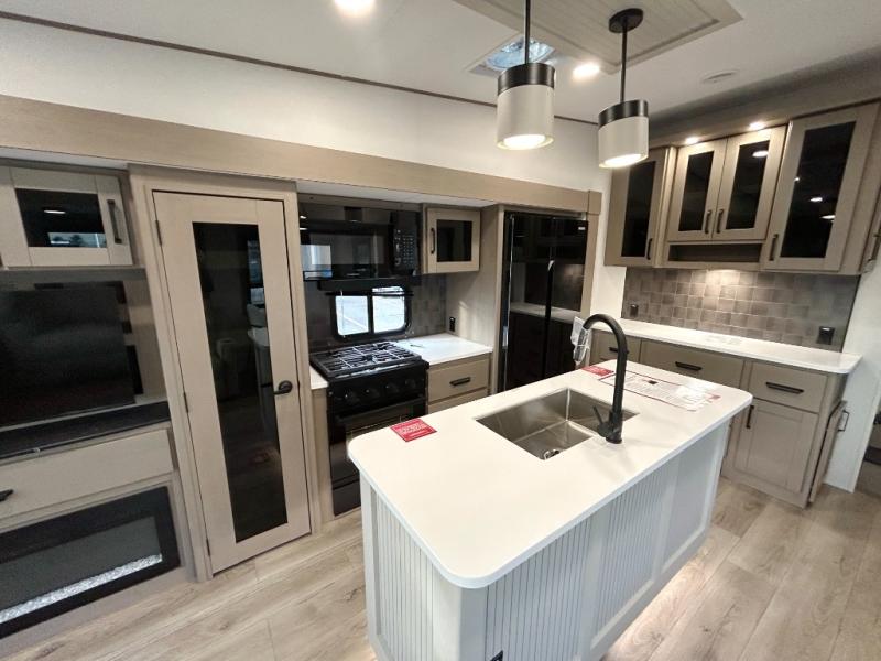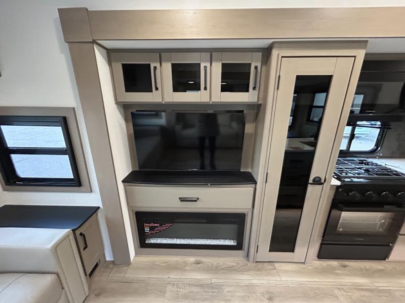 You can enjoy a spacious rear living area in this RV with dual opposing slides offering you entertainment, kitchen amenities, seating and windows for great views! The rear tri-fold sofa also converts into extra sleeping space for an extra guest or two, just like the booth dinette does. Yet you might like to add the swivel dinette option. There are theater seats to enjoy while you place your drinks in the cupholders and watch the entertainment center with a 40" LED HDTV and fireplace. The pantry is big enough to store your favorite snacks, and the kitchen island will make meal prepping easier, plus there is a 16 cu. ft. refrigerator to store any leftovers. The full bathroom has a 30" x 48" fiberglass shower and a linen closet to store your towels. The front private bedroom has a comfortable queen bed slide that can be switched out for the optional king bed, a dresser with overhead cabinets, and a full wall wardrobe that is prepped to add the optional washer and dryer so that you can extend your camping trip with clean clothes!