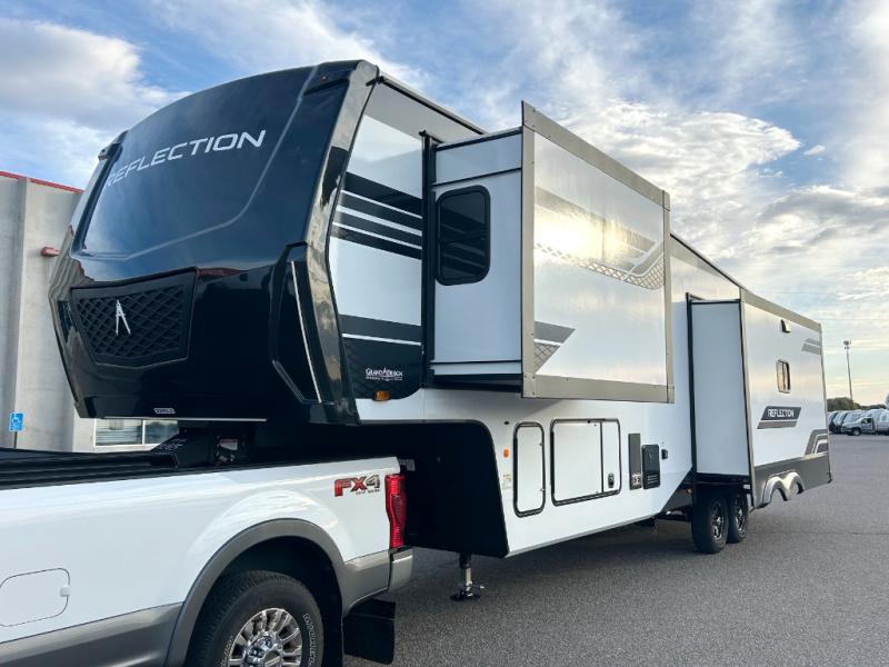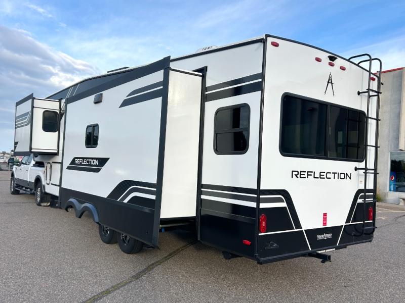With any Reflection fifth wheel by Grand Design, you will have a solar panel for off-grid camping and a 60 amp charge controller and inverter prep, a Universal All-In-One docking station, unobstructed pass-through storage, and Goodyear Endurance tires. Each is constructed of gel coat exterior sidewalls, residential 5" truss rafters, walk-on roof decking, a fiberglass and radiant foil roof and front cap insulation plus laminated aluminum framed side walls, roof and end walls in slide rooms. Head inside to enjoy residential hardwood cabinet doors, premium Congoleum flooring, a spacious shower with a glass door, and many more comforts!