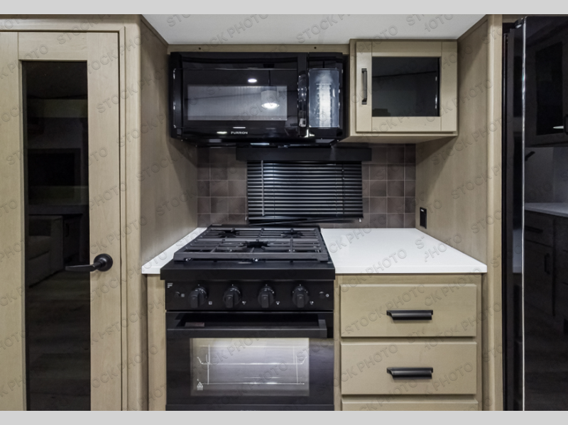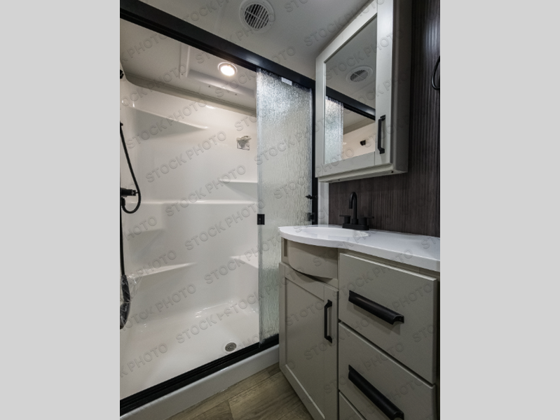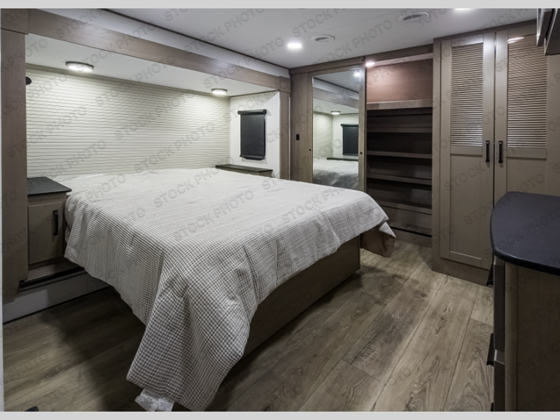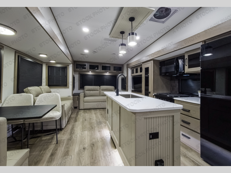 You can enjoy a spacious rear living area in this RV with dual opposing slides offering you entertainment, kitchen amenities, seating and windows for great views! The rear tri-fold sofa also converts into extra sleeping space for an extra guest or two, just like the booth dinette does. Yet you might like to add the swivel dinette option. There are theater seats to enjoy while you place your drinks in the cupholders and watch the entertainment center with a 40" LED HDTV and fireplace. The pantry is big enough to store your favorite snacks, and the kitchen island will make meal prepping easier, plus there is a 16-cu. ft. refrigerator to store any leftovers. The full bathroom has a 30" x 48" fiberglass shower and a linen closet to store your towels. The front private bedroom has a comfortable queen bed slide that can be switched out for the optional king bed, a dresser with overhead cabinets, and a full wall wardrobe that is prepped to add the optional washer!
