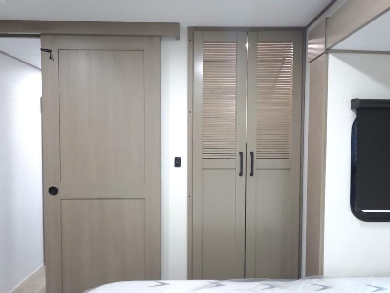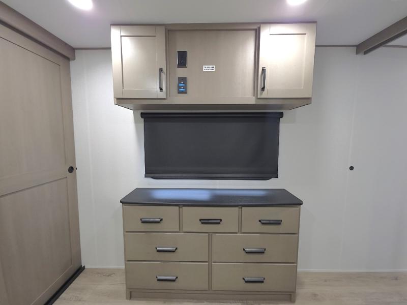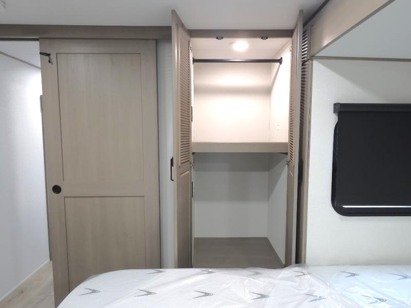 Private Front Bedroom: Includes a queen bed slide-out, large front closet, TV prep, and washer/dryer prep for extended stay convenience.