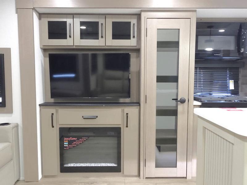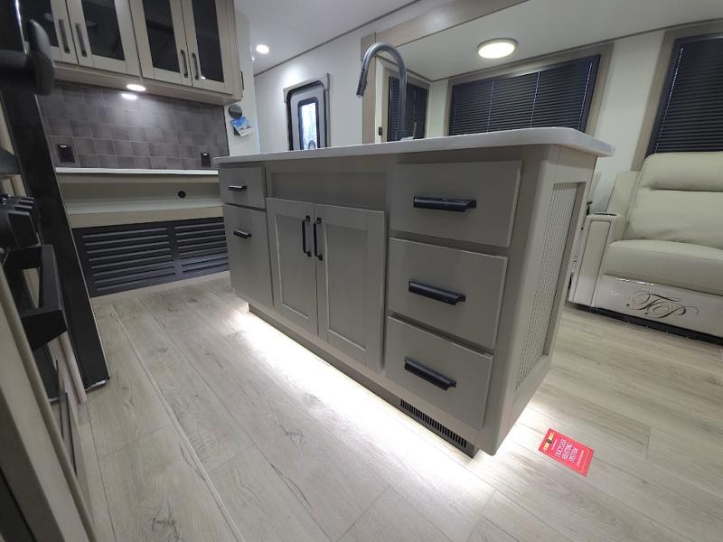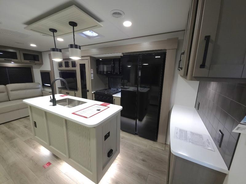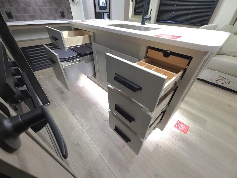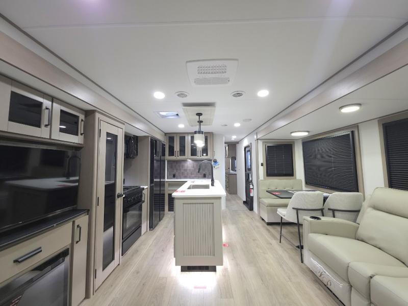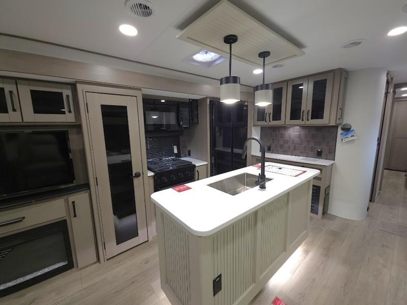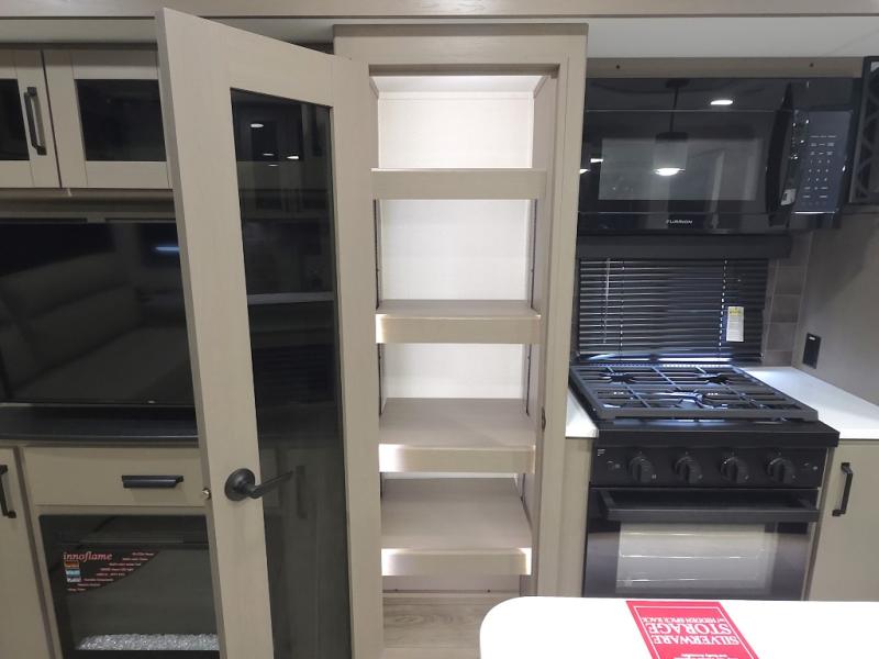 Chef-Inspired Kitchen: A spacious kitchen island provides extra prep space, while a 16 cu. ft. 12V refrigerator, pantry, and booth dinette (optional swivel dinette available) support both meal prep and entertaining.