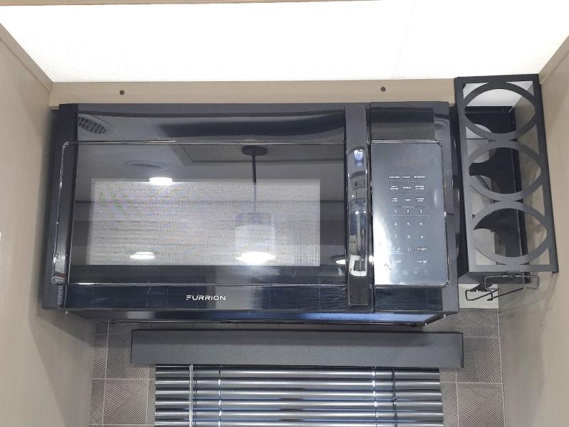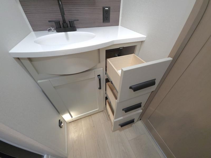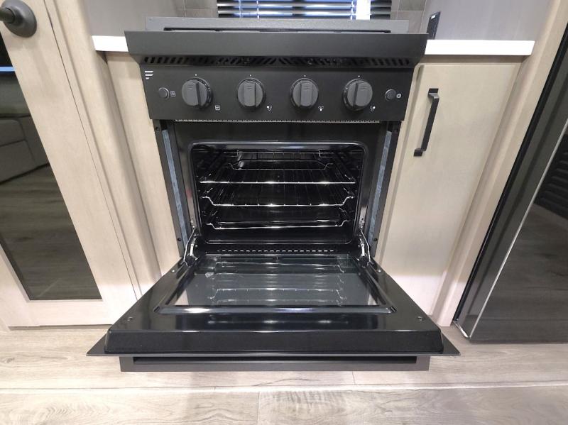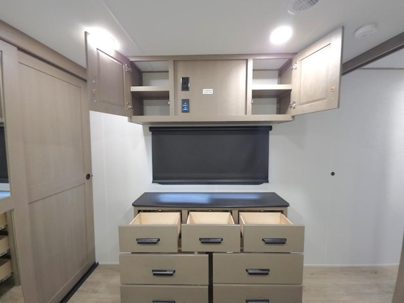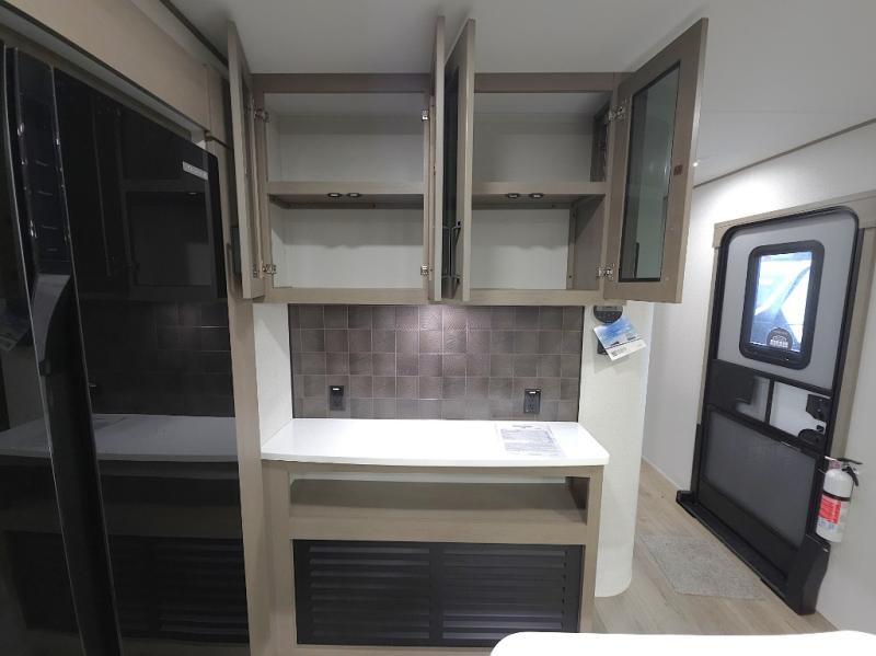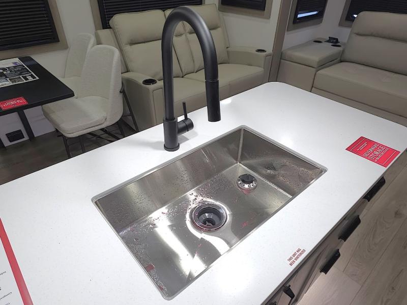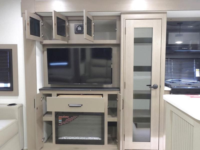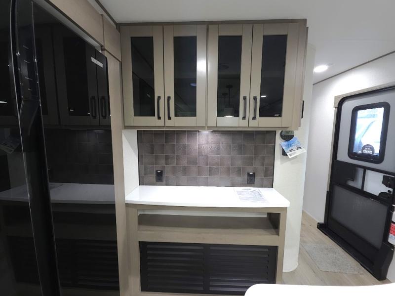 Chef-Inspired Kitchen: A spacious kitchen island provides extra prep space, while a 16 cu. ft. 12V refrigerator, pantry, and booth dinette (optional swivel dinette available) support both meal prep and entertaining.